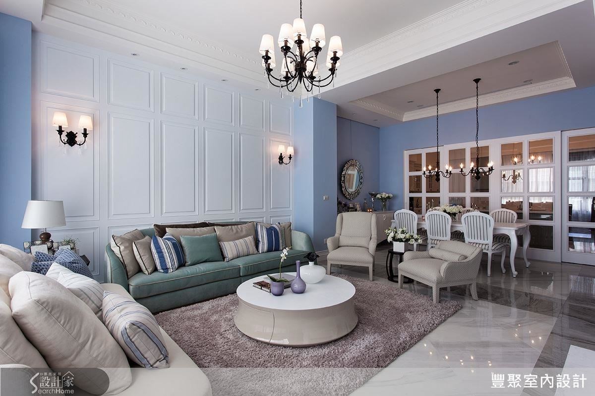 整体空间以柔美的颜色作为主色系,透过如浅灰蓝、淡紫或湖水绿,藉此提升精致感,家具、摆饰的色系也是精心挑选,传达出新古典的细腻情感。