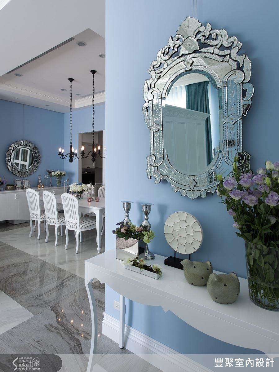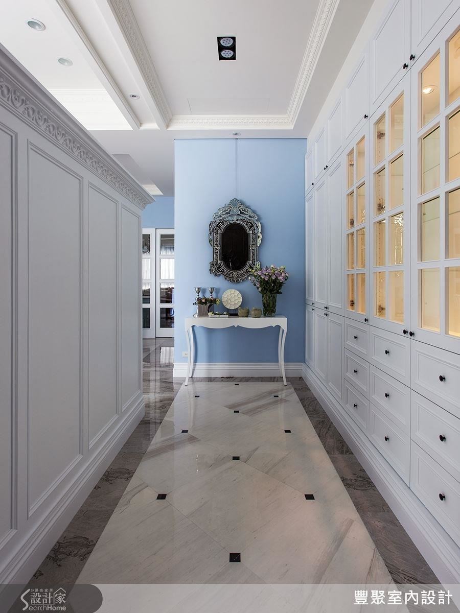 除此之外,玄关布置了浪漫华丽的镜面及摆件,让人一进门即留下典雅的印象;即使是鞋柜,也利用线板打造结合展示及收纳的柜体,勾勒古典气息。