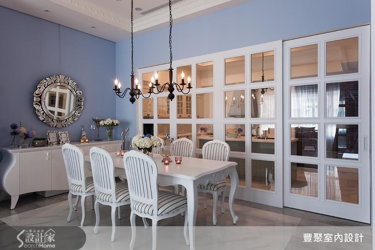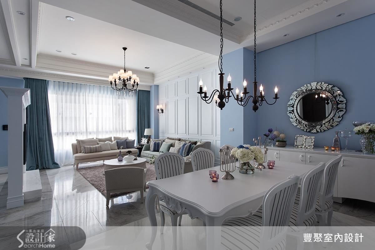 比如开放式的客餐厅,采用清新浪漫的灰蓝色墙面及白色线板设计,搭配上风格素雅、不过份华丽的风格家具,巧妙地重现了欧风古典的春日居家美感。至于厨房,则以白色玻璃窗格为隔断,除创造色彩鲜明的律动感,当阳光洒入,悠闲的纾压感便散布屋内。