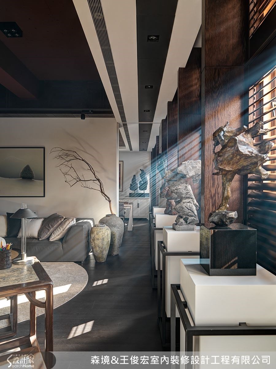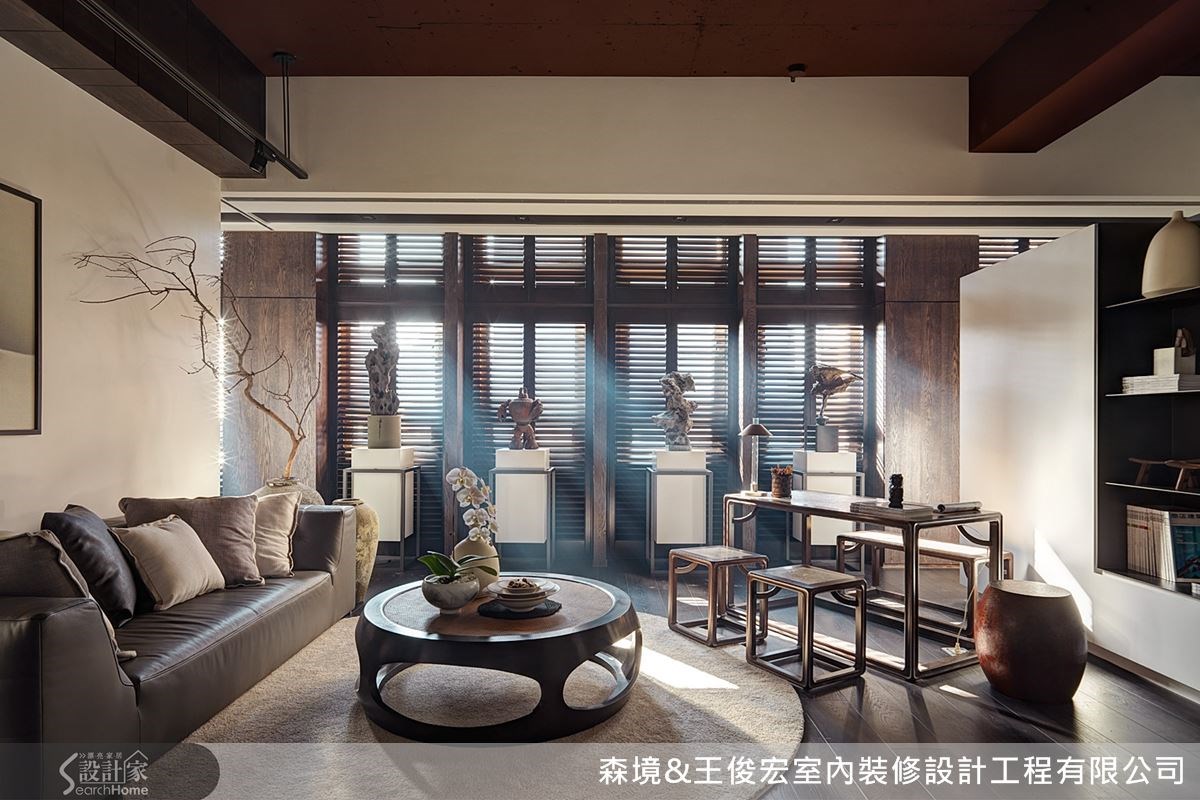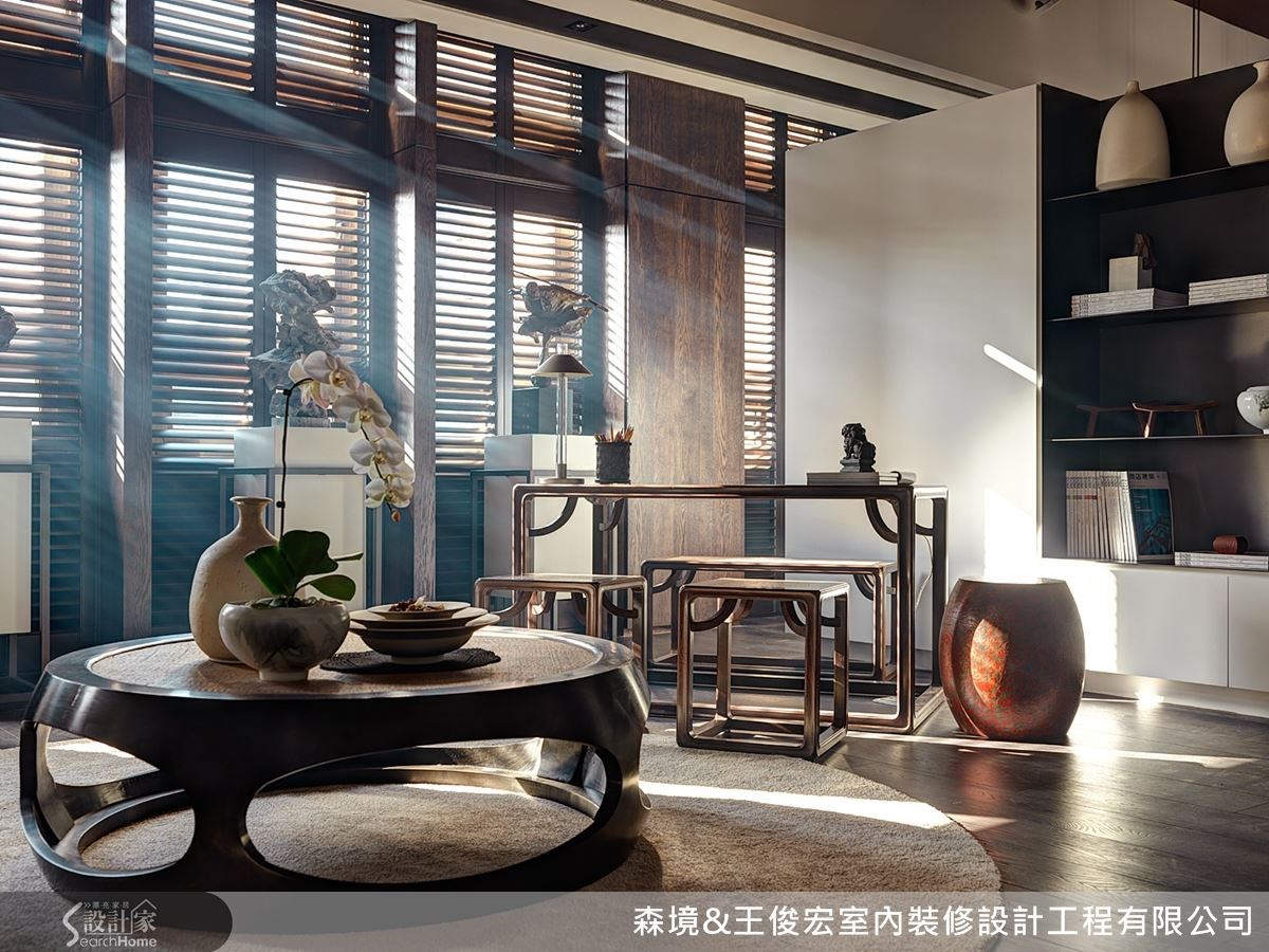 不仅家具配置到位,天花、墙面的设计也要随之映衬。而窗户也可说是空间的一景,特意加厚窗棂,运用木百叶遮掩原有的现代铁窗,创造出片片疏落的光影。中间再加上隔板,区划装饰品的位置,形成如艺廊般的优雅景致。