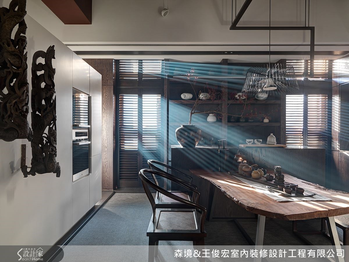 巧妙在柜体嵌入现代化的电器设备,另一侧则设置中式吧台,如茶艺空间般布置骨董陶瓮。中央则摆上具历史感的实木长桌,搭配现代风的铁件桌脚,在充满复古怀旧的空间,让人感受新旧交融的韵味。