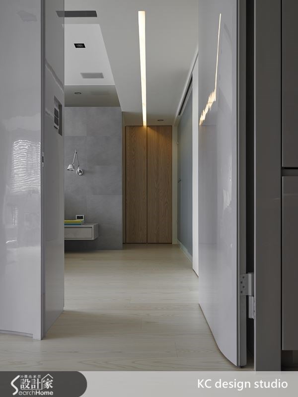 位于24楼的96平米老屋,坐拥美好的城市风景,但居宅平米数不算广阔,且采光较不优,于是设计师内缩客厅与主卧房的隔断墙,让公、私领域皆能享受到完整风景,并运用开放式格局增添明亮视感,同时,更注入了弧形量体设计,替居家勾勒出行云流水的唯美流线! 【闹中取静的唯美流线造型墙】设计师在内缩墙面、格局重整后,设计一面充满线条美感的墙体,串连起客厅、餐厨领域,并将电视墙视听柜与卧房门片收整于墙,形成完整的立面;餐厅配置木质中岛,形成视觉焦点,刻意让中岛与餐桌作出结合,变成上下有落差的台面,透过流畅造型产生视觉延伸感。【卧室结合更衣室的收纳需求】卧房位于客厅电视墙后方,以同一面量体创造双面电视墙,并在寝卧床头墙延续灰色调,嵌置两座金属床头灯,造就充满品味的生活质感,让休憩场域回归到放松本质,而床头后则保留一处通道,形成开放式更衣领域,在大容量的木作衣柜配置下,满足了居住者收纳需求! 【运用弹性拉门的开阖巧思设计】公领域透过弧形量体连贯了客厅、餐厨区,不仅如此,设计师还运用巧思注入弹性拉门,于电视墙角落保留通道;当关上门,可完美区隔公、私领域,打开门,即开创走入卧房的另一条动线,并使居家采亮度瞬间增加,而中间的通道也成了现成起居空间,充分运用每平米!