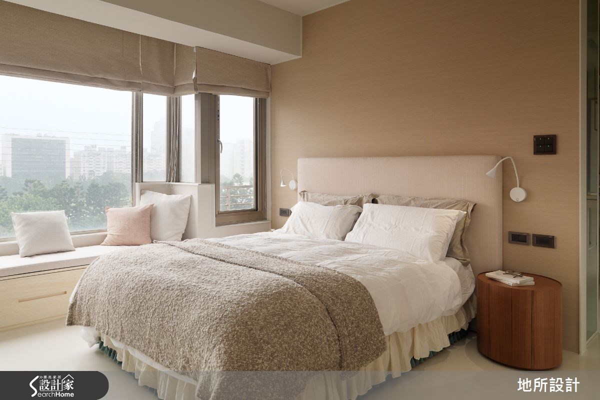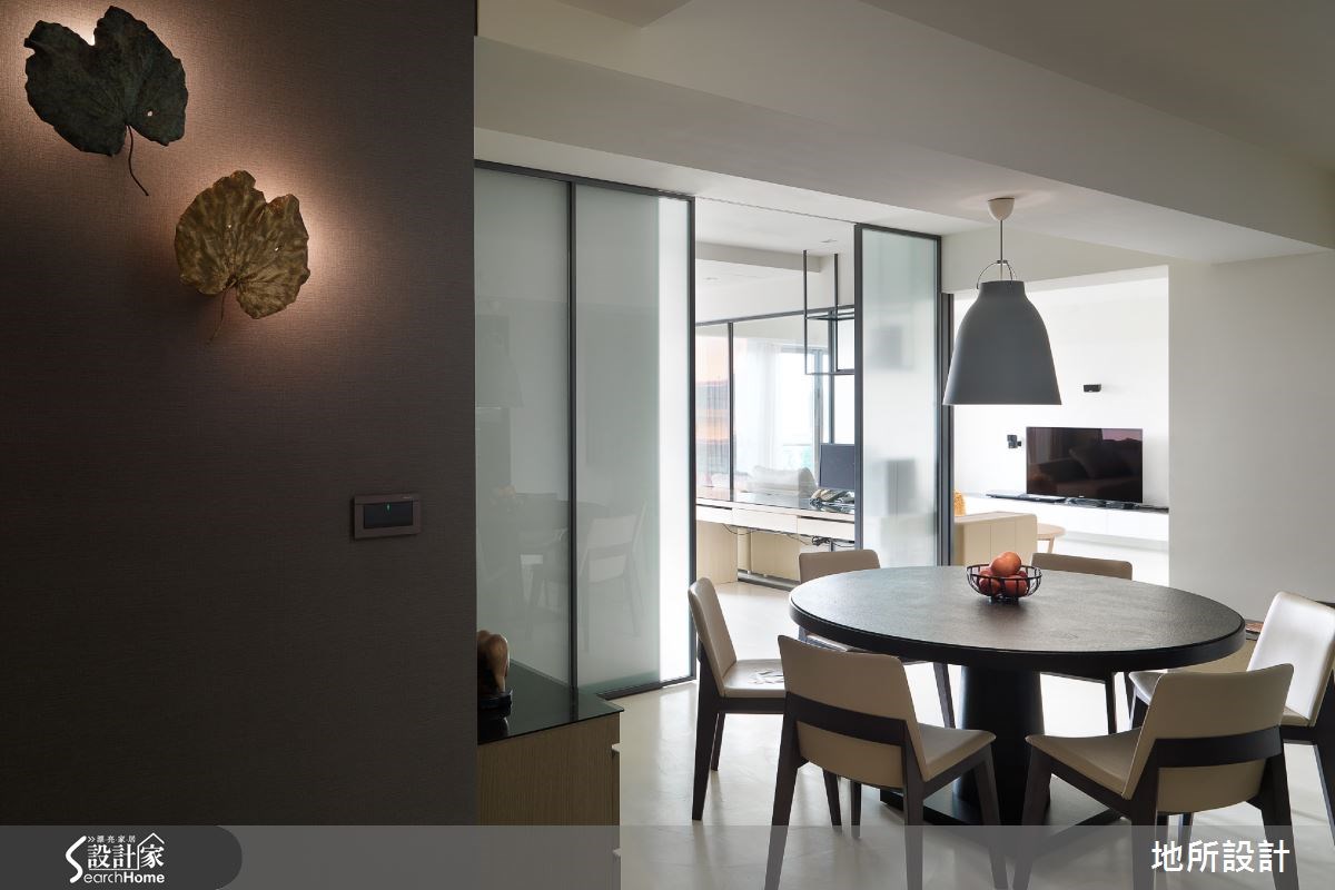 这间148平方米的老屋,有着老旧阴暗的问题。设计师拆除一面墙,替公领域注入通透延伸的空间感,并以白色作为室内基调,形成放松温暖的氛围。而户外引进的明媚采光,则成为居室内的美好风景。【玻璃隔断让采光更流通】设计师拆除客厅的一面实墙,化解空间隔阂感,并让居家产生通透延伸感,使窗外采光可无限流通;并在白色基调下,型塑明亮而宽敞的公领域。由于家中有毛小孩,地面刻意采用盘多魔,透过无缝的地面特性,让屋主更方便清理居家。电视墙则配置不落地视听柜,于白色背景上点缀黑色调,呈现极简的对比美感,而家具、家饰则呈现驼色与木色,再搭配落地窗外的绿意植栽,与户外风景形成契合画面。拆除的实墙改以玻璃作为隔断,划分出客厅后方的书房空间,书房内具充足而美好的采光,并拥有一大面书墙与悬吊展示铁架,满足书籍、物品的收纳需求;书房与餐厅之间采弹性通透推拉门做界定,餐厅与厨房之间则配置深色门片做区隔,切分出清爽无油烟的用餐领域。卧室显得淡雅自然,配置一处飘窗区,不仅让底座结合收纳空间,更于角落做出靠背设计,增添寝卧的舒适度;而卫浴空间也极富生活情趣,无论是可饱览景色的抿石子泡澡区,又或者宛如度假饭店般的洗手台设计,都让居家充满悠闲、放松的氛围。