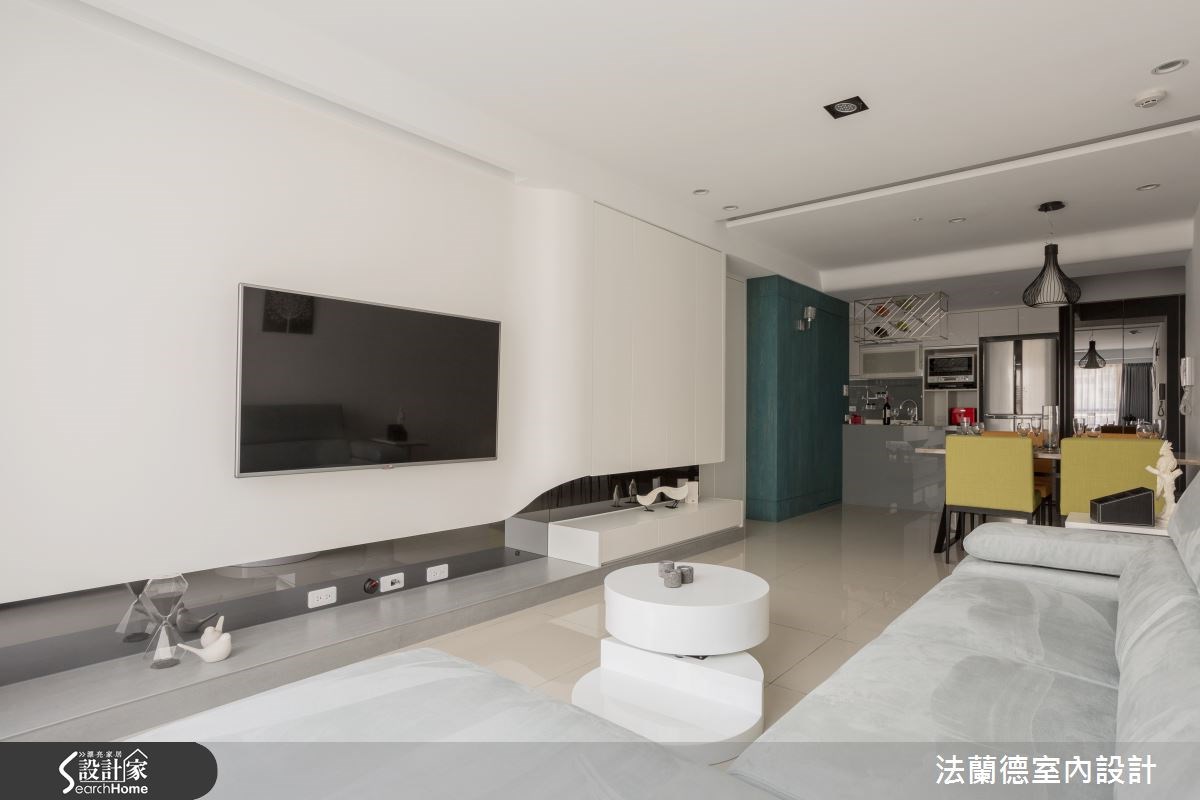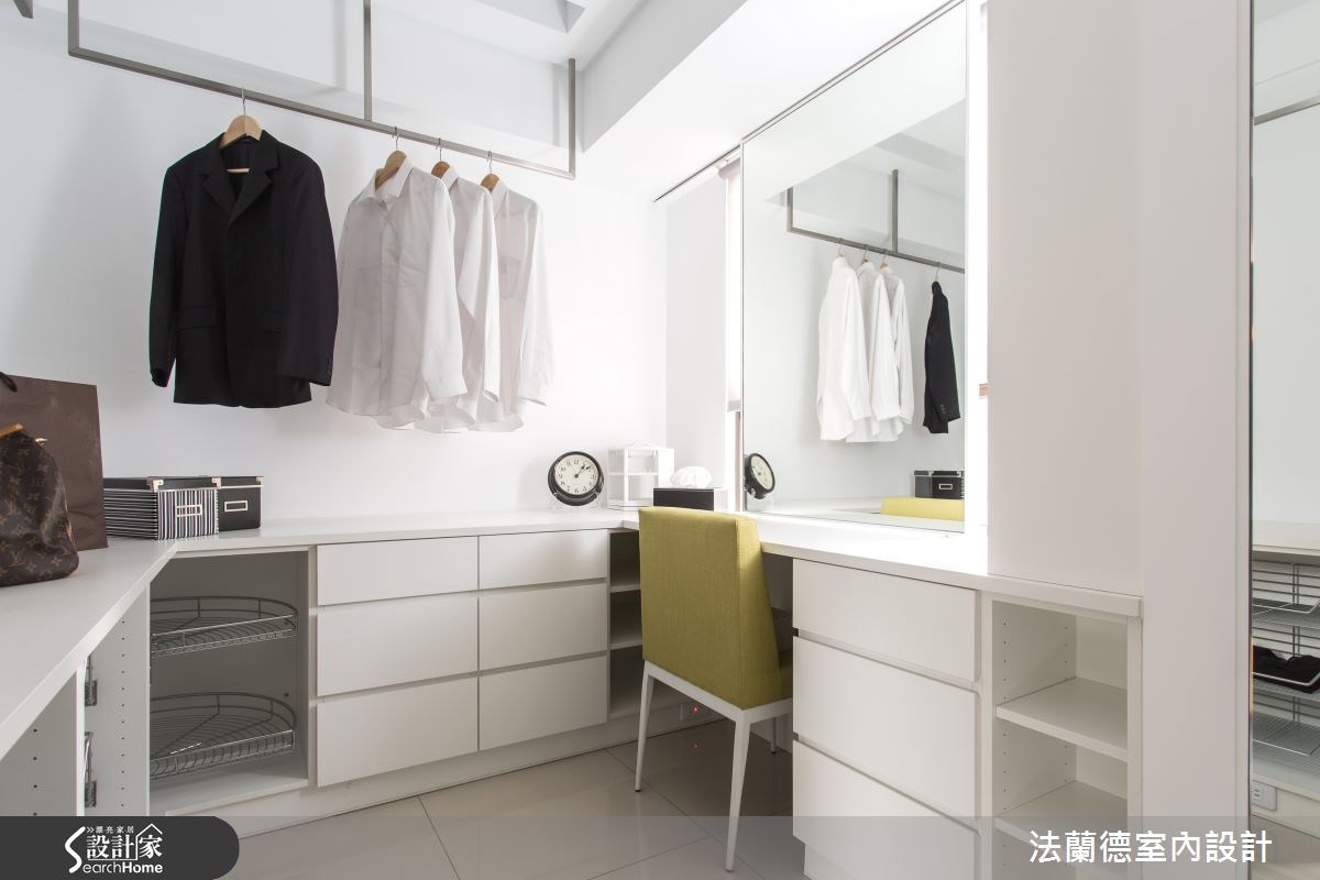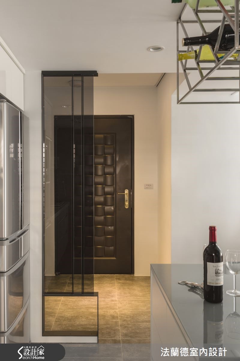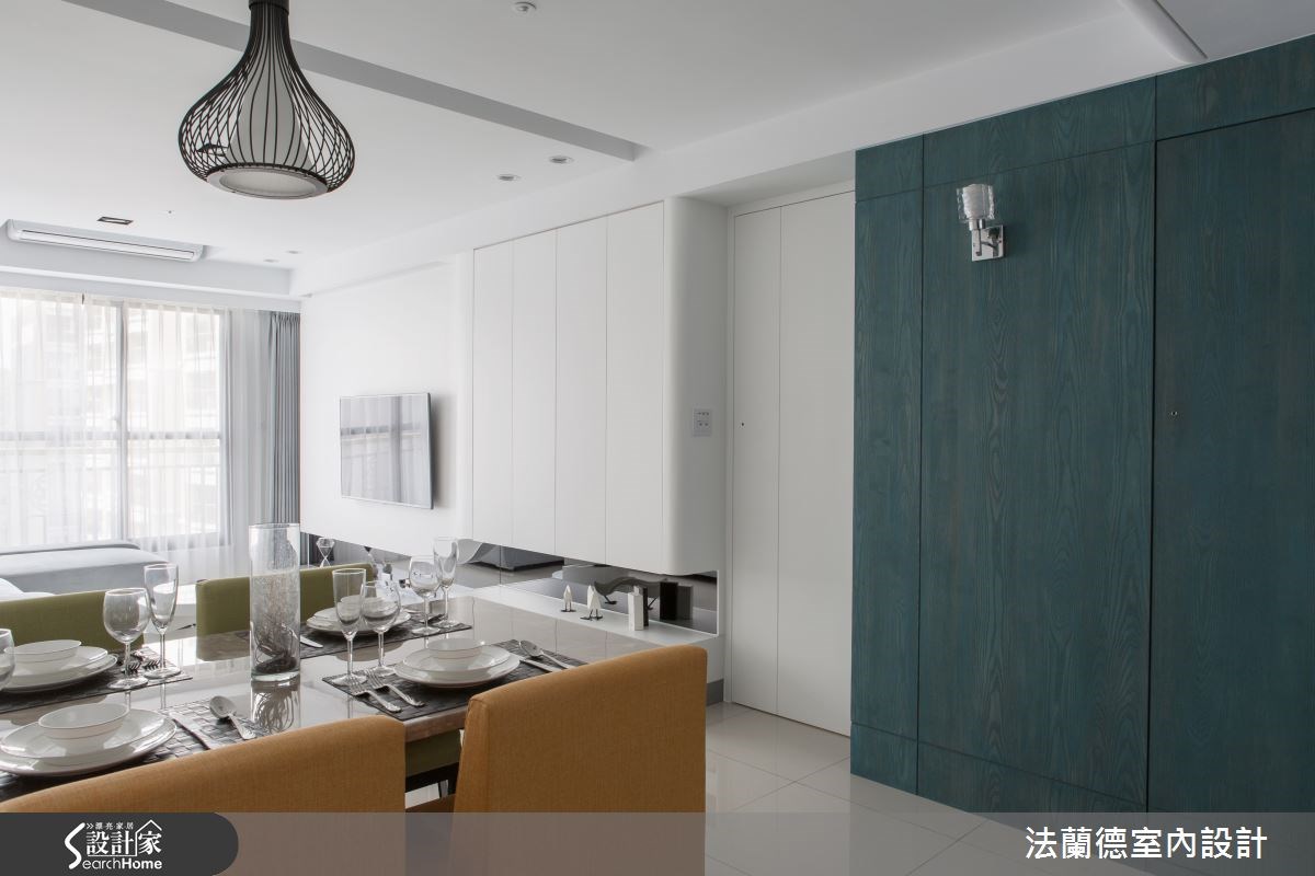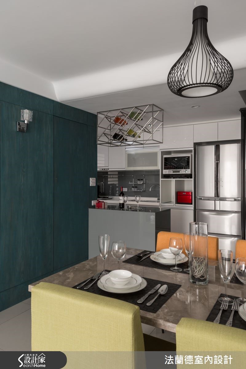 新婚夫妻外加一只毛小孩,在仅52平方米空间构筑他们的幸福小窝。设计师将原先的两室一厅重新分配,提升了原先空间效用,同时替女主人做出梦寐以求的更衣室,以及给男主人一个开放式餐厨空间,满足两人一狗的美好生活。【整合空间配置,为公领域扩容】走进大门,设计师在玄关处配置深色玻璃隔屏,形成简单的领域界定。入内则可进入开放式餐厨空间,餐厨设备、冰箱等皆收整在同一道立面,并在吧台上的天花板悬吊金属置酒架。餐厅则配置一座绿色木皮收纳柜,在餐椅色彩的呼应下,形成明快活泼的用餐氛围。公领域从餐厅延伸到客厅,在天花板、墙面等处做出圆弧收边线条,柔化了空间锐角,电视墙则作为公共空间中的视觉焦点,运用大面积的白色调,搭配镜面底部的延伸线条,增添轻奢质感。同时扩增收纳空间,让电视墙兼具美感及实用机能。卧室空间则以大地色规划床头主墙,并运用古典线板堆叠墙面层次,打造出简单具年轻风格的寝卧气氛;更巧妙调转格局,将更衣室配置于床头墙后侧,不仅动线流畅,并运用线板隐藏门片,形成完整的立面表情。