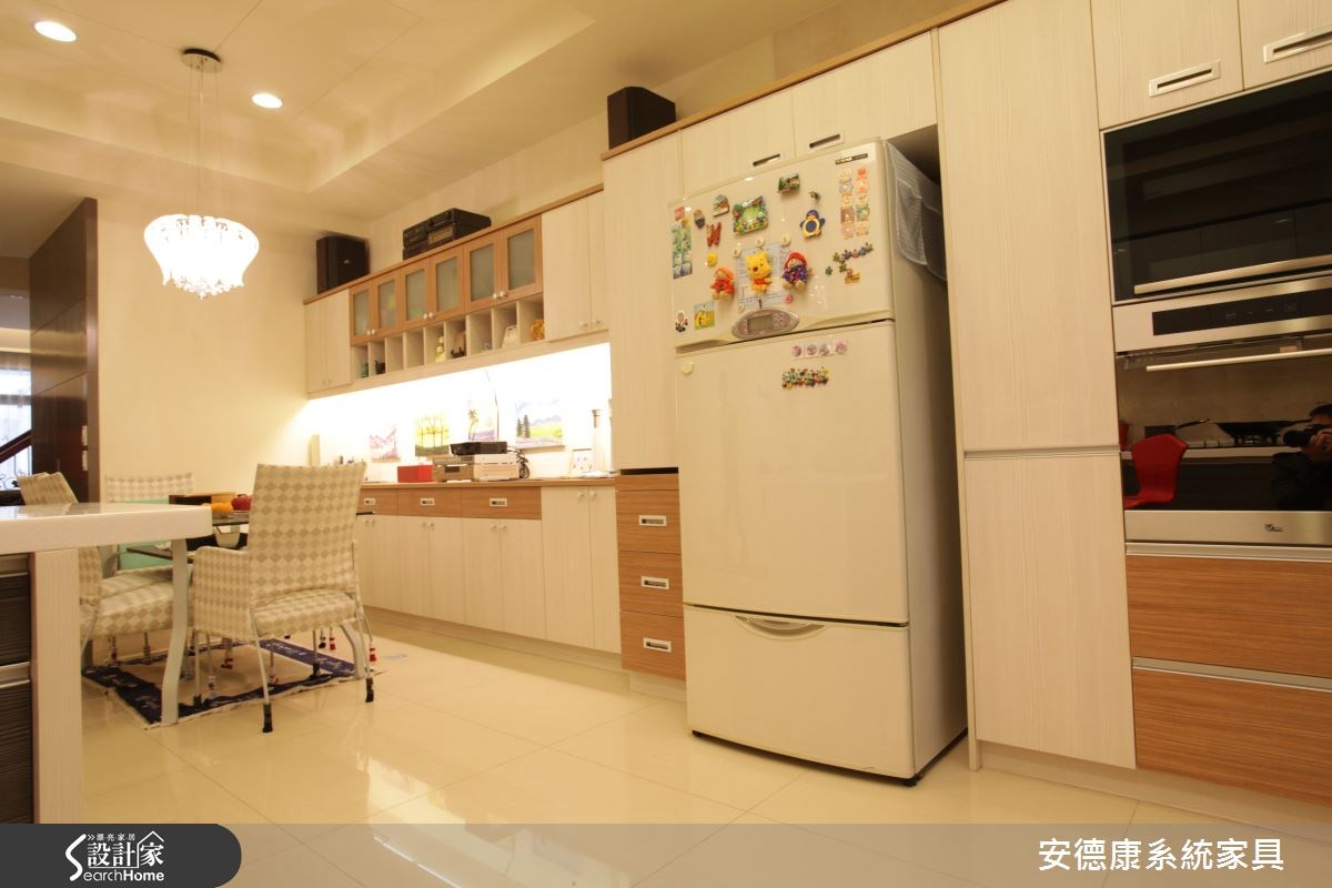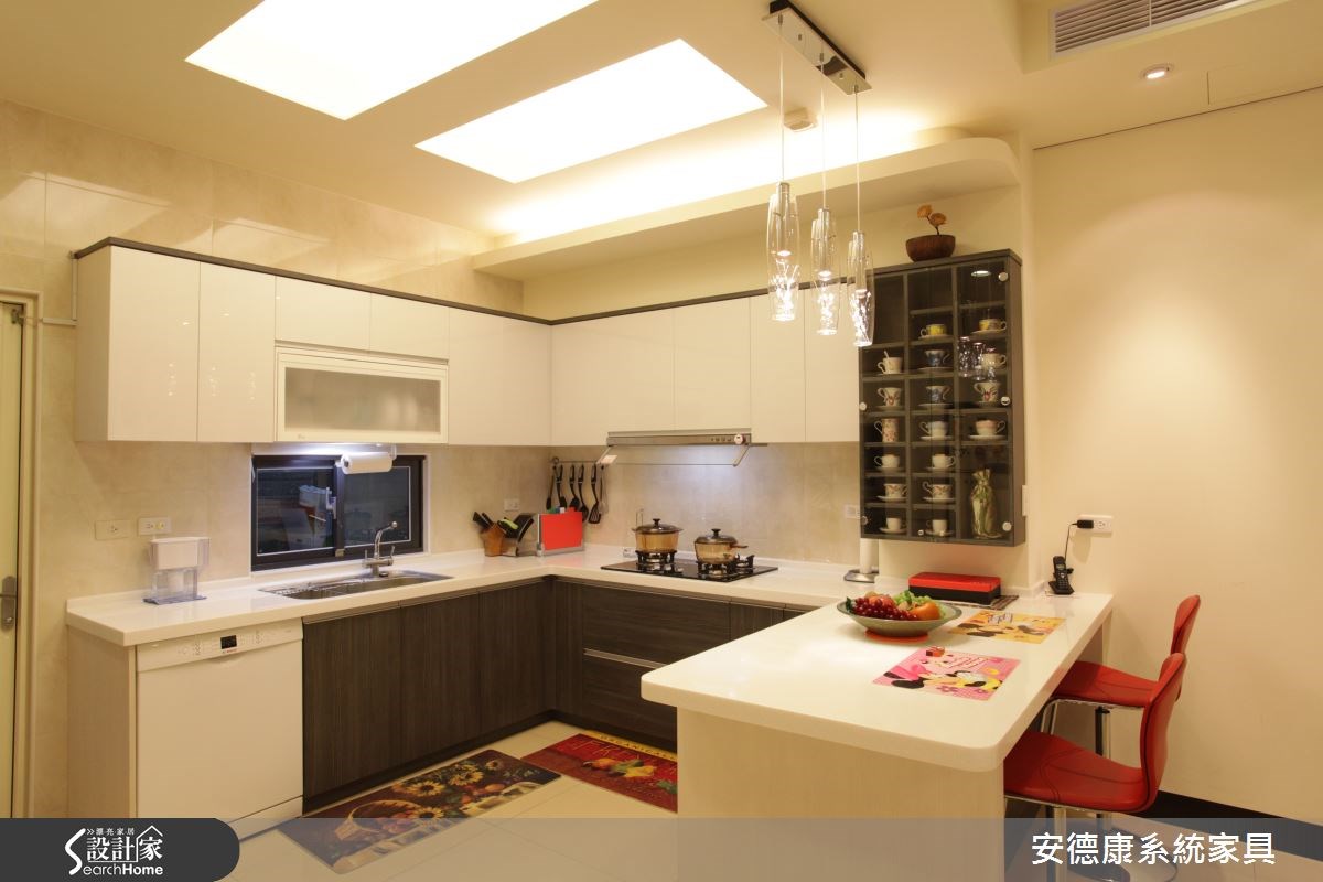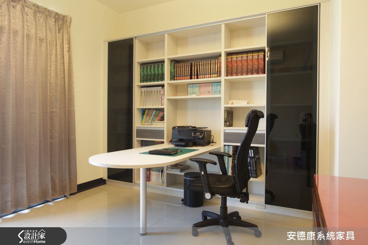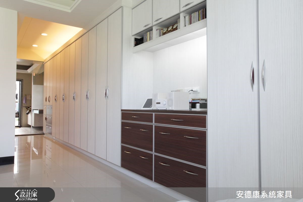 居宅先天优势为格局方正、采光好、通风佳,而屋主对于居家空间有满满的憧憬。设计师决定注入充足的实用机能,并以舒适大方为风格定调,添入多种灯光变化。提供休憩功能之馀,也兼具视觉享受。 【大面机能柜墙,收纳充足】客厅电视墙以白色大理石作为重点材质,墙面两侧连结大面积木皮柜体,在自然纹理中融入收纳机能。并搭配深色沙发与家具,适度添加空间稳重度。天花加入数十种变化的LED灯,透过灯光设计增加视觉美感。餐厅区则呈开放式格局,让餐边柜一直延伸至厨房区,烤箱、电饭煲、微波炉、蒸烤炉等电器皆收整于墙,形成流畅的动线。L形料理区则与中岛吧台做出连结,餐厨注入完善收纳机能。在书房区域中,桌体则结合了书柜,运用黑色玻璃柜门做点缀,在强大机能中,营造出清爽简练的美感。主卧则规划了完整的收纳机能,整排落地柜不仅提供充足置物空间,更形成一道动线导引;搭配天花板间接光源,为空间带来纾压感受。