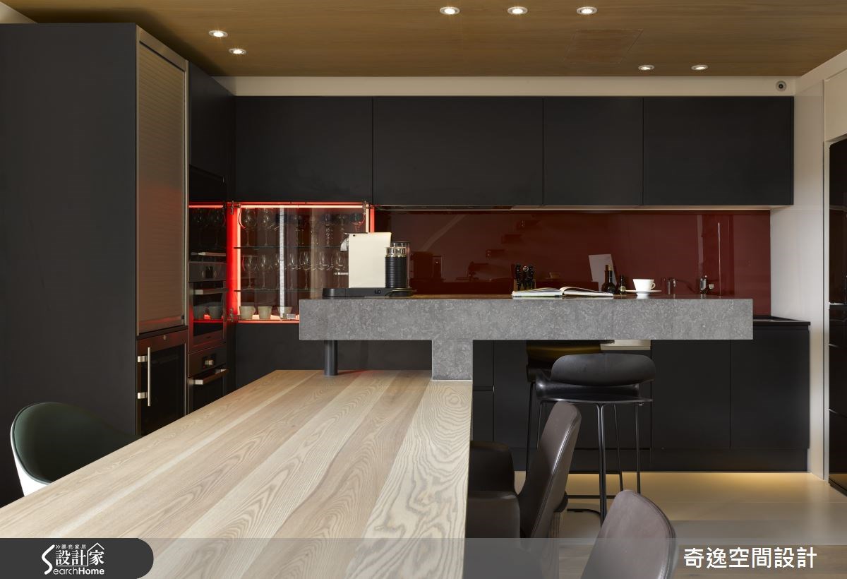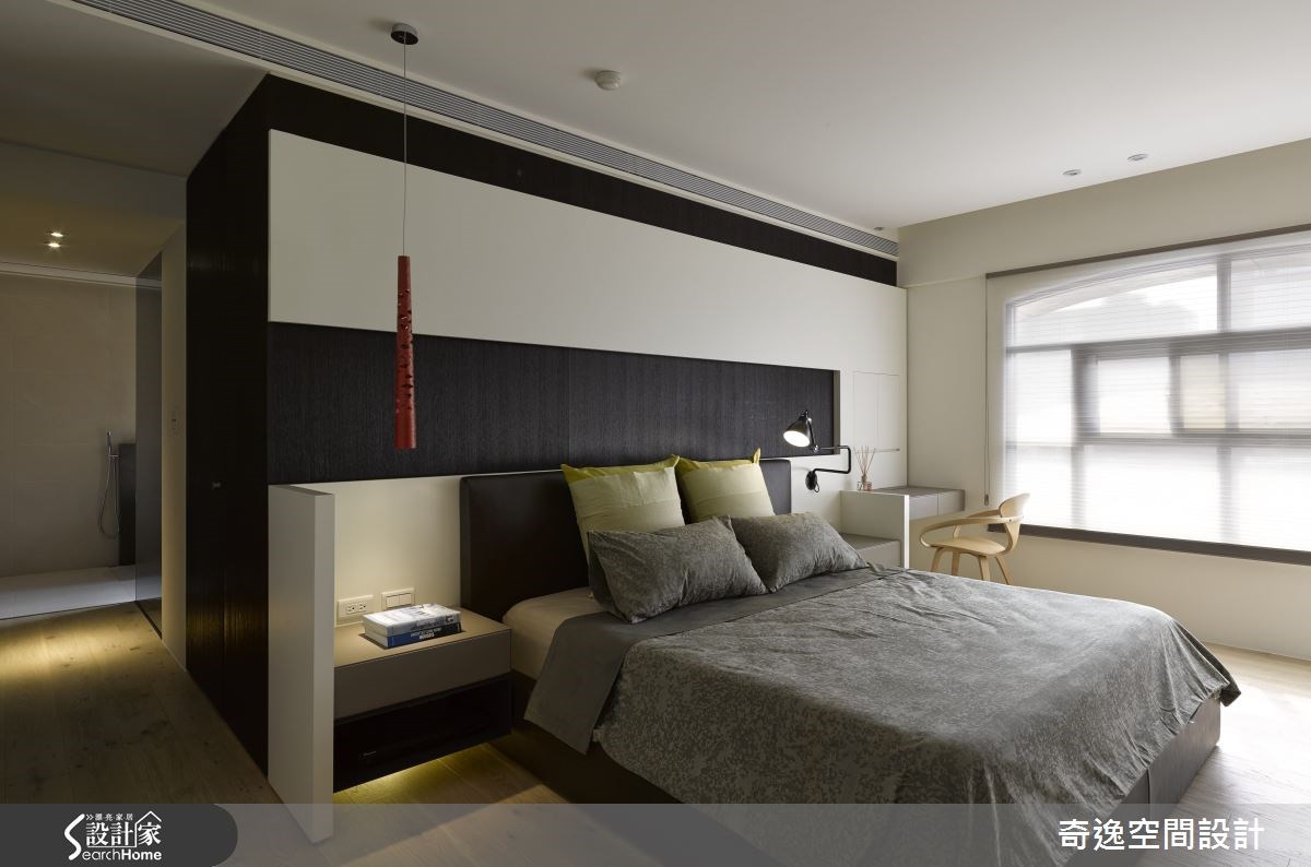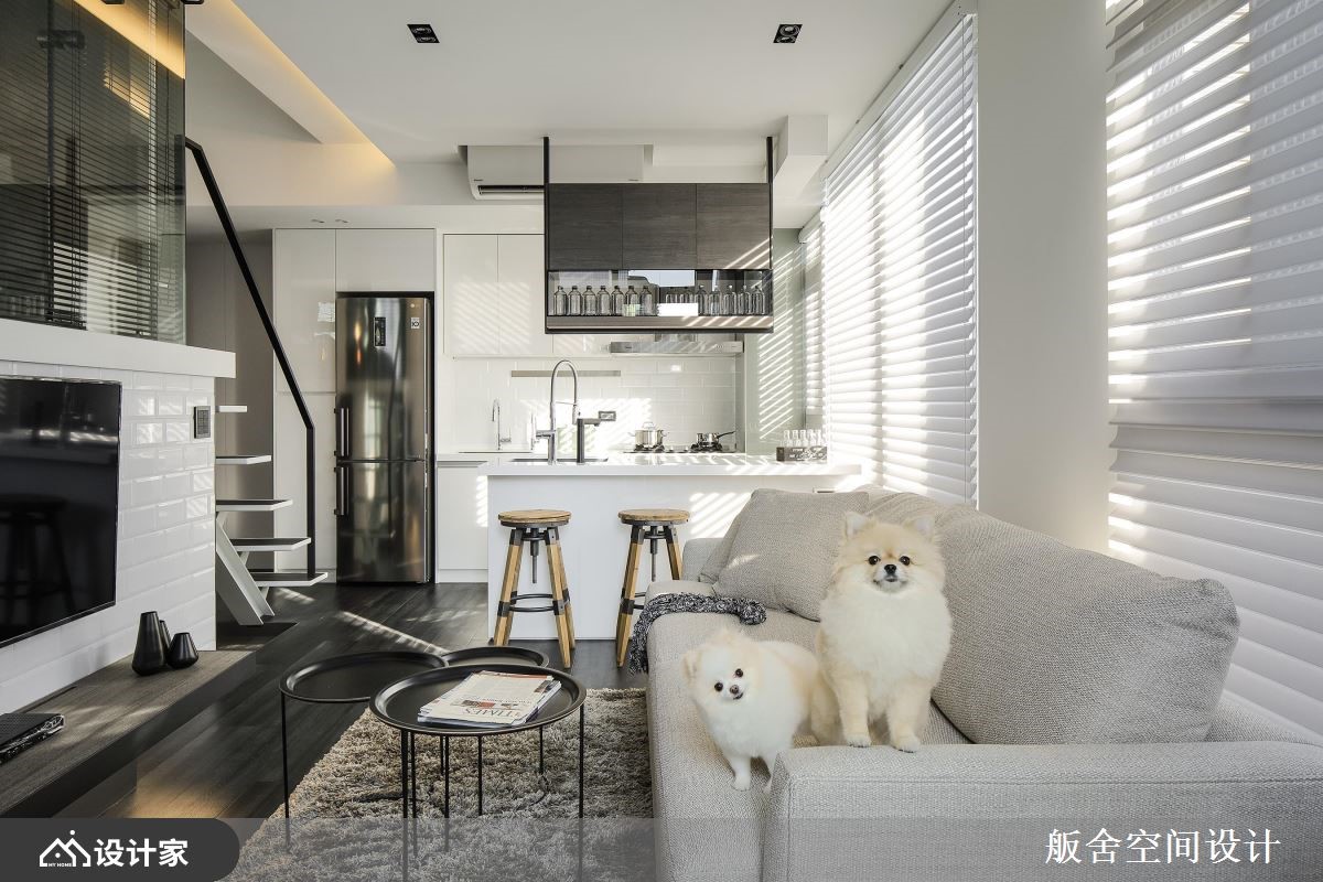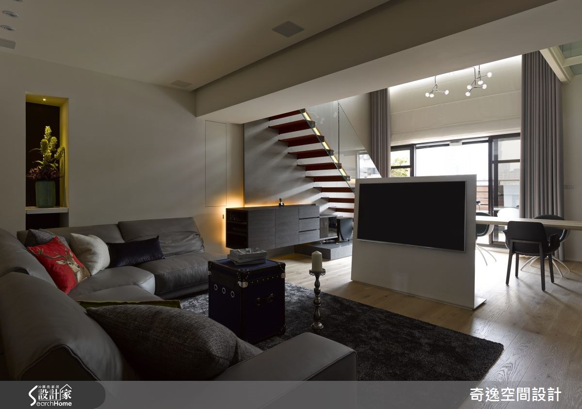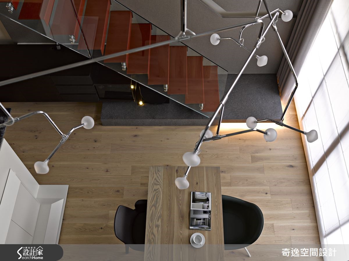 座落于都会区精华地段的一间132平方米复式楼,在原为毛胚屋时,屋主希望在动线与格局上能有良好的规划,即与设计师进行了多次的沟通与规划,便决定注入现代简约的风格。【楼梯移位,空间使用更完整】由于位于较高的楼层,让此屋拥有良好充裕的采光与宽广的都市景观;然而原楼梯规划的位置却压缩了空间使用的坪效,过多的开窗也造成墙面太过零碎。设计师为了使空间更加完整,便移动了楼梯的位置,创造出轻盈穿透的楼梯,也让二楼的起居空间更宽敞完整。在材质规划与布置上,设计师以现代风格的简洁与俐落感为设计主轴。全屋以实木复合地板为空间的基底,搭配客厅圆弧型沙发后的木质背墙,让自然朴实的元素传递着无束缚感受。而具简约设计感的直立L型电视墙造型,则展现了屋主在生活品味上的注重。后方开放式的餐厨区域是男屋主特别注重的地方,以红黑色系橱柜塑造出都会时尚的意象,延伸而出的中岛吧台则成为屋主款待亲朋好友的地方,佐以挑高的格局来创造出无压感,随着天花板铁件吊灯的不规则摆动,增添趣味惬意的氛围。同时,日光透过纯白窗帘变成柔和自然的光晕,流动于居住者与空间之间,赋予了空间的生命气息。向上的楼梯以9毫米的铁板作为踏面,扶手则使用玻璃展现穿透感,让空间更为通透,同时也传递着一气呵成的连续感,成为家中不受拘束的时尚端景。