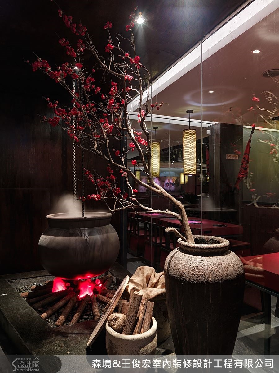 从入门处开始,运用古意盎然的陶瓮和火锅布置,便点出火锅店主题与空间的历史感,古色古香的设计,让人顿时进入时光隧道。搭配大红色的装饰植栽,串联整体空间。