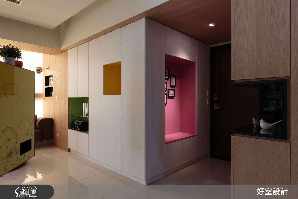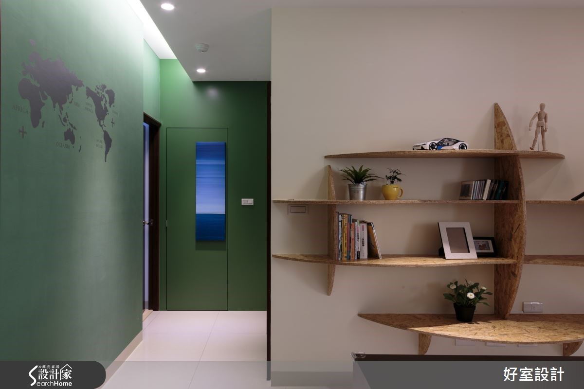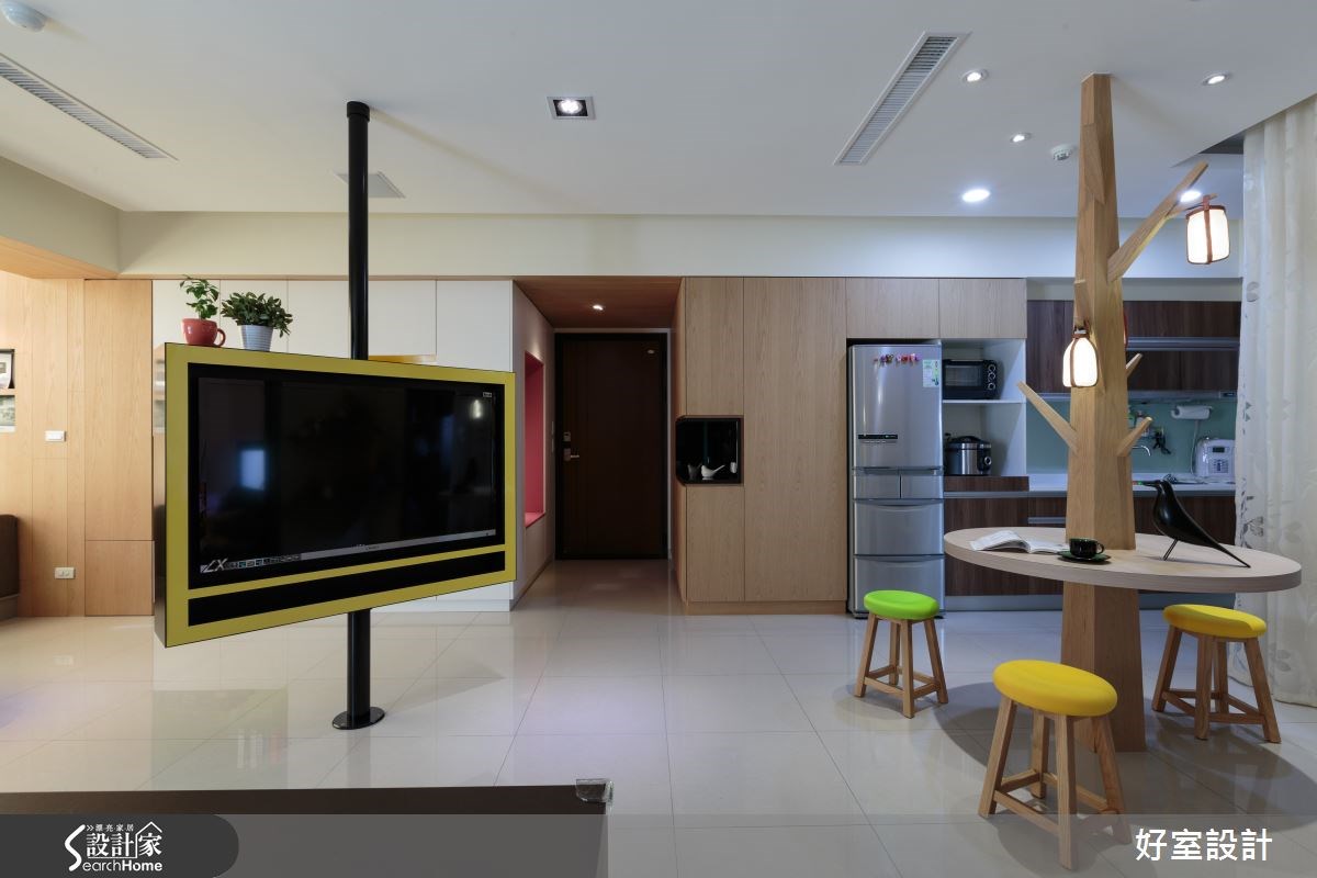 培养孩子的创意,就在日常生活中。此次空间住着一家四口,设计师在92平方米的居家中,透过材质规划,将空间变成孩子们的小小画室,同时也配置多彩设计,让一家人每天都能拥有美感体验。【涂鸦与装置艺术,带来空间趣味】从大门进入这个家,可见到右方配置的白色柜体,刻意做出内嵌台面,搭配天花板嵌灯照明,形成宛如美术艺廊的展示景观,并在背景墙点缀粉红、苹果绿、鲜黄等色彩,将收纳机能结合视觉美感。在靠窗处陈列长形沙发形成休憩飘窗,让人可在这里体验美好采光。旋转电视墙是整个居家的核心设计,不仅扩大了客厅的使用范围,让每个角度都可享受视听娱乐;更以黄色玻璃烤漆铺陈墙体背面,制成涂鸦面板,让大人小孩可共同绘图,共享天伦之乐。餐厅区则规划了一座定制餐桌,不仅提供用餐功能,树状的木作设计更成了居家装置艺术。同时,公领域也陈列一张造型俐落的书桌,简单定义出开放式的阅读空间,搭配着墙面的半圆展示隔架,替空间绘制出不少流线美感。设计师在公共空间中,替墙面与门片施作大面积的墨绿色彩,注入了浓郁的大地气息。而墙面上的世界地图,以及门片上那形同飞机窗景的装饰,更替空间带入旅行的自由意味。