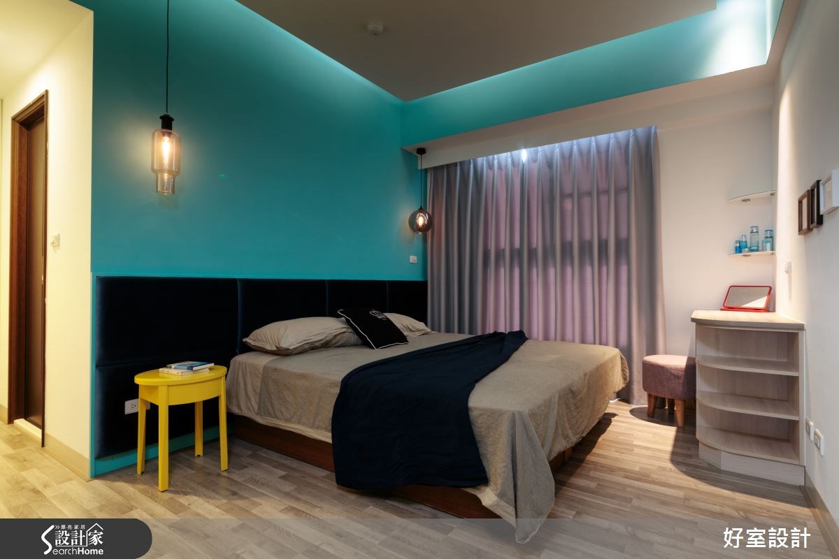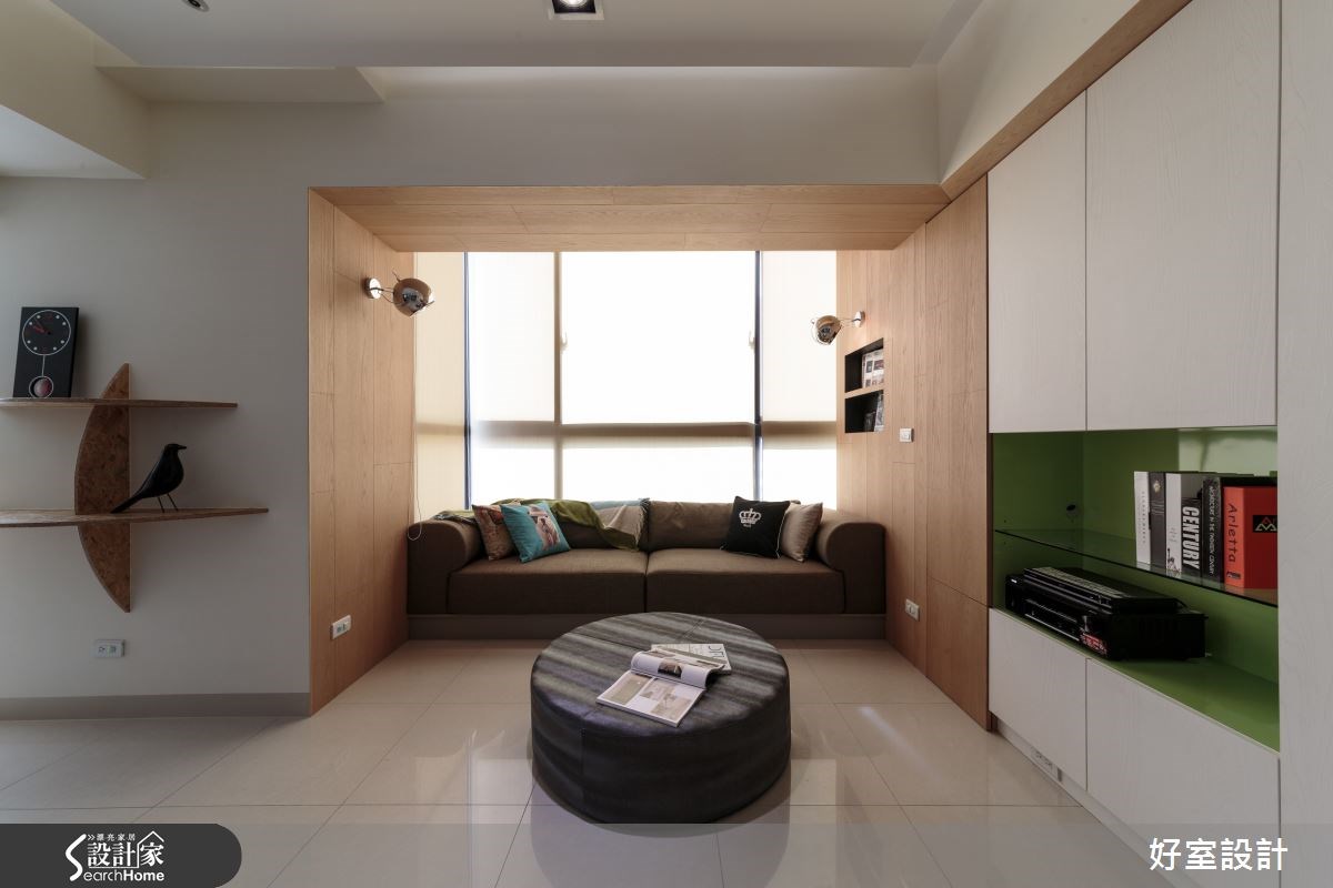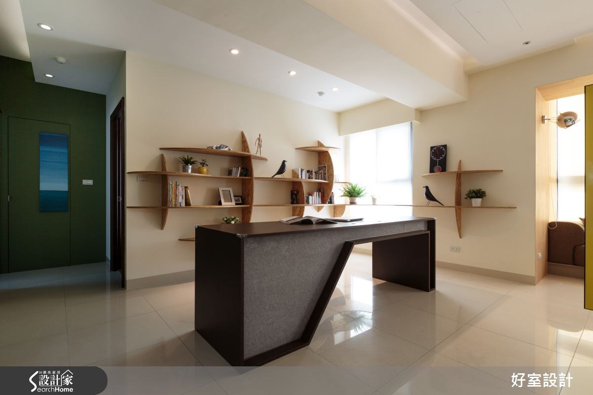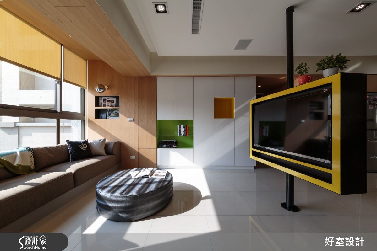 培养孩子的创意,就在日常生活中。此次空间住着一家四口,设计师在92平方米的居家中,透过材质规划,将空间变成孩子们的小小画室,同时也配置多彩设计,让一家人每天都能拥有美感体验。【涂鸦与装置艺术,带来空间趣味】从大门进入这个家,可见到右方配置的白色柜体,刻意做出内嵌台面,搭配天花板嵌灯照明,形成宛如美术艺廊的展示景观,并在背景墙点缀粉红、苹果绿、鲜黄等色彩,将收纳机能结合视觉美感。在靠窗处陈列长形沙发形成休憩飘窗,让人可在这里体验美好采光。旋转电视墙是整个居家的核心设计,不仅扩大了客厅的使用范围,让每个角度都可享受视听娱乐;更以黄色玻璃烤漆铺陈墙体背面,制成涂鸦面板,让大人小孩可共同绘图,共享天伦之乐。餐厅区则规划了一座定制餐桌,不仅提供用餐功能,树状的木作设计更成了居家装置艺术。同时,公领域也陈列一张造型俐落的书桌,简单定义出开放式的阅读空间,搭配着墙面的半圆展示隔架,替空间绘制出不少流线美感。设计师在公共空间中,替墙面与门片施作大面积的墨绿色彩,注入了浓郁的大地气息。而墙面上的世界地图,以及门片上那形同飞机窗景的装饰,更替空间带入旅行的自由意味。
