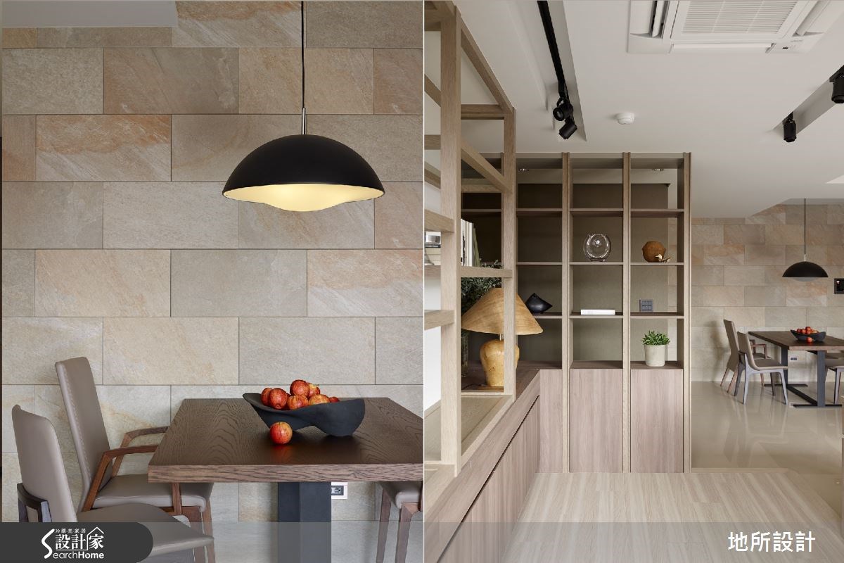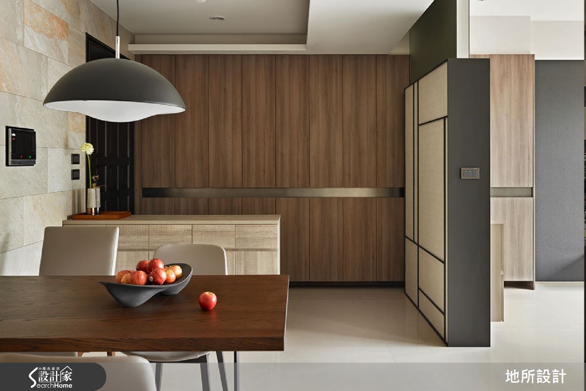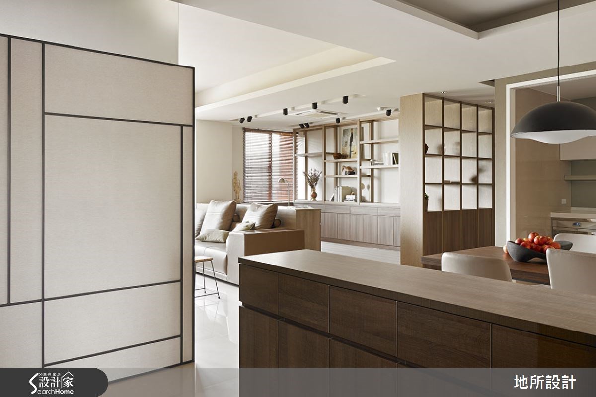 日式住宅常以轻浅色彩和大量的日光,给人温暖而明亮的视觉感受。因此设计师即善用木作材质,搭配美好采光,同时也考虑到家有银发长辈,添入铁件、墙纸等深灰色调,创造稳重感。在设计师的巧思之下,打造出沉稳又不失清爽的好感居家。【镂空柜体,带来采光与温润质感】从玄关进入居宅中,即可见到一座造型景观墙面,以米色为底,黑线为经纬,交织出线条美感;延伸进入公领域,则将客厅、多功能领域、餐厅等空间采开放式设计,让整体都可享受到流通采光,再搭配大地色家具与深灰色电视墙,形成安稳的和风意境。客厅后方则刻意架高地板,规划出多功能区,提供了休憩、阅读等功能,并配置不少木作柜体,于墙腰以上作出穿透感展示架,在满足展示收纳需求的同时,也形成与廊道之间的界定隔屏。此外,考虑一家人的用餐习性,在餐厅、厨房之间配置木质移门,达到阻隔油烟扩散的目的;餐厅则采用浅色壁砖铺陈墙面,与木质元素形成协调美感。主卧空间则呈现轻浅色彩,仅以简单的天然木作材质,床头板为量身定制,中央为柔软的绷布,两侧采用木作与底下床头柜做出连结,造型具特色。而父亲房中则从柜体到墙面皆以深灰色系型塑稳重氛围,并透过花卉墙纸,展现细腻层次。