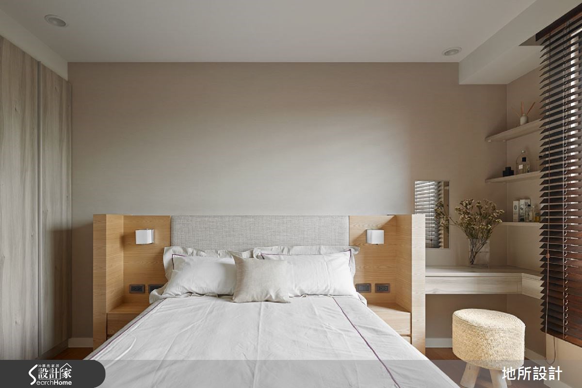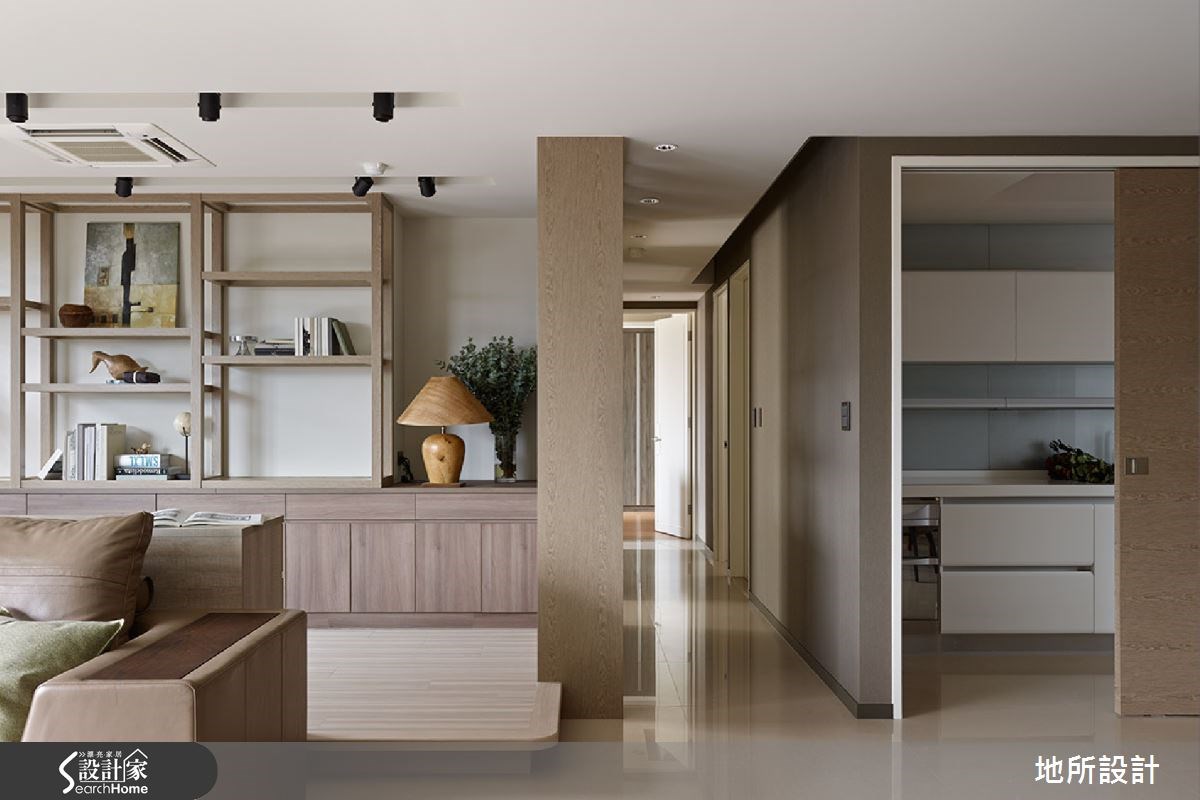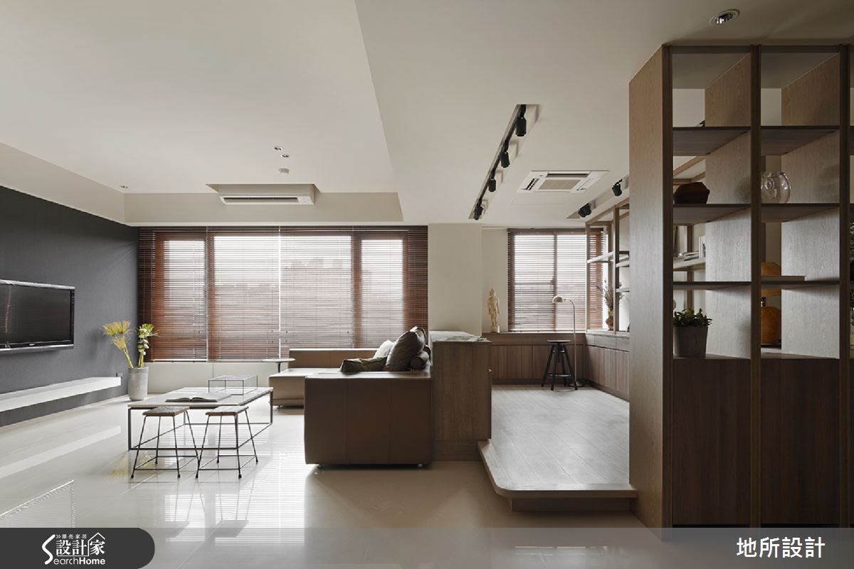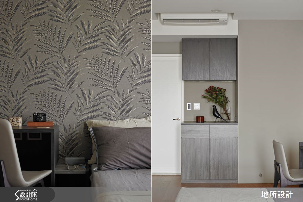 日式住宅常以轻浅色彩和大量的日光,给人温暖而明亮的视觉感受。因此设计师即善用木作材质,搭配美好采光,同时也考虑到家有银发长辈,添入铁件、墙纸等深灰色调,创造稳重感。在设计师的巧思之下,打造出沉稳又不失清爽的好感居家。【镂空柜体,带来采光与温润质感】从玄关进入居宅中,即可见到一座造型景观墙面,以米色为底,黑线为经纬,交织出线条美感;延伸进入公领域,则将客厅、多功能领域、餐厅等空间采开放式设计,让整体都可享受到流通采光,再搭配大地色家具与深灰色电视墙,形成安稳的和风意境。客厅后方则刻意架高地板,规划出多功能区,提供了休憩、阅读等功能,并配置不少木作柜体,于墙腰以上作出穿透感展示架,在满足展示收纳需求的同时,也形成与廊道之间的界定隔屏。此外,考虑一家人的用餐习性,在餐厅、厨房之间配置木质移门,达到阻隔油烟扩散的目的;餐厅则采用浅色壁砖铺陈墙面,与木质元素形成协调美感。主卧空间则呈现轻浅色彩,仅以简单的天然木作材质,床头板为量身定制,中央为柔软的绷布,两侧采用木作与底下床头柜做出连结,造型具特色。而父亲房中则从柜体到墙面皆以深灰色系型塑稳重氛围,并透过花卉墙纸,展现细腻层次。