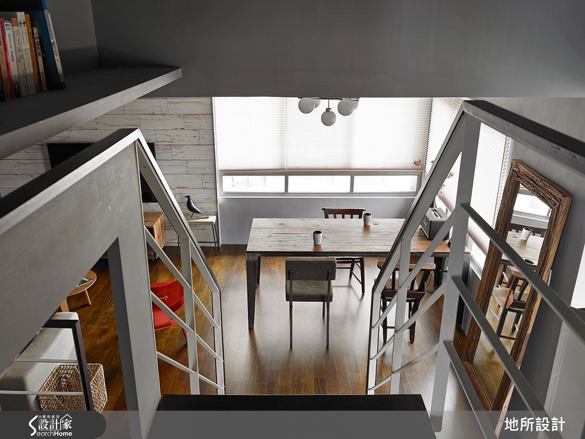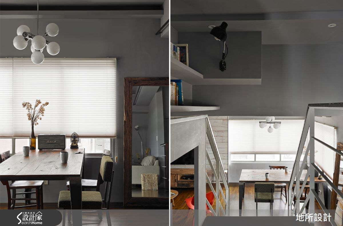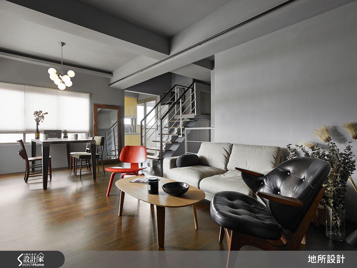一间房龄20年的老屋该有怎样的改变,才能让人耳目一新?设计师以现代风为设计主轴,进行一场空间整形;但刻意保留原先的天花板,透过色彩搭配、家具家饰等注入复古气息,并以通透的开放设计,创造每个角落的互动性,让屋主与孩子之间随时保有紧密联系。 【全室铺陈灰色,展现高冷范】整体空间以灰色为主轴,搭配实木地板呈现质朴韵味。全室呈现开放通透格局,客厅透过电视墙营造复古风情,墙面选材与视听木柜皆可见斑驳肌理,充满不加修饰的风情。搭配红、黑、白等沙发座椅,将现代风与怀旧感做出完善揉合。沿楼梯向上,可来到卧室空间,配置阳刚的铁件床架、粗犷吊灯、特色画作等,昭告卧室主人的鲜明个性。并在床头墙底部做出内凹空间,满足小物或书籍的收纳需求。 居家中的一道楼梯不仅串联公、私领域,设计师也加以发挥空间效能,把梯间转角设置成阅读空间,做出简单的书桌与书架规划,让人不禁回忆起校园生活,那在楼梯间伴随等待心情的阅读好时光。
