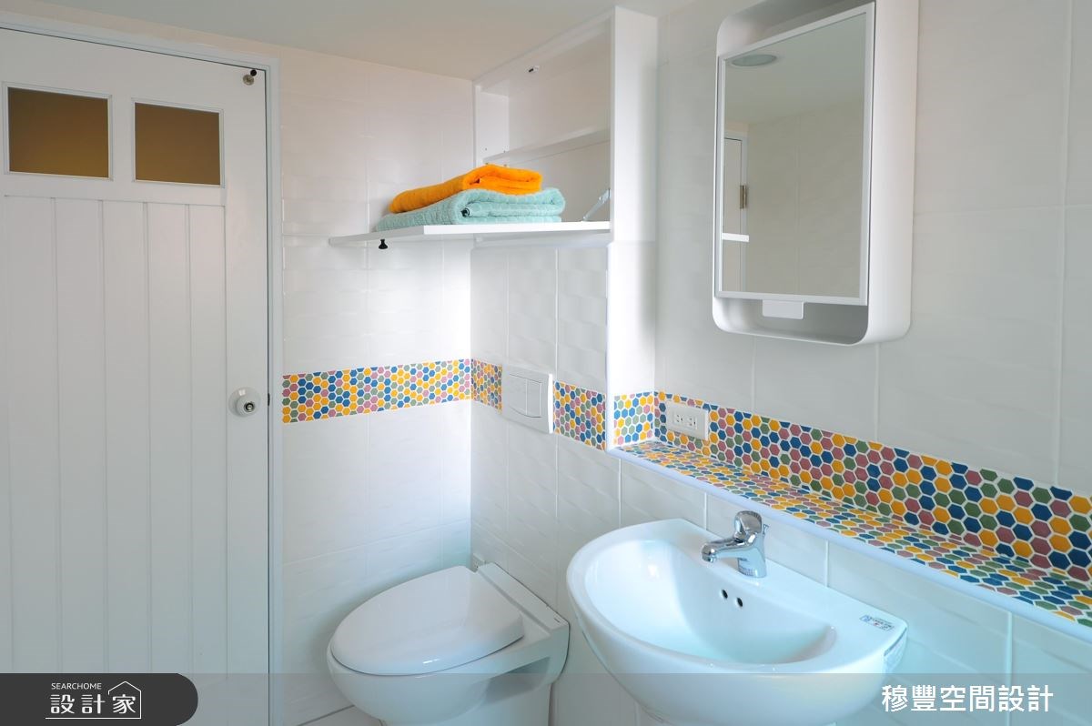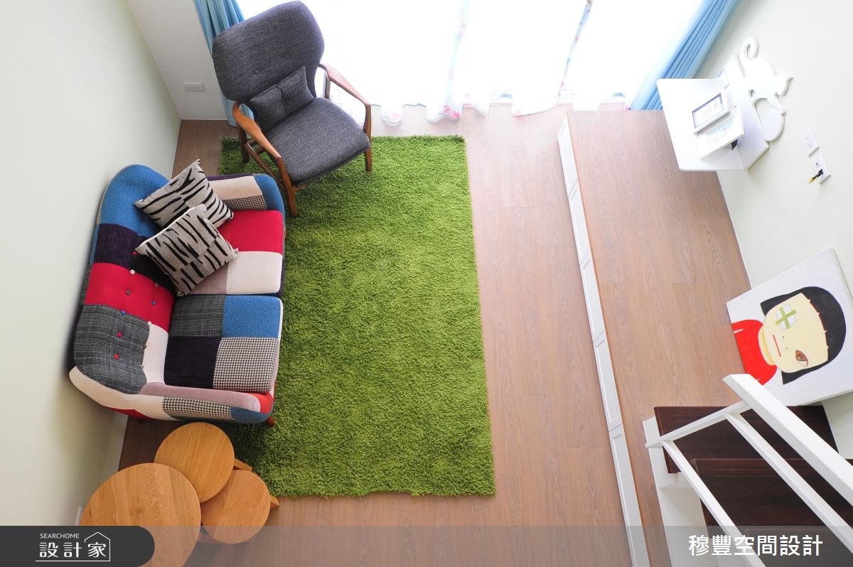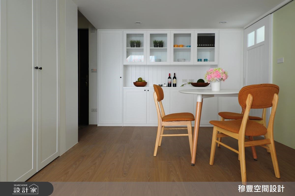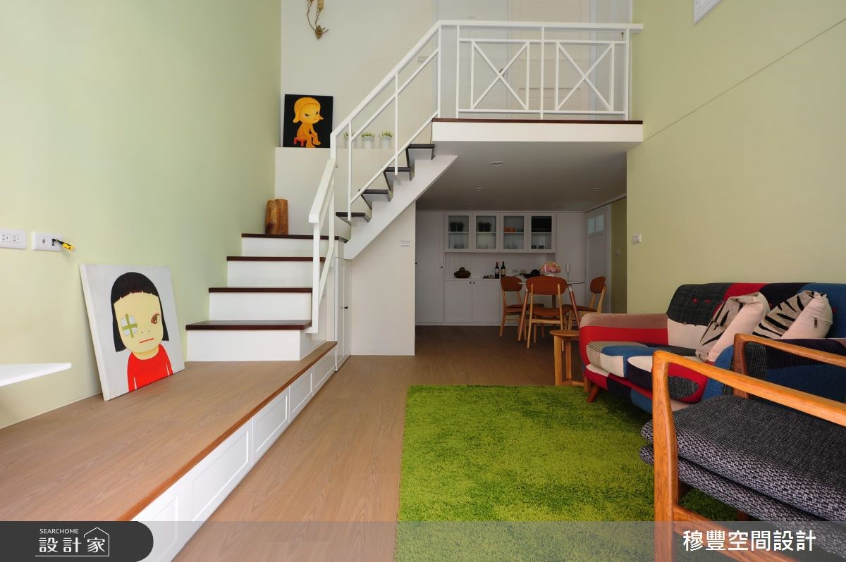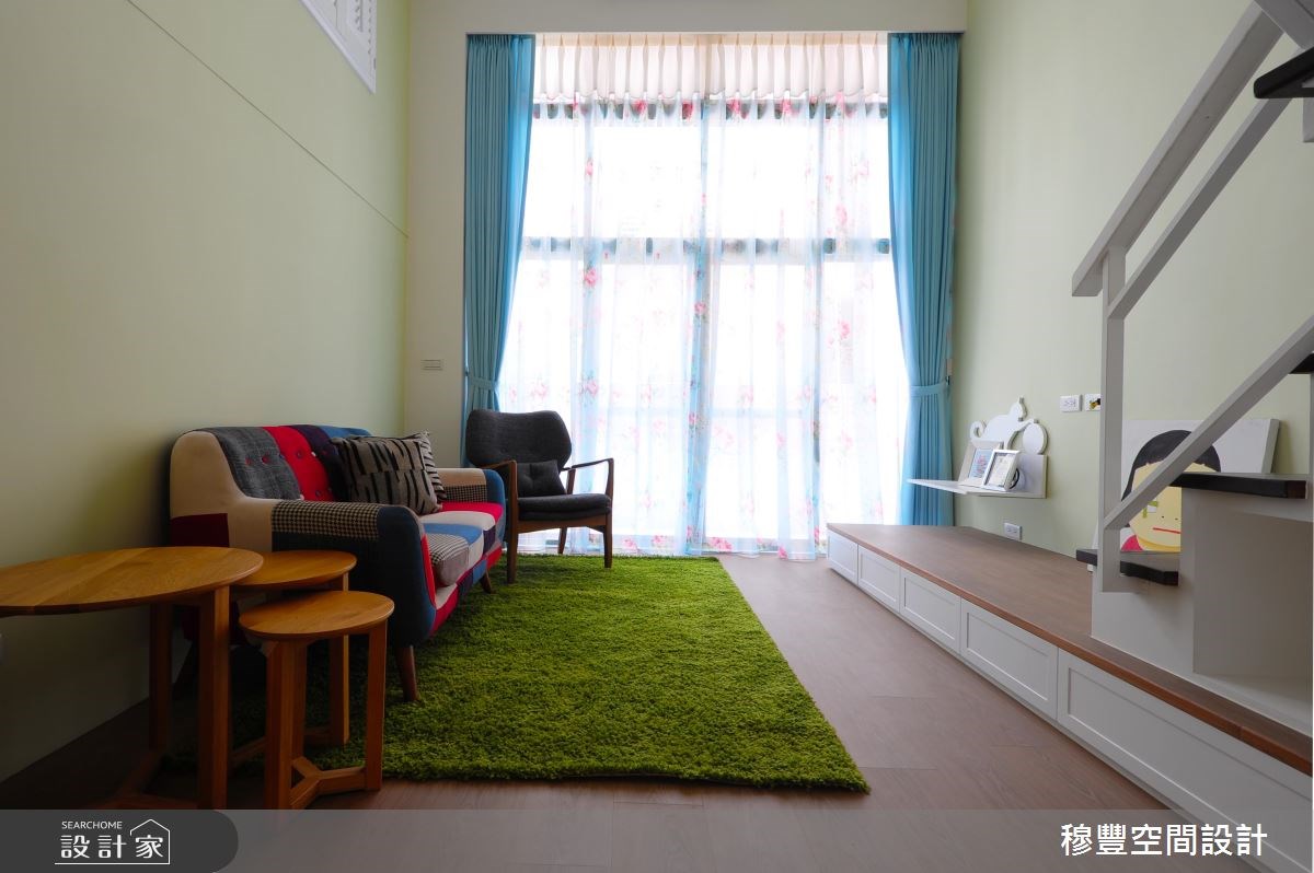 初次购屋的屋主,买下了位于新北市新庄区的一间屋龄 15 年以上的夹层空间,屋主个性开朗活泼,希望能将此空间打造成下班后能好好放鬆身心的家。设计师以乡村风格作为整体空间的设计基底,除维持原本的格局与方位上,亦给予了更多实用的机能设计,虽然仅有 20 坪的居家空间,却能够享受着惬意舒适的生活方式。玄关入口处利用了复古感的几何地砖搭配白色收纳柜体,让公私领域区隔界定。走进屋内后,铺满木地板的空间,传递着自然而温润的气息,搭配上淡绿色的墙面与屋主喜爱的艺术家画作,营造出能疗癒身心的居家氛围。客厅的沙发区,除了淡绿色背墙外,设计师亦摆上绿色地毯,创造出青草地坪的视觉意象,并搭配着色彩鲜艳的拼布沙发与木座椅;随着大面的花卉窗纱带入了自然光后,客厅彷彿也成为了室内的小公园一般,自然又惬意。而稍微改变原本方向的楼梯,同时也为空间腾出储藏室的功能和夹层的收纳机能。餐厅则运用白色线板柜体打造出纯白干净的用餐环境,简单不造作的幸福感油然而生。而卫浴空间则以白色磁砖为主要材质,搭配彩色几何磁砖为空间增添趣味感。小编的最爱看腻了城市的喧嚣扰攘,不如在家好好享受充满绿意的下午茶时光! 深浅不一的绿色挥洒在墙面与地毯之上,在随着墙面延伸向上的白色线板窗扇与复古灯饰的衬托之下,让客厅就像一个小小乡村中的绿地般自然又自在啊。