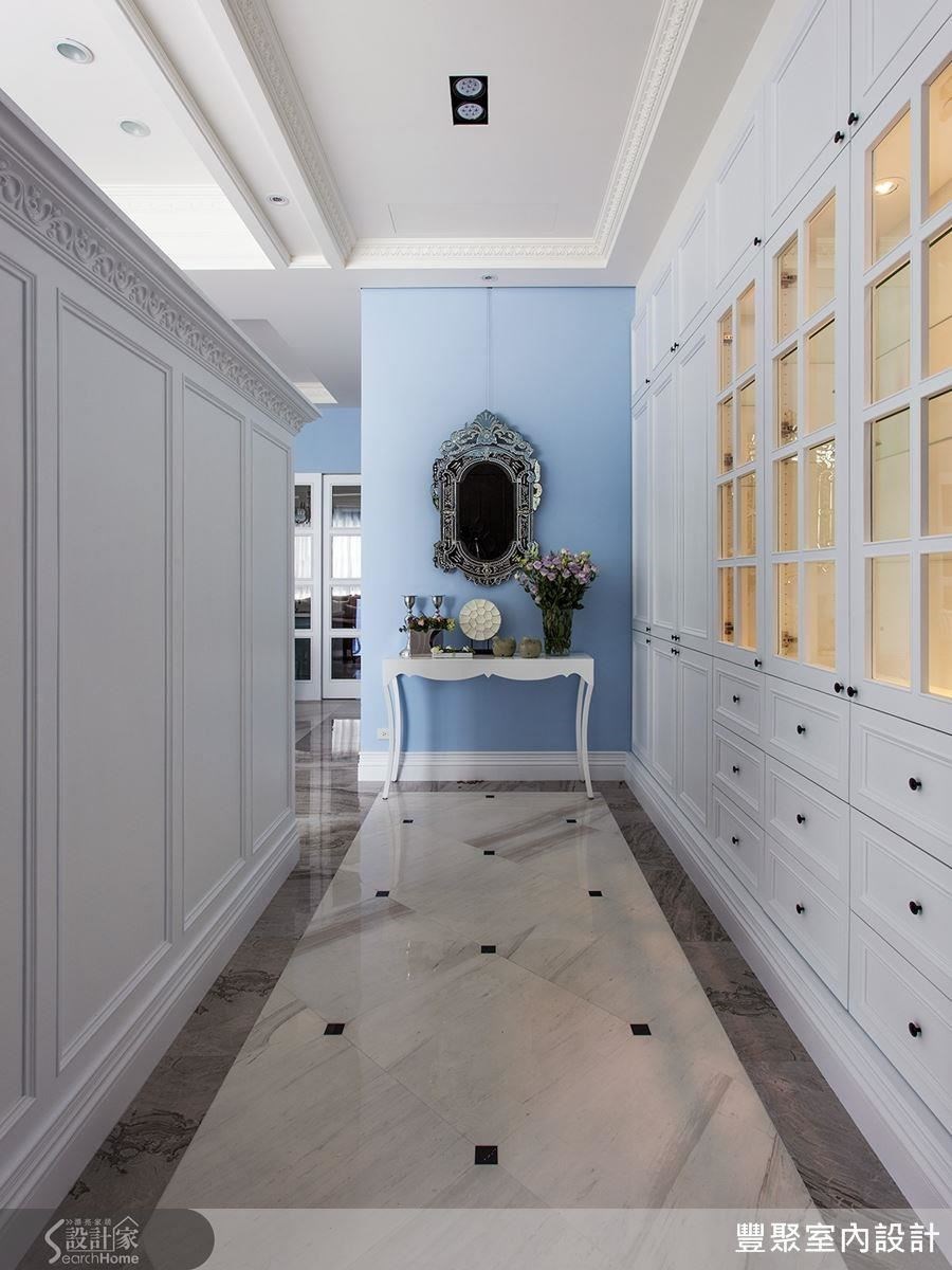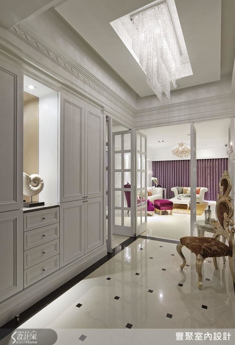 充满古典氛围的内玄关,右侧是穿衣镜,左侧是衣帽鞋柜及展示柜;设计师以玻璃门作为进入前方客厅及左侧餐厅的区隔,既有放大空间的穿透性,又有内外有别的独立感。