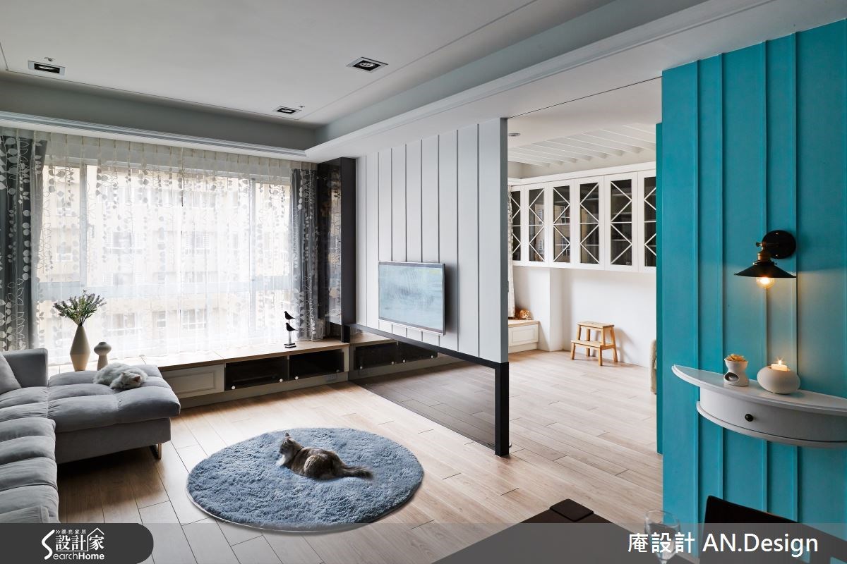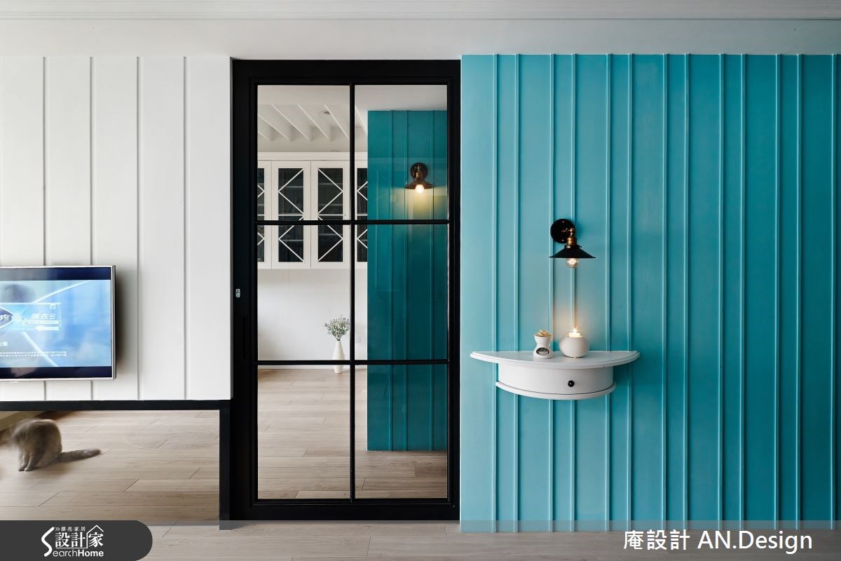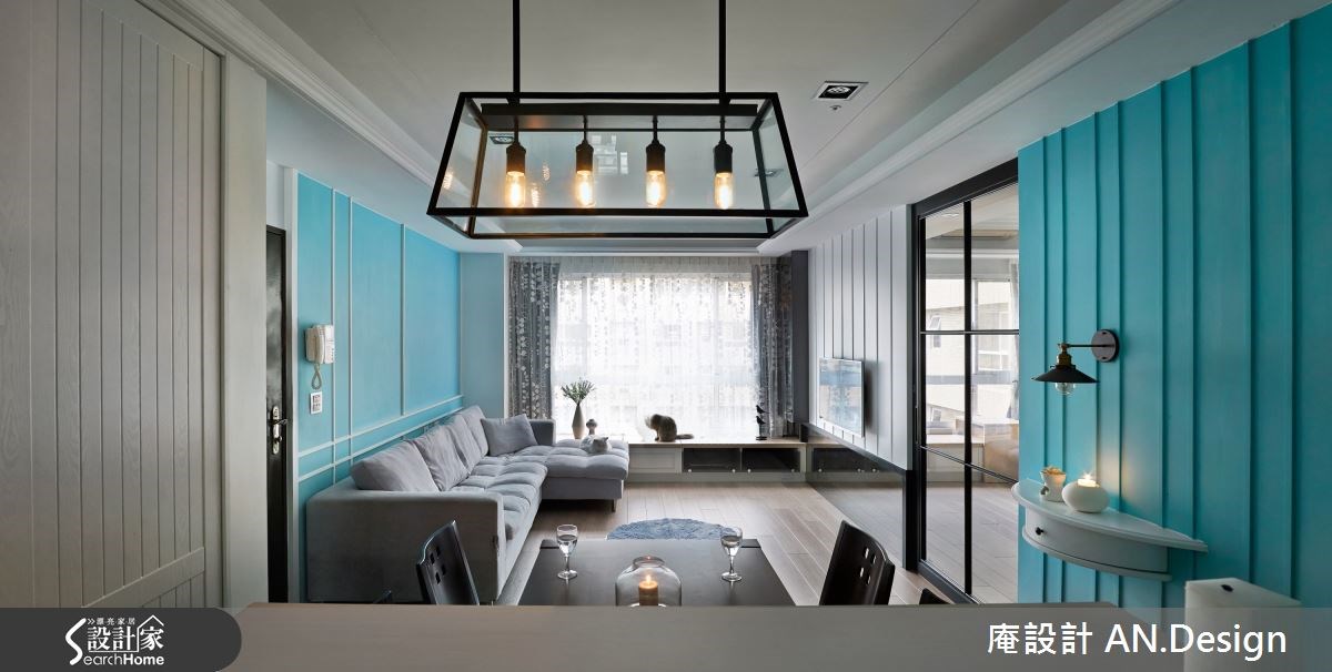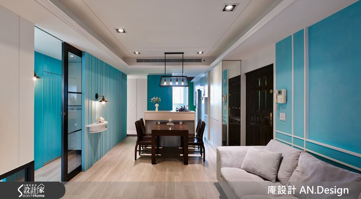 美式乡村风格的居家有很多种呈现的方式,你喜欢的是哪一种呢?这是由二手房所改建的居宅,设计师不同于繁复乡村的设计,改以简单亮眼的色系与简约线条成为主角,型塑具有丰富层次的美式居家氛围。【水蓝色调,空间更清新】在整体风格的规划上,设计师以兼具清爽与温润的浅色木地板作为美式乡村风格,再搭配纯净的白色与亮眼的水蓝色,彼此穿插于沙发背墙、餐厅主墙与视听空间,营造视觉亮点。而水蓝色的清新质感,让人感到自在而纾压。客厅区电视墙除了上方采用大方的白色线板,下方则是搭配灰镜,让空间在视觉上能够向前延伸放大。用餐区以小巧的中岛吧台连接深色木桌椅,用餐时光就更为温暖窝心。原为主卧的空间则被改为视听书房,透过穿透性的灰玻拉门,延伸了木地板,让空间能穿透畅通。客厅与视听房的窗边都设置飘窗,加上移动式的桌几和收纳,强化飘窗机能。