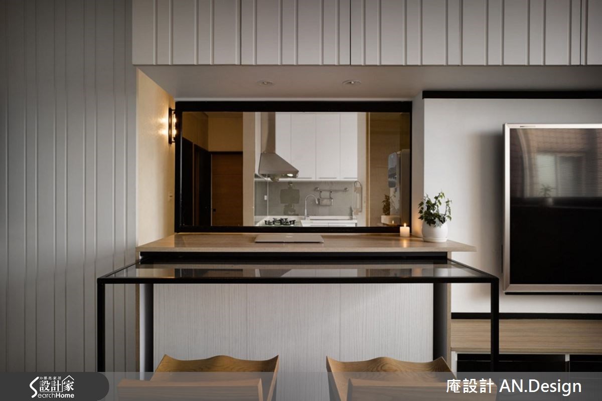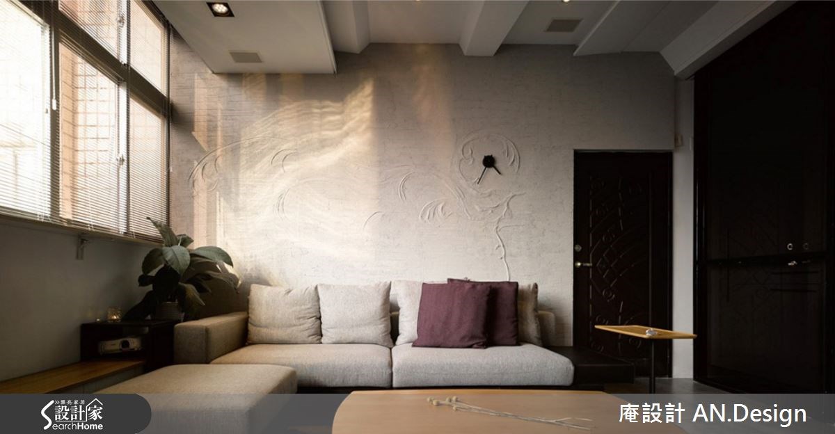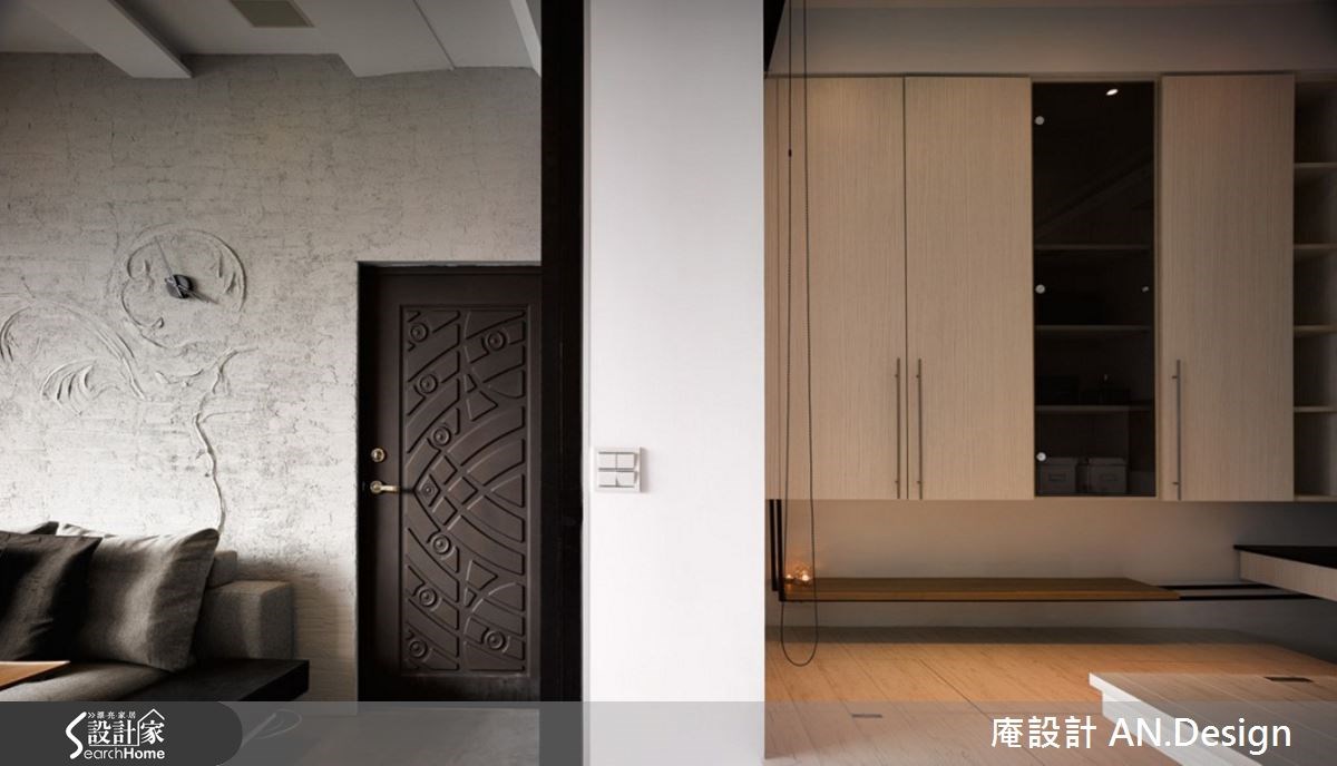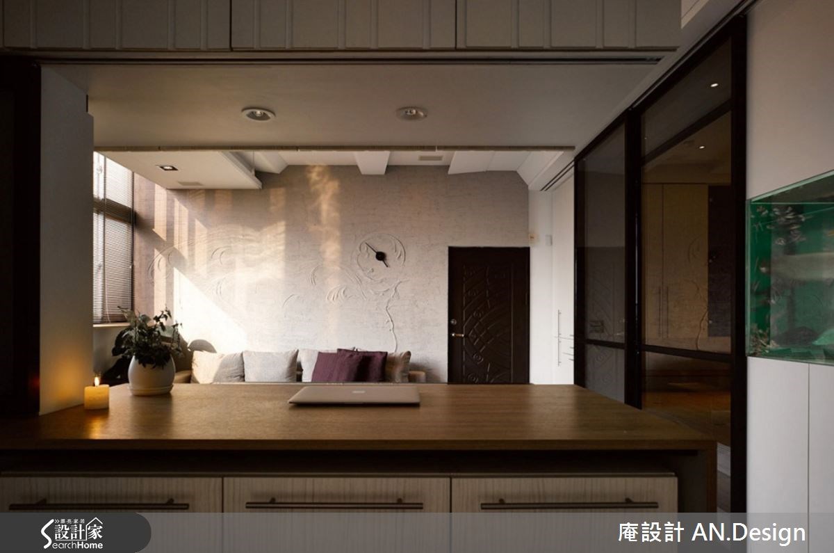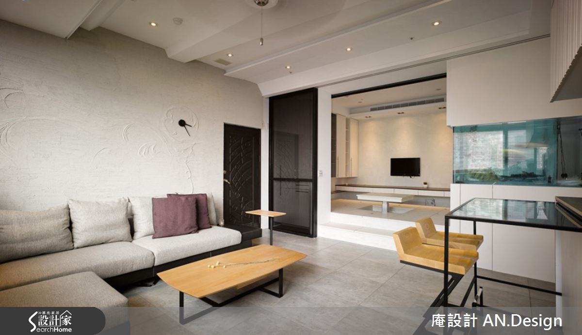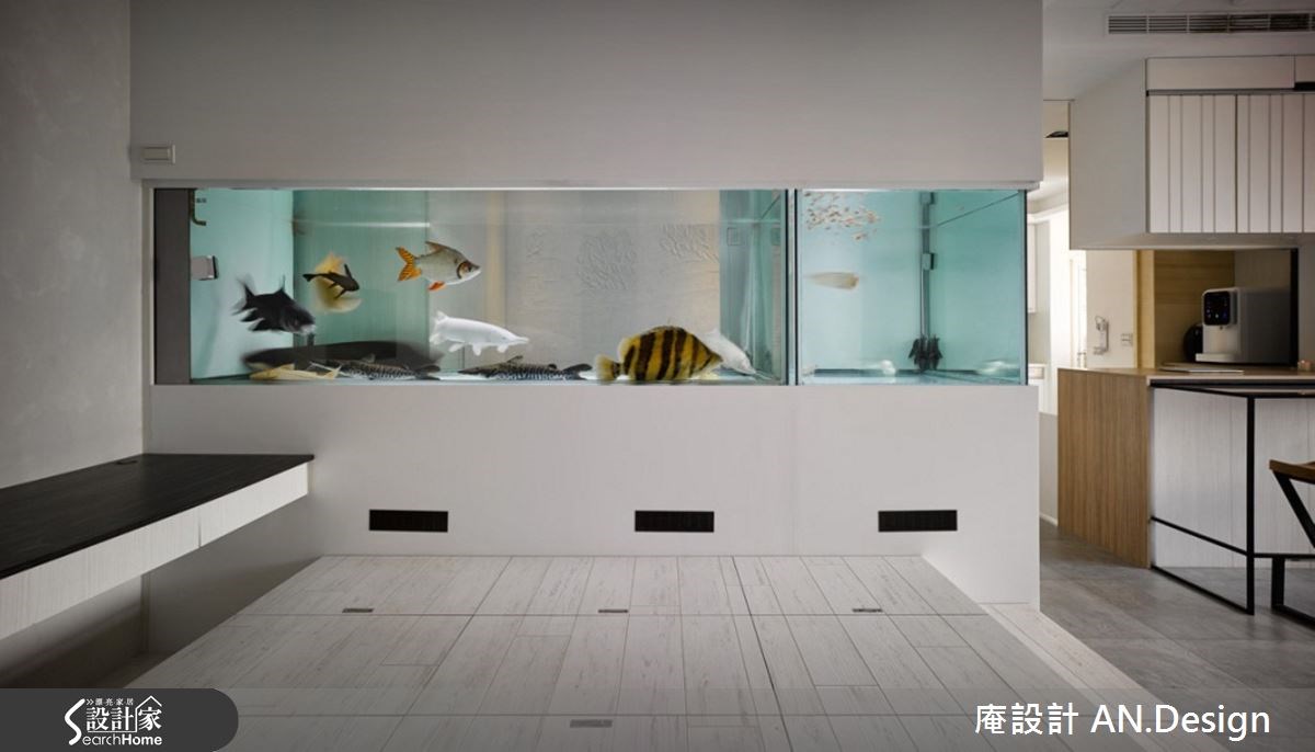此空间住户是不同国籍的夫妻,陪住的宠物是几只狗与一群鱼,有着弹性、开放的格局,创造出流动的时间、水和笑声。夫妻两人在此以爱为出发,养家、养恋人、养宠物,让生命力诠释居宅空间的调性。【活动桌面,扩大机能使用】针对宠物间、客房、客厅、餐厅、厨房等设计,替原先的二手房配置弹性隔断,创造可封闭、可开放的生活规划。在客厅的沙发背墙采用浮雕粗骨材和马来漆,以手作方式将时钟嵌墙。而天花板则做出不规则的折板吊顶,呼应墙面的垂直纹理,创造空间线条的多样性。同时,不刻意界定餐厅范围,仅配置吧台,结合可弹性拉出的定制桌面,扩大用餐范围。而厨房、吧台之间的透明墙面,则放大了居家视野。一旁的架高和室则以灰玻拉门区隔,并把鱼缸嵌墙,不仅满足了屋主的养鱼乐,也让水波光影增添居家墙面的丰富表情。
