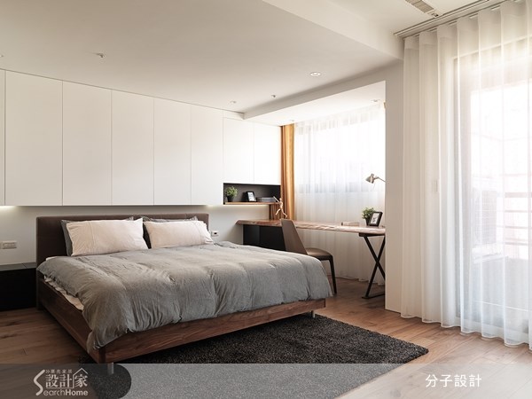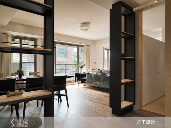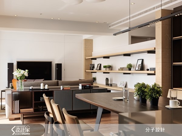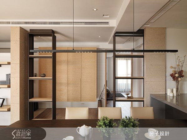 原有格局过于零碎,阻挡了不错的采光条件,于是设计师以开放手法规划公领域,拆除墙面,让客厅、餐厅、厨房形成无阻碍空间,同时也透过落地窗及开放式柜体规划,让美好采光可自在流通于居家,打造出明亮开阔的好视野!【引进光源,感受暖意色彩】走进空间中,以明亮白调搭配温润木质,与大面积落地窗外的采光相得益彰,传递出温暖人心的氛围;并在餐厅及廊道之间配置穿透铁件展示架,不仅满足置物机能、形成领域界定,更让光线与视线可自由流通,创造空间延伸感。【明确轴线,强化宽敞感受】将厨房、餐厅、客厅安置在同个轴在线,采以开放格局,强化公领域的宽广度,并在客厅墙面嵌入木层板,妆点几株绿意植栽及饰品,形成纾压疗愈的视觉体验。【清爽设计,营造舒眠卧室】主卧房则延续清爽的调性,并在床头作出隐藏柜体设计,形成美感及机能兼具的寝卧空间;睡眠区旁则配置书桌椅,桌体以原木定制而成,与窗外阳光营造天然况味,打造出惬意的午后阅读好时光。 除此之外,居家中的小小储藏室也充满美感;设计师将门片采用大地色彩,并点缀垂直线条,与地坪形成连续感,再搭配柔和的照明灯光,让储藏室入口也拥有了艺术端景般的效果。