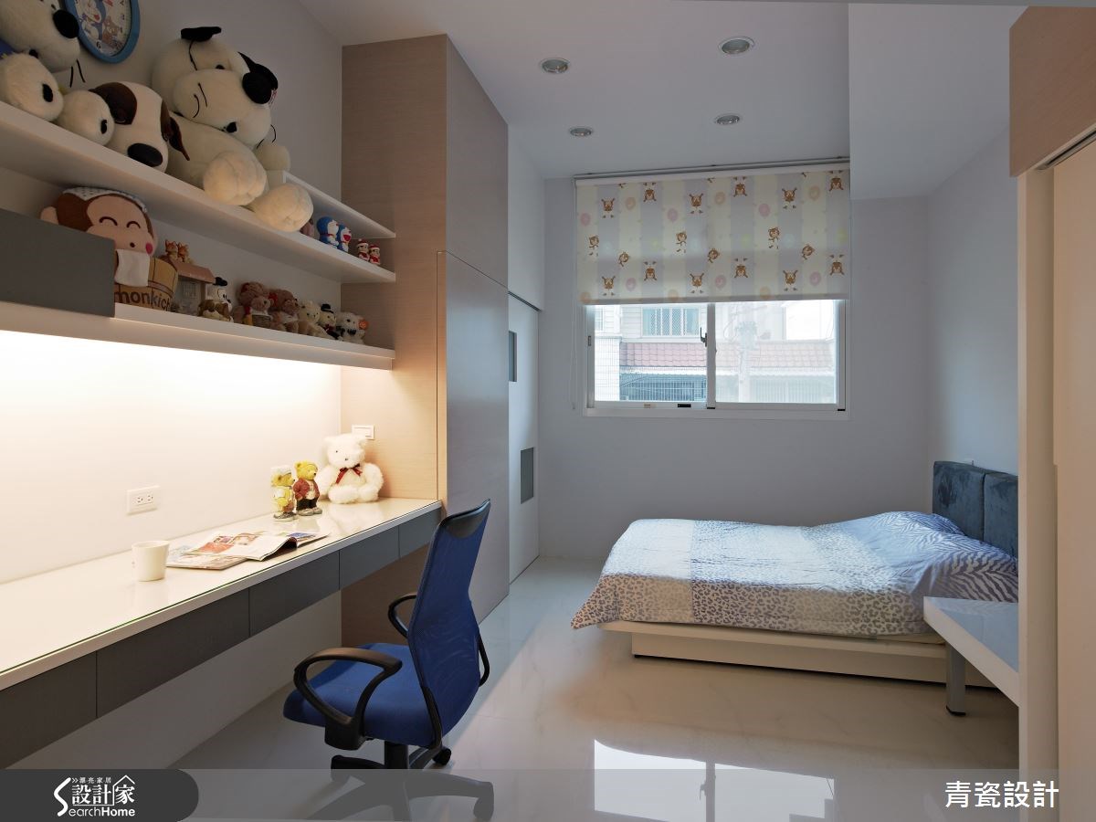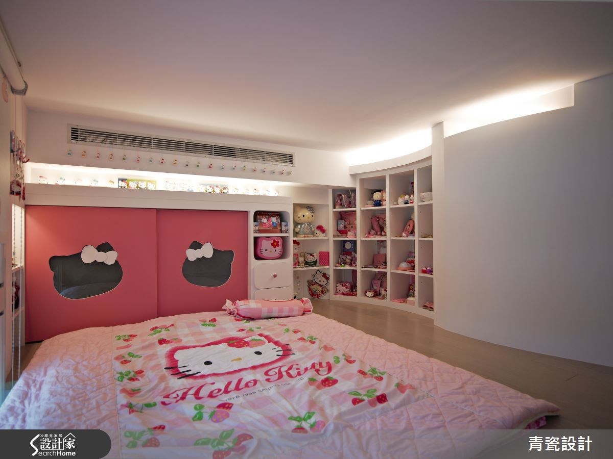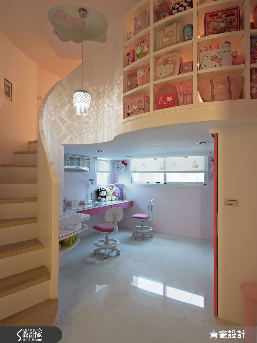 空间中共有5位家庭成员共同居住,设计师以清新净白作为空间的设计重点,同时为了与自然意象结合,设计师在柜子底层加入人工草皮,并藉由镜子反射,空间呈现清新氛围。【弧形隔断,安全又通透】入门后,可看见客厅沙发后的造型墙,以分割的斜线制造光透出的视觉效果,让客厅多了一道亮点。电视墙后方的书房特别用了弧形的玻璃隔断,柔化空间线条。同时并压上树枝倒影,维护行走安全不受碰撞,也让空间多了清新质感。 主卧室反而没有太多繁复的设计,回归平静的休憩时光,简单的床头背墙加上玻璃作为一整面的梳妆台;加上电视墙则以不同大小的块体搭配出层次感,扩充收纳和视听机能。女孩房中则做了小阁楼,打造出像公主住的粉红色城堡。