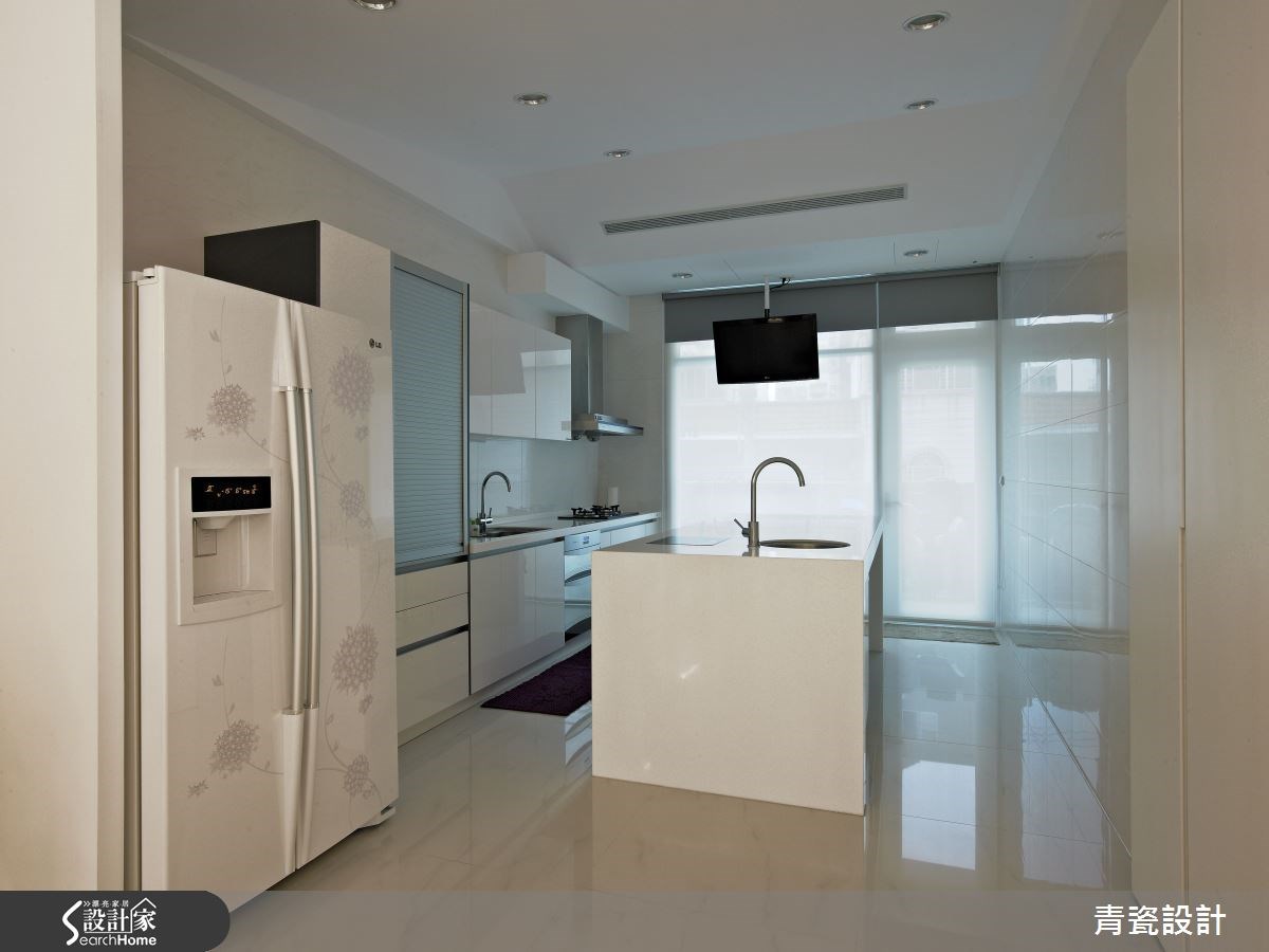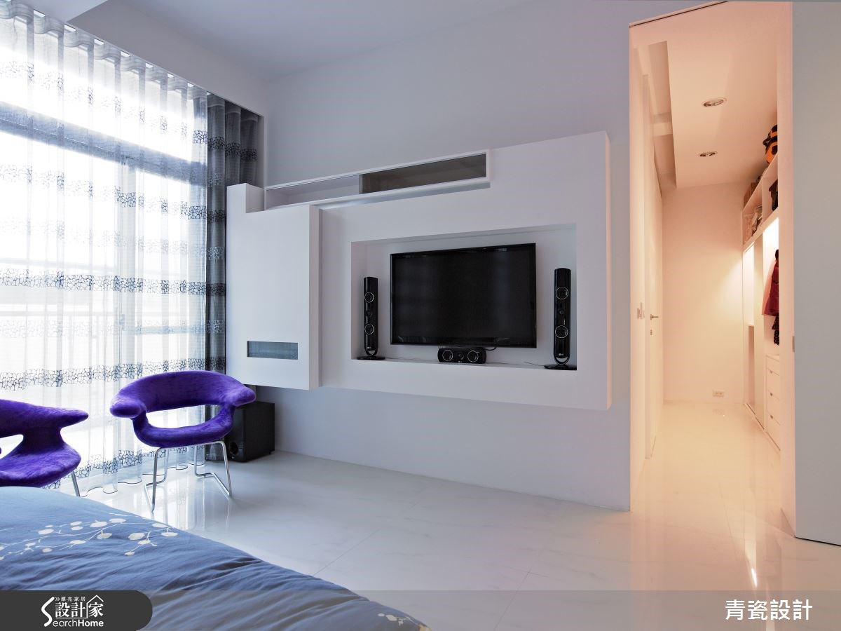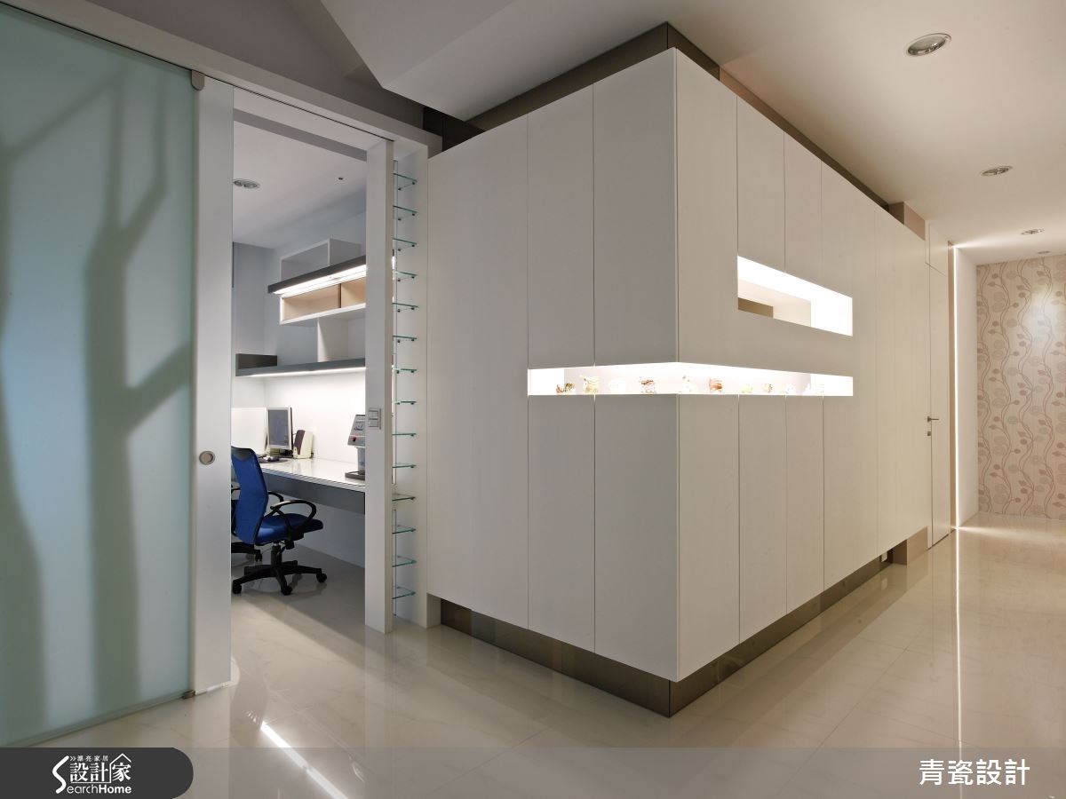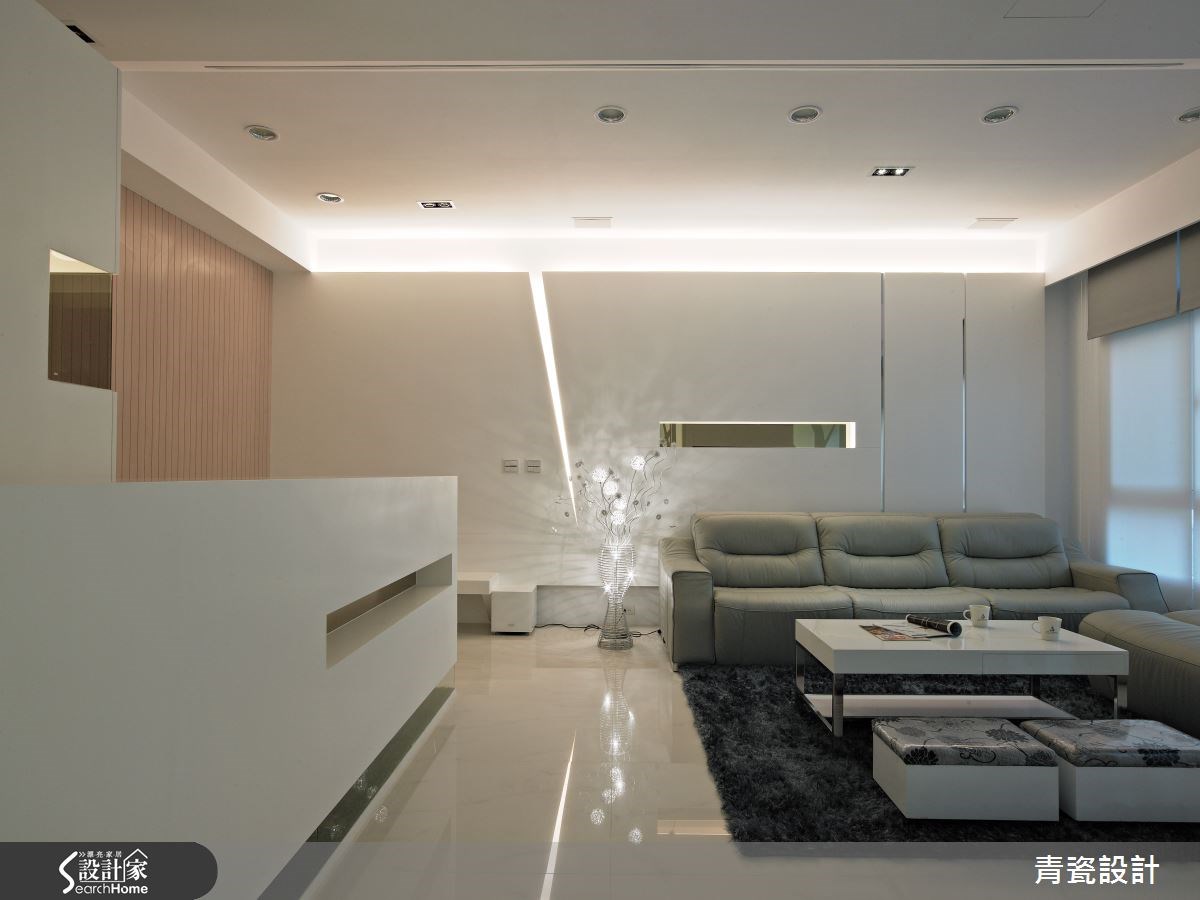 空间中共有5位家庭成员共同居住,设计师以清新净白作为空间的设计重点,同时为了与自然意象结合,设计师在柜子底层加入人工草皮,并藉由镜子反射,空间呈现清新氛围。【弧形隔断,安全又通透】入门后,可看见客厅沙发后的造型墙,以分割的斜线制造光透出的视觉效果,让客厅多了一道亮点。电视墙后方的书房特别用了弧形的玻璃隔断,柔化空间线条。同时并压上树枝倒影,维护行走安全不受碰撞,也让空间多了清新质感。 主卧室反而没有太多繁复的设计,回归平静的休憩时光,简单的床头背墙加上玻璃作为一整面的梳妆台;加上电视墙则以不同大小的块体搭配出层次感,扩充收纳和视听机能。女孩房中则做了小阁楼,打造出像公主住的粉红色城堡。