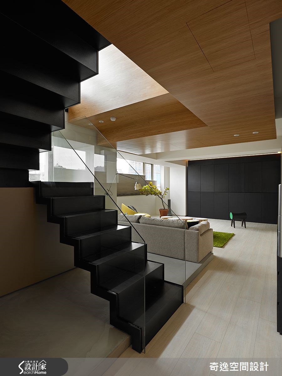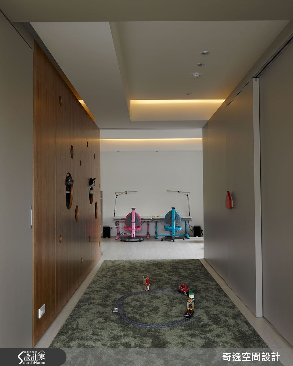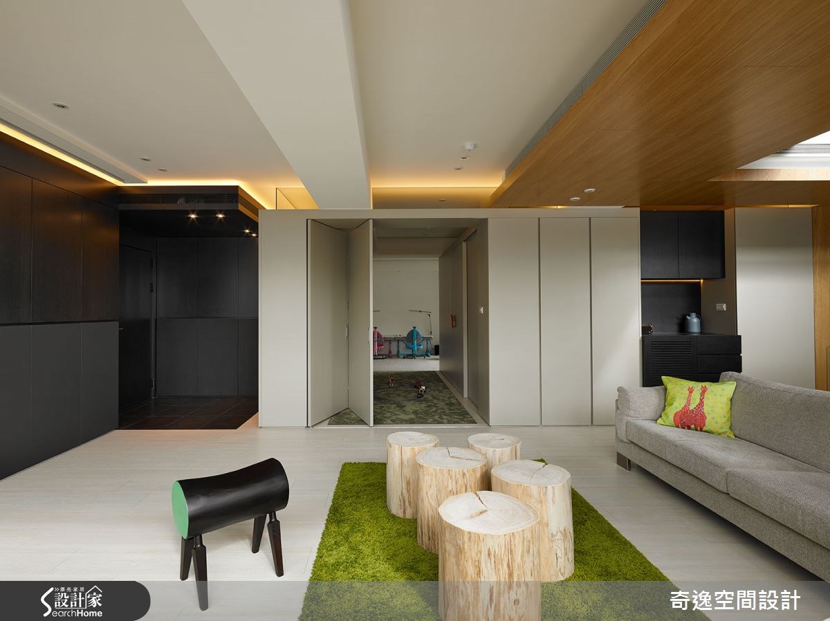 这户132平方米的现代宅中,居住者为一对夫妻和两名小孩,由于小孩年纪幼小,所以屋主夫妻格外重视亲子互动,期望未来同无论是在办公或烹饪,孩子都能在自己的视线范围之内。除了安全考量,也希望可随时担任孩子的伴读或玩伴。【透空格局,保有视觉联系】在4室2厅的格局中,设计师将餐厨、工作桌及小孩游戏室拉至上层,让屋主可在工作或烹饪时,让小孩安置在视线范围内;而在一楼空间格局上,则有着低梁问题,所以设计师采露梁方式,并在隔断添加透明的玻璃材质,让横梁减少压迫感,并可穿过各空间,增加视觉的延伸感。 走进家中,设计师以黑色沿面做出连贯感设计,串联起玄关与客厅,在灰黑色彩基调中,点缀轻盈色彩,营造出奔放年轻的风格,并舍弃电视墙设计,仅配置隐藏式投影布幕,以原木为桌几,人造草皮取代地毯等,让孩子远离电视,懂得亲身体验生活。孩子房以弹性门片做出界定区隔,将通道规划为小小的游戏区,同时于柜面上做出挖空设计,营造童趣画面;而公领域中透空的楼梯设定,也让上下楼可维持美好的垂直互动。