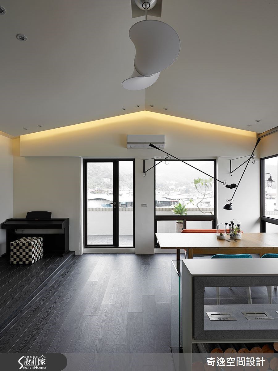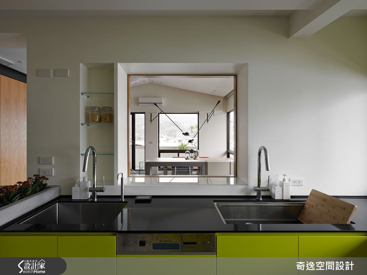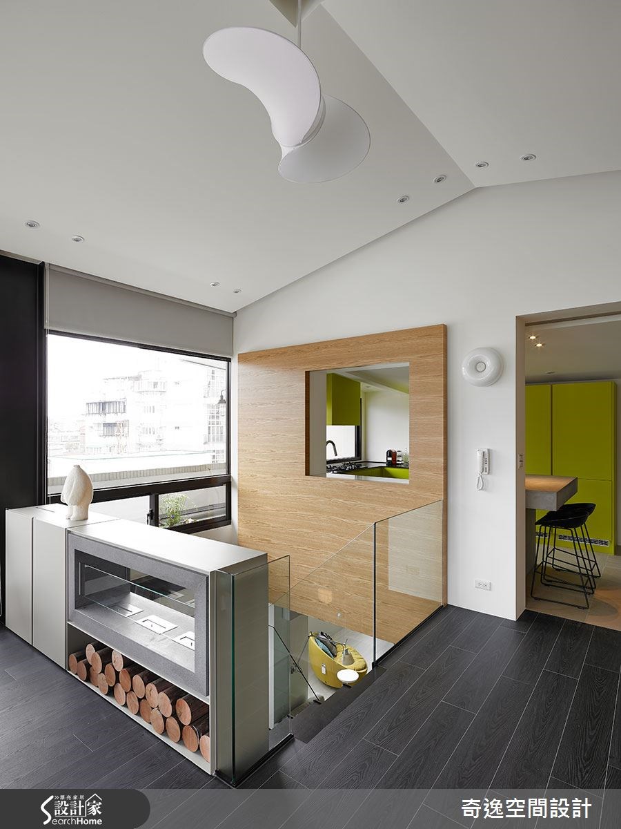 这户132平方米的现代宅中,居住者为一对夫妻和两名小孩,由于小孩年纪幼小,所以屋主夫妻格外重视亲子互动,期望未来同无论是在办公或烹饪,孩子都能在自己的视线范围之内。除了安全考量,也希望可随时担任孩子的伴读或玩伴。【透空格局,保有视觉联系】在4室2厅的格局中,设计师将餐厨、工作桌及小孩游戏室拉至上层,让屋主可在工作或烹饪时,让小孩安置在视线范围内;而在一楼空间格局上,则有着低梁问题,所以设计师采露梁方式,并在隔断添加透明的玻璃材质,让横梁减少压迫感,并可穿过各空间,增加视觉的延伸感。 走进家中,设计师以黑色沿面做出连贯感设计,串联起玄关与客厅,在灰黑色彩基调中,点缀轻盈色彩,营造出奔放年轻的风格,并舍弃电视墙设计,仅配置隐藏式投影布幕,以原木为桌几,人造草皮取代地毯等,让孩子远离电视,懂得亲身体验生活。孩子房以弹性门片做出界定区隔,将通道规划为小小的游戏区,同时于柜面上做出挖空设计,营造童趣画面;而公领域中透空的楼梯设定,也让上下楼可维持美好的垂直互动。