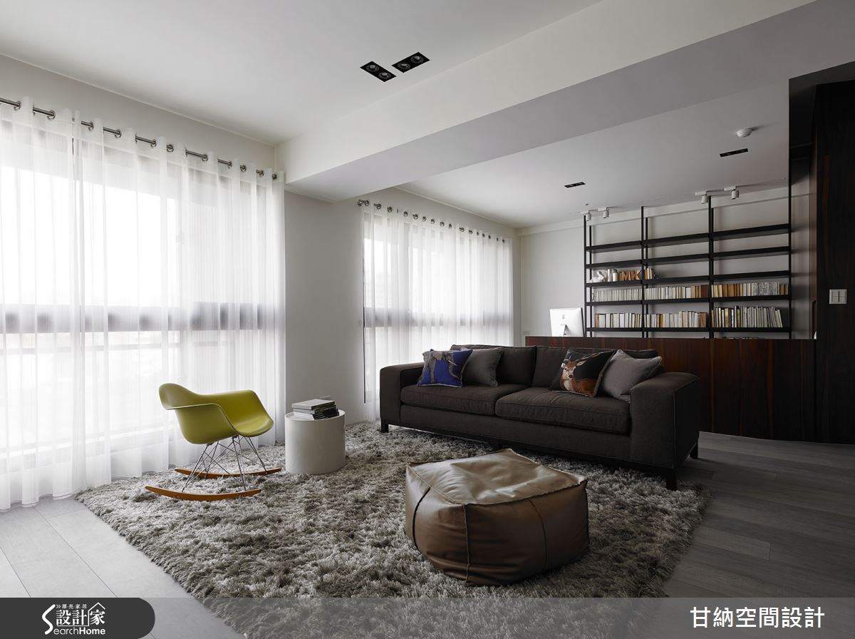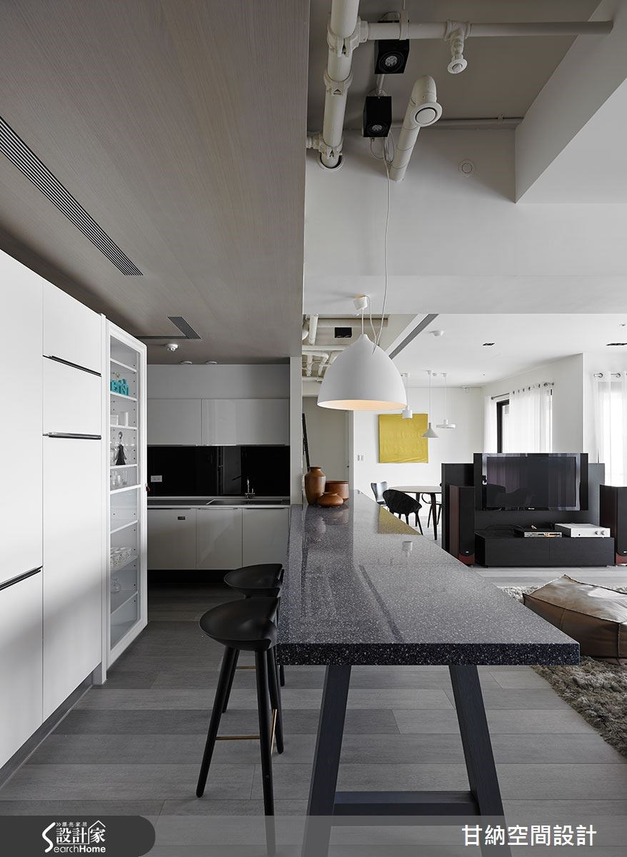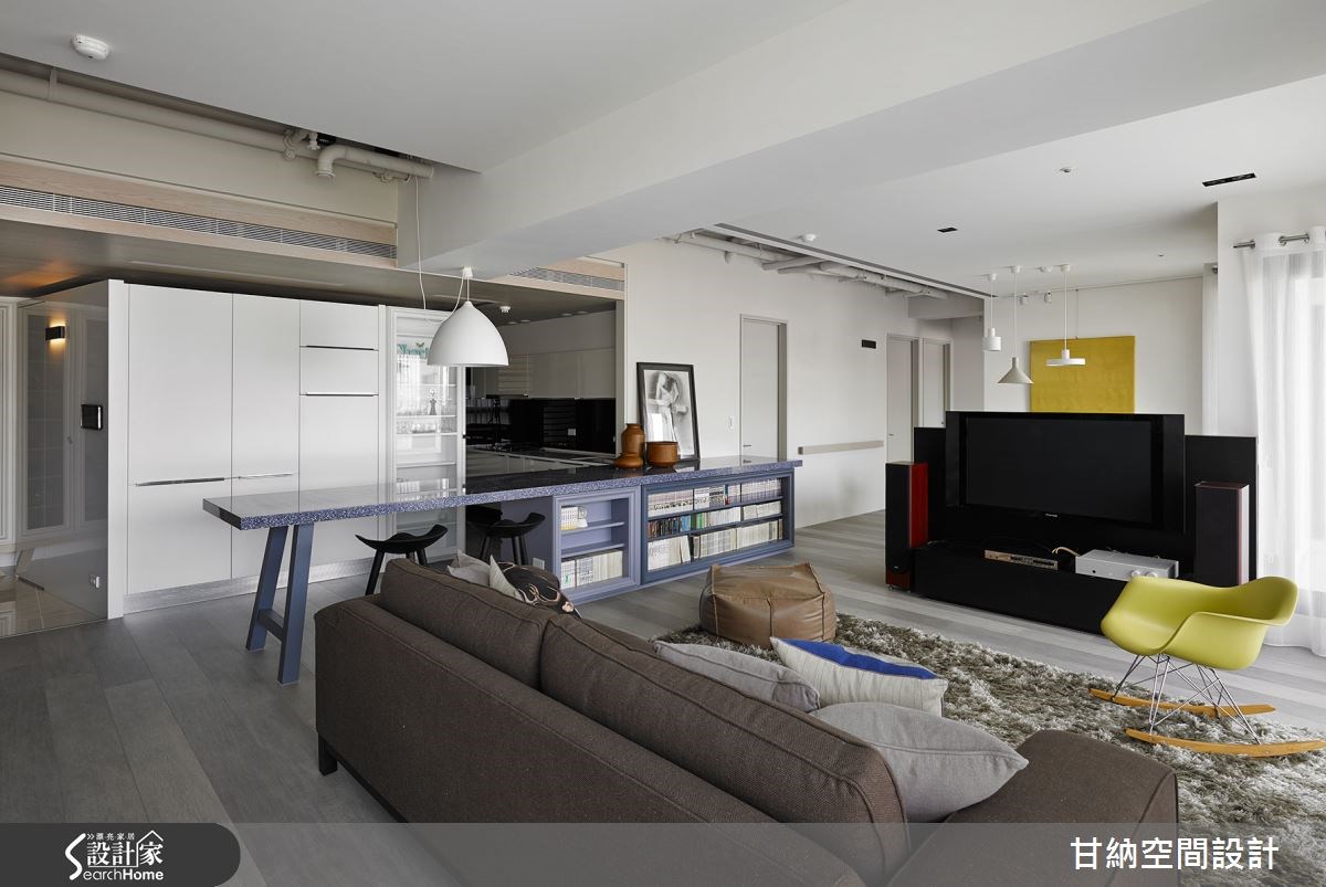 122平方米混搭风居宅,设计师保留部分天花板的管线设计,做出空间高低层次,瓦解屋宅大梁的压迫感,同时以实木木皮、家具色彩等拼凑出跳色的趣味;以一点点Loft、一点点简约感,打造出全家的清新居家生活。 【开放空间,凝聚一家人情感互动】走进家中,即以白色机能柜体强调收纳、照明等功能,满足了玄关与厨房使用者的需求;延伸入内,可见紫色加长吧台,不只是空间中的导引动线,同时也将客厅,书房、轻食区等归纳在同一侧,让彼此呈现不受阻的开放格局,让一家人在公共空间中可随时保有情感互动。【实木材质,让居家充满艺文气息】而沙发后方,则注入饱满而美丽的实木贴皮材质,围塑出专属的阅读空间,搭配墙面的悬吊铁书架,揉合了收纳机能与装饰美感,并将实木色彩延续至练琴区,整合成一区充满艺文气息的居家领域。