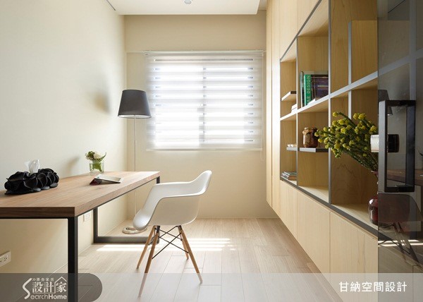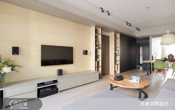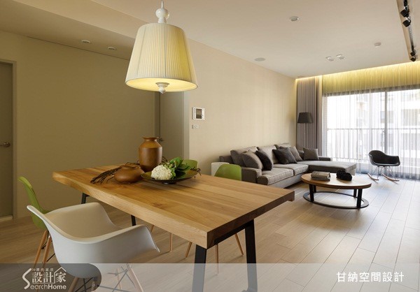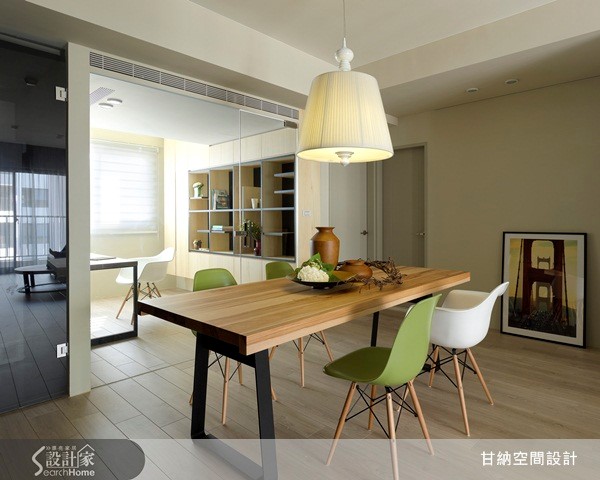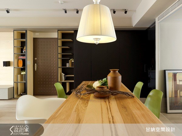 92平方米居宅,屋主喜欢简单休闲的居家气氛,期待下班回到家能体验到放松感,因此设计师除了在空间中注入收纳机能,也规划了半开放式的书房空间,同时在设计中融入孩子各方面的需求考虑,打造出3室1厅的理想居家环境。 【温润木质调,让空间更显舒适】整体以休闲风为基调,设计师透过沉稳的中性色调与木素材,搭配温暖日光,创造舒适而放松的休闲氛围,在客厅电视墙上,仅使用简单纹路的木皮,呈现出自然的木质调,并运用收纳柜立面串联起客、餐厅领域,从浅色背景游走到深色背景,巧妙做出领域划分。【透明门片,串联空间延伸感】餐厅区则以木质长桌、暖光吊灯与绿白椅交错搭配,营造出纾压清新的气氛,并将用餐领域结合阅读功能,成为屋主一家人共有的交流领域;而一旁的私人书房则配置透明门片,让餐厅与书房产生连贯通透的空间延伸感,共享美好日光,创造舒服、纾压的视野。