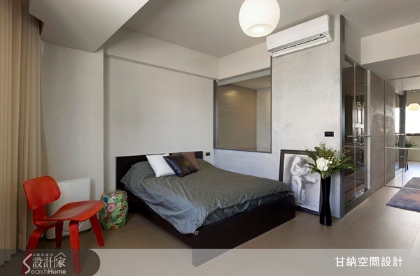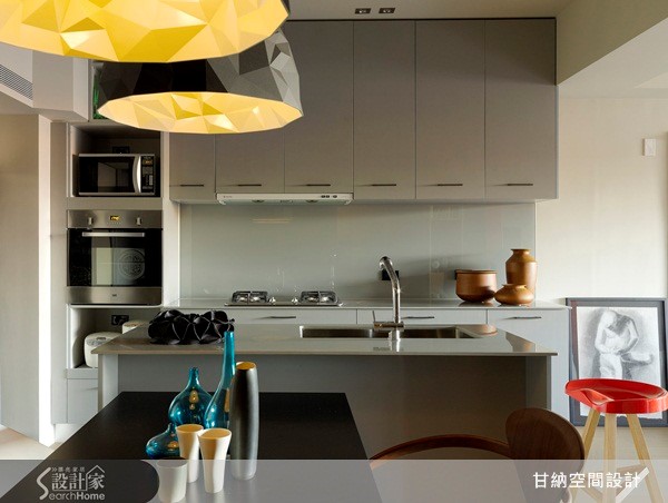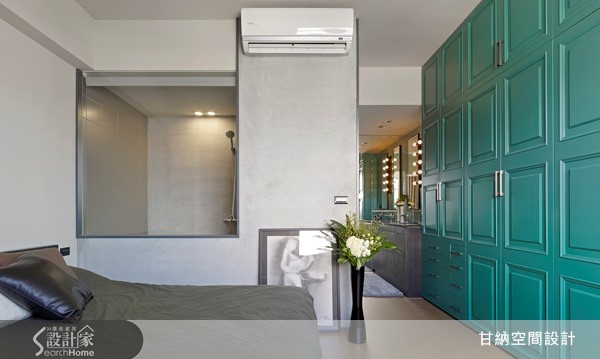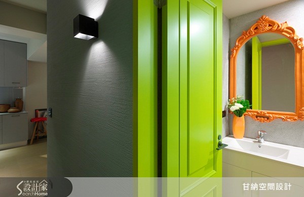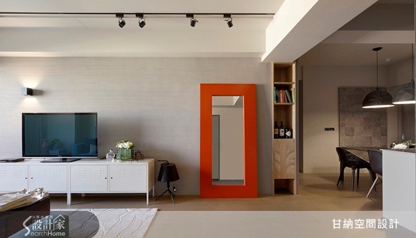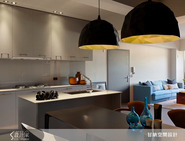 走进92平方米老屋重新改造的居家空间,全室以温和触感的木地板铺陈,搭配介于白与灰之间的低调墙面色彩,以及轨道灯打亮氛围,为空间营造出温暖怡人的情调,同时也让居家空间成为挥洒色彩的画布。【多元色彩搭配,丰富空间表情】在中性低彩度的空间基础上,设计师运用蓝色沙发、橘红色镜框、鲜草绿浴室门、以及令人赞叹的整面蓝绿色衣柜,再搭配具有复古质感的客厅木箱茶几,还有微带工业感的水泥粉光材质,让人彷佛像是走进当代装置艺术作品中,却又能感受到舒适自在的居家生活质感。【屋梁为基础,自然划分格局】而在格局与机能的规划上,由于房屋本身的横梁多,因此设计师以屋梁的位置为格局基础,运用开放式手法来规划客厅、厨房与餐厅区域,结合厨房流理台、中岛餐桌、电视柜及灯光安排,不但化解了原先的压迫感,更让屋梁形成自然的几何结构,增加了整体的造型层次。