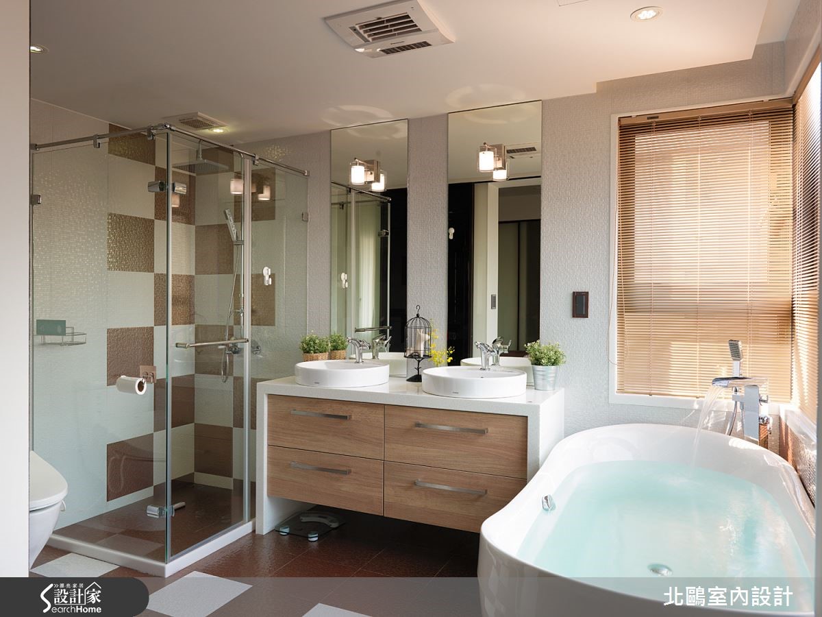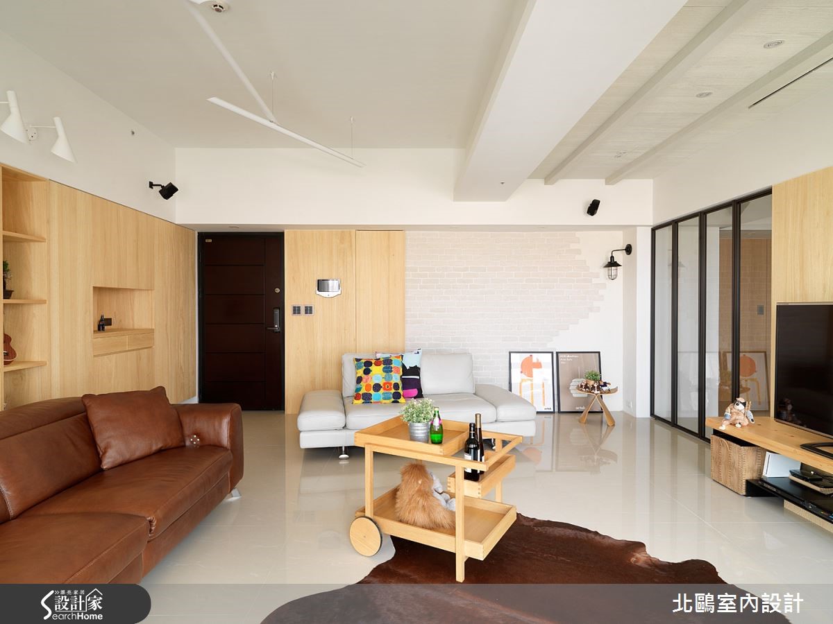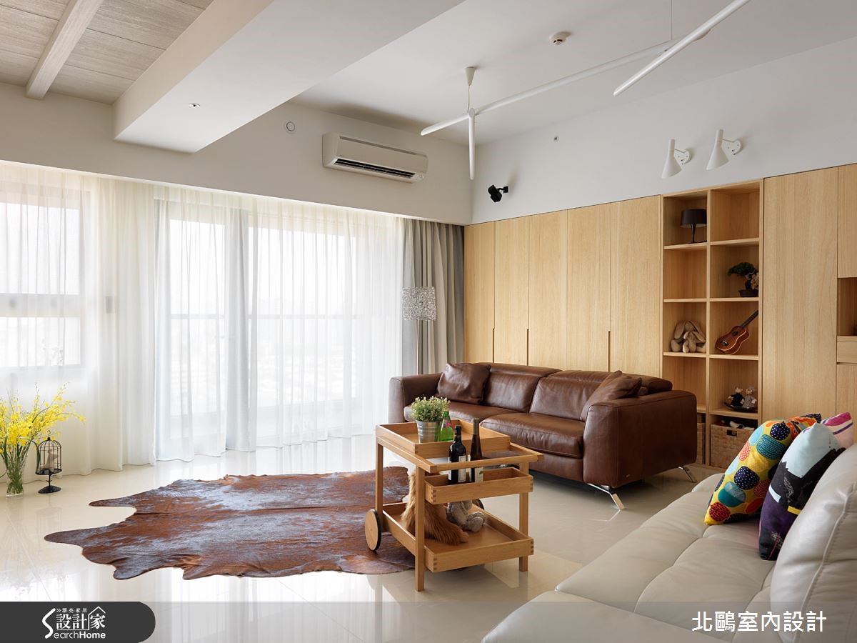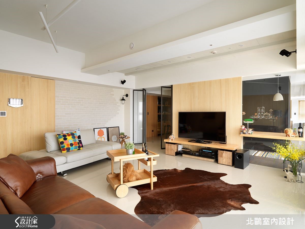 屋主一直希望可以透过北欧风,打造纾压放松的空间调性;于是,设计师在132平米的空间里,引入明亮的采光,让日光随意挥洒,配上双色沙发、跳色书柜、方正格子设计的床头,在北欧风常规之外展现率性作为。【木质与日光互衬托,自然就是美】简约的色调搭配些许缤纷的软件,富有趣味的色彩增添了居家的生活感,体现率性不造作的北欧风格。从大门一进来,便可看到客厅墙面上多种材质的变化,木材混搭文化石墙,使入口视野更丰富。深褐色的皮质沙发注入了一股人文质感,沙发背墙后方为机能满满的收纳展示区,温润的浅木色消弭了柜体的沉重感。双色沙发搭配可移动式的客厅用桌,轻巧可随时移动的家具机能,提升空间效用。用餐空间利用灰镜隔断作为交界;灰镜的特性释放出空间的宽阔感,又能阻隔油烟四溢的问题。餐厅的一墙面使用黑板墙打造,缤纷的图像是孩子们用彩色粉笔画出的童趣创意,同时又可作为全家人的留言板。进入主卧,来到一整面的书柜,黑与白的对比跳色手法,单调墙面赋于特色,也丰富主卧的收纳机能,方正的格子设计层层堆栈作为床头设计,巧妙的点出居家创意。