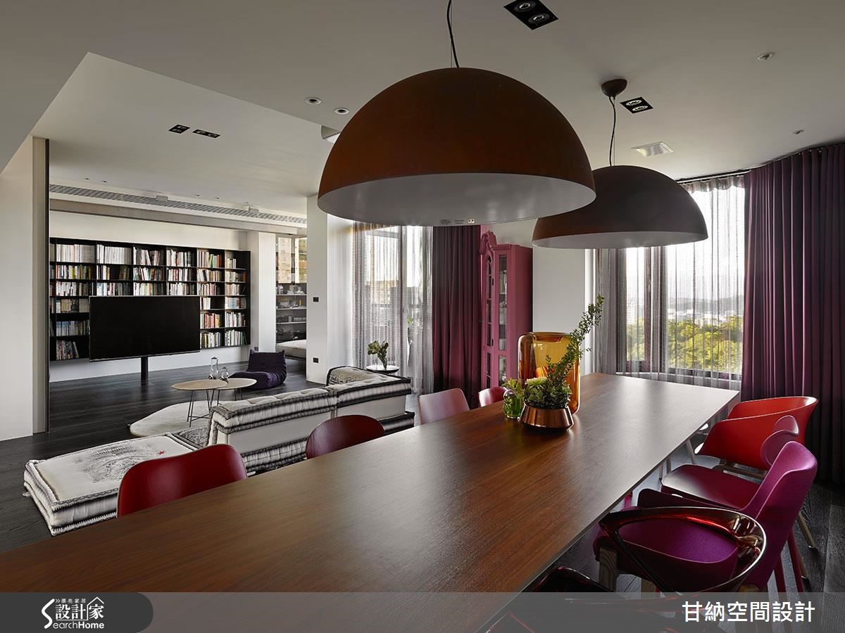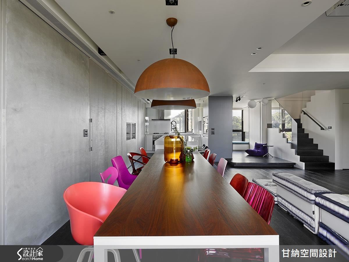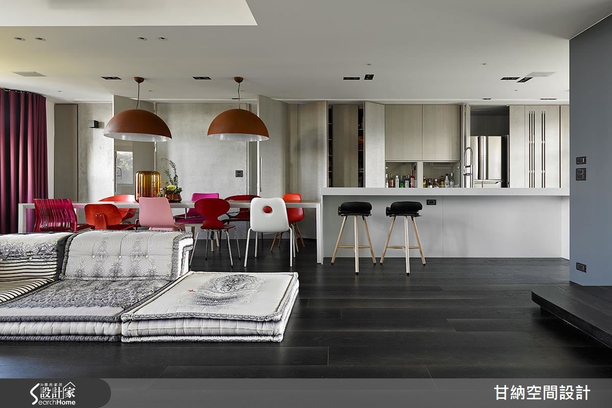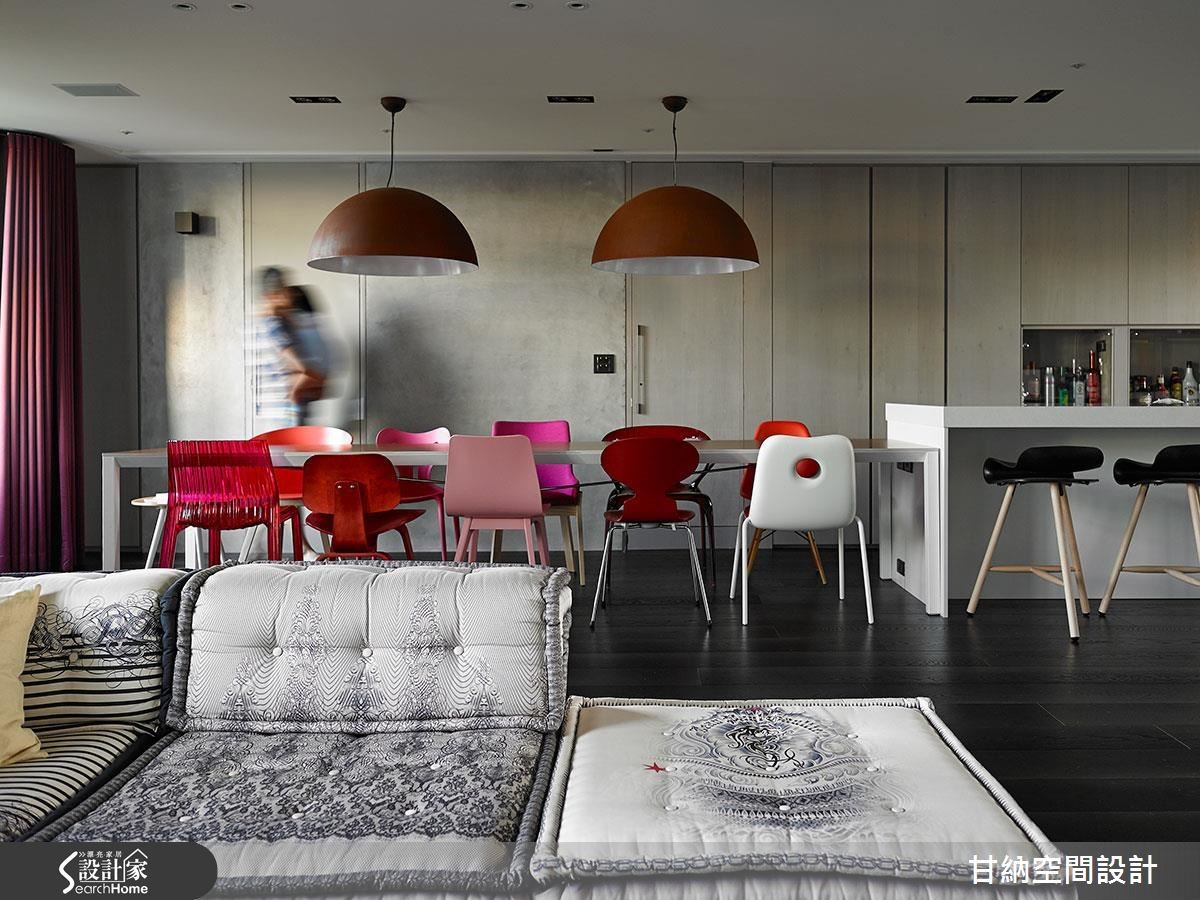 191平方米的空间,设计师以宽阔的开放格局,搭配大面积的观景窗,让人回到家就能够感到心旷神怡的居住氛围,成为屋主心目中Loft感的现代摩登宅。【深灰色地板,让居宅呈现质朴感】全屋以深灰色地板作为空间底藴,予人温润舒适的气息。客厅的电视墙以整面的书柜为主,不仅满足收纳需求也让阅读的兴趣成为屋中的风景之一,而拥有中东风情的无底座图腾大型沙发床则依地摆设,让人感觉更为自在放松,也透露着屋主对生活质量与态度的要求。【白色与金银两色打造摩登料理空间】客厅后方则是开放式的餐厨场域,以白色与金银两色为主,营造清爽干净的料理空间,一旁的中岛吧台则延伸成十人坐的长型餐桌,搭配多变造型与不同颜色的设计餐椅,成为空间中吸睛的视觉焦点,随着垂吊的深褐色半圆吊灯的衬托,让用餐时光充满设计感与趣味性。