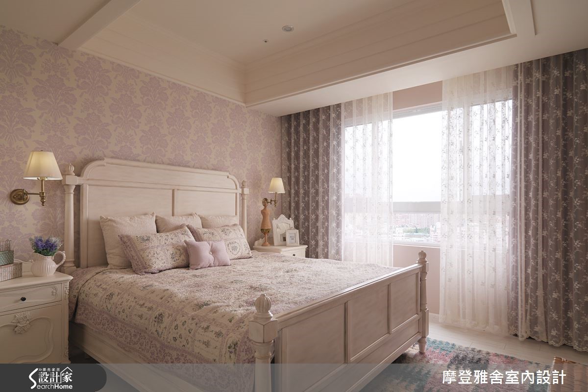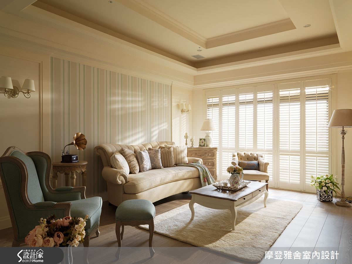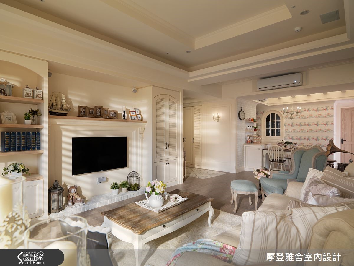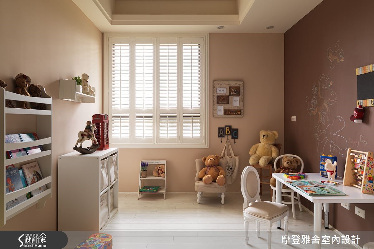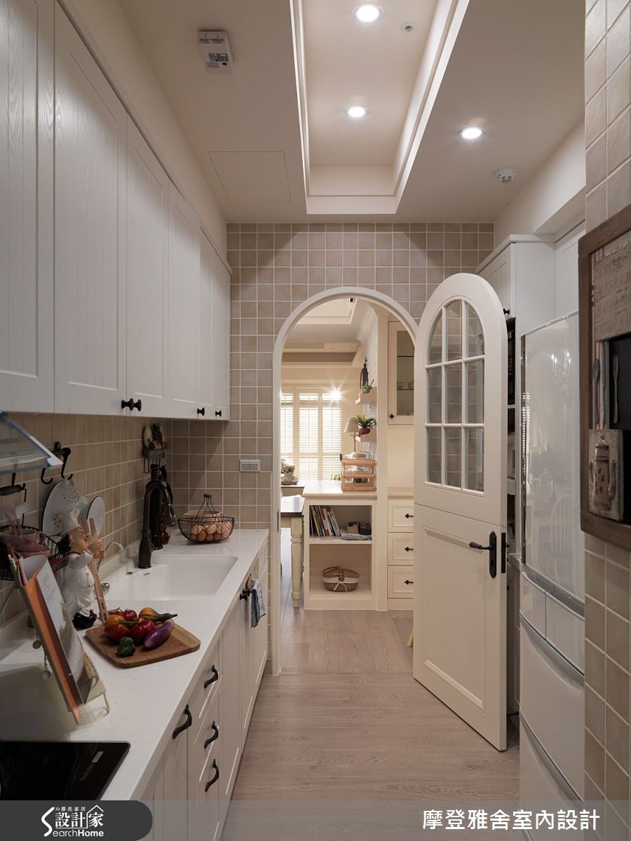 女主人长期生活于国外,并从异国飞回台湾,与白领男主人结婚,两个人一起在这个家编织出美好的生活样貌;同时也找来了设计师,在居宅内注入乡村风语汇,融合体贴人性化设计,规划两人的梦想居家!【利用色调与墙纸,搭出立体层次】走进空间,即可见地面花卉图案瓷砖,简单地做出玄关领域定义,放眼望去则是拱门设计,形成温馨风景;客厅呈现浓郁柔软的香草色调,于天花板、线板、柜门展现立体层次,墙面采用轻浅而柔和的墙纸,衬托一股清新味道。【通透场域规划,流动自然采光】并在客厅窗前规划百叶折门,引进户外的暖洋洋日光,透过一张座椅、几道光影,营造让人回味无穷的温柔意境;厨房则配置格子门,与餐厅做出分界,餐厅旁则是孩子们的游戏室,规画大片的清玻移门,使采光得以流通于各角落。【以可挪动家具,赋予弹性生活】游戏室内设计一幅黑板墙,绘出一家人的生活记忆,里头则陈列随时可挪动的家具,替领域未来的使用主题增添可能性;来到主卧,则以墙纸、窗帘等注入轻柔色彩,搭配的床架寝具也与空间调性相呼应,完美展现居住者性格!
