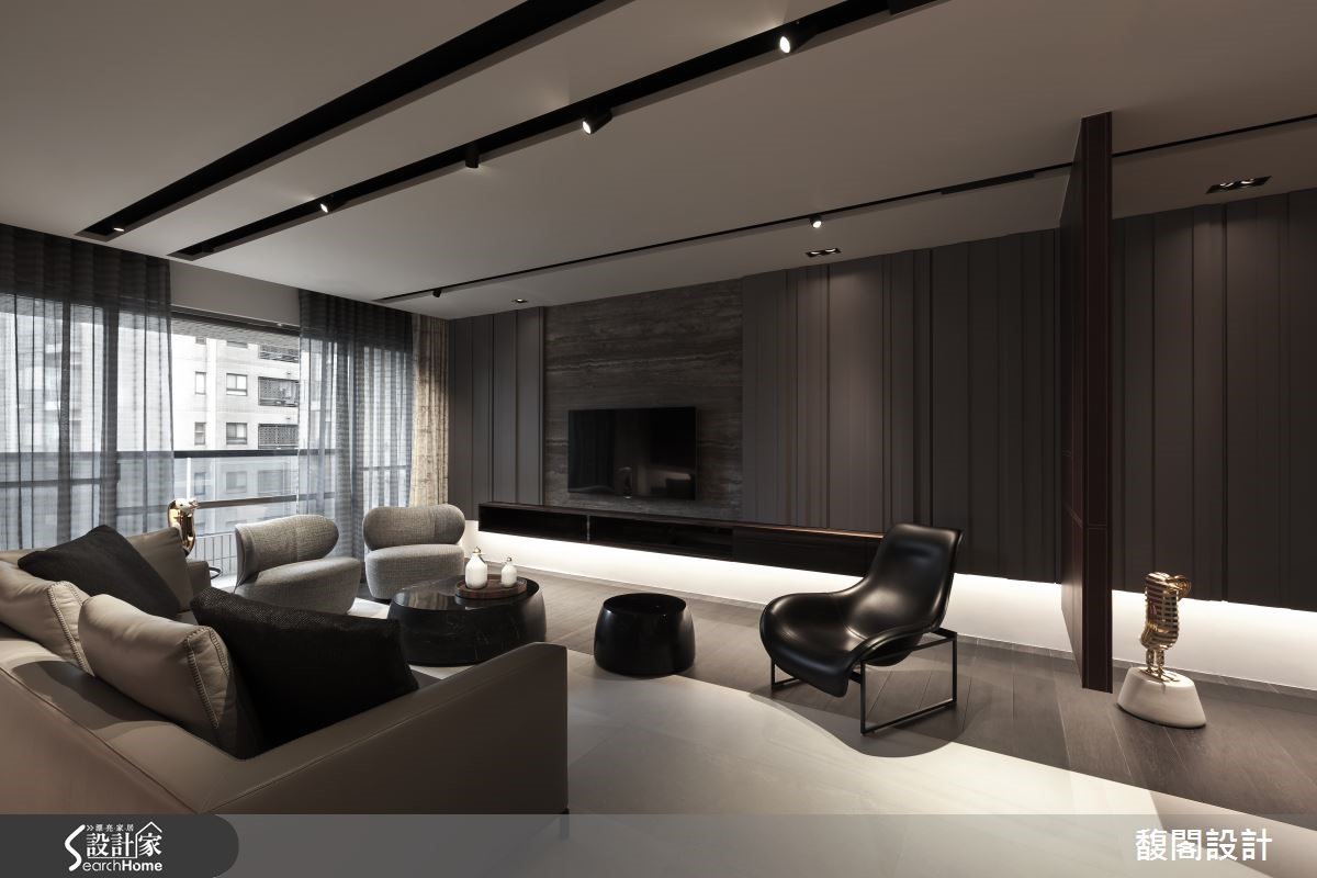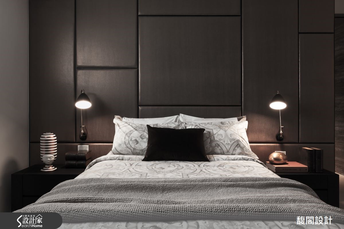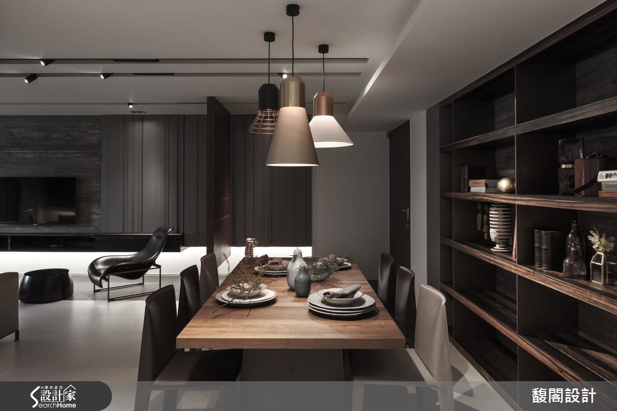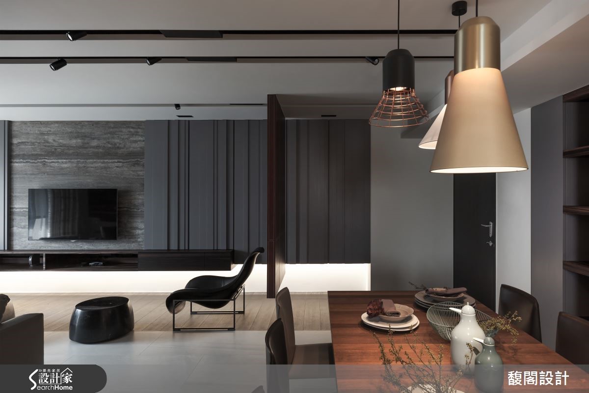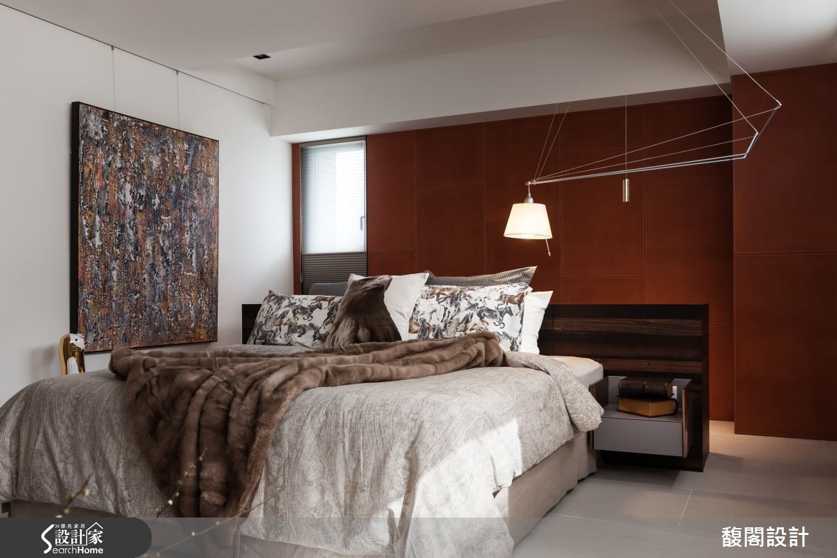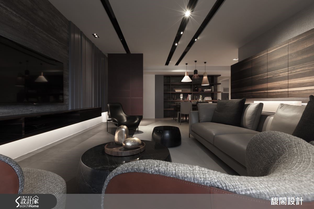 怎么样的生活气息会充满着如巧克力般的丝滑甜蜜呢? 132平方米的中古屋,设计师以多样化的建材与具时尚元素的家具相搭,让住家自然透露奢华精品的生活质感。 【悬空柜和灯光,打亮沉闷重色宅】玄关部分以深咖啡皮革的面板作为屏风,望去像浓郁的巧克力砖般柔滑,同时搭配白金相间的艺术雕塑品,为空间增添艺术感与质感;而悬空的设计也让屏风在视觉上显得轻盈而不厚重。客厅电视墙采用大理石材,让细腻石纹对应着沙发背墙朴拙的实木肌理。开放式餐厅以整面实木柜与长型木桌成为空间背景,搭配几盏垂吊的造型灯饰,让精致的工艺之美自然融入木作质朴之中。长型厨房则以大理石台面结合镜面,营造出轻奢样貌。主卧延续着公共空间的调性,床头墙面以深咖啡色绷皮作拼贴,佐以简约线条的灯饰与艺术品,铺陈出高雅品味。另一间卧房则以白墙引出清爽感,床头后方则是咖啡色皮革背景的工作区,搭配从天花板曲折而降的吊灯,趣味又有设计感。