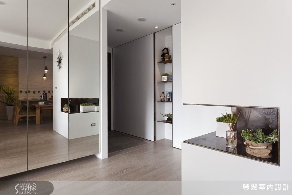 屋主两人很爱买鞋,因此设计师在玄关打造了大鞋柜,活动式的拉门还可以露出中间的展示平台,让屋主收藏品适时露脸。由于进门就看得见餐厅,设计师连接玄关打造了小储藏室,成为杂物主要的收纳区,并以木格栅隔开进门见厅的视线。