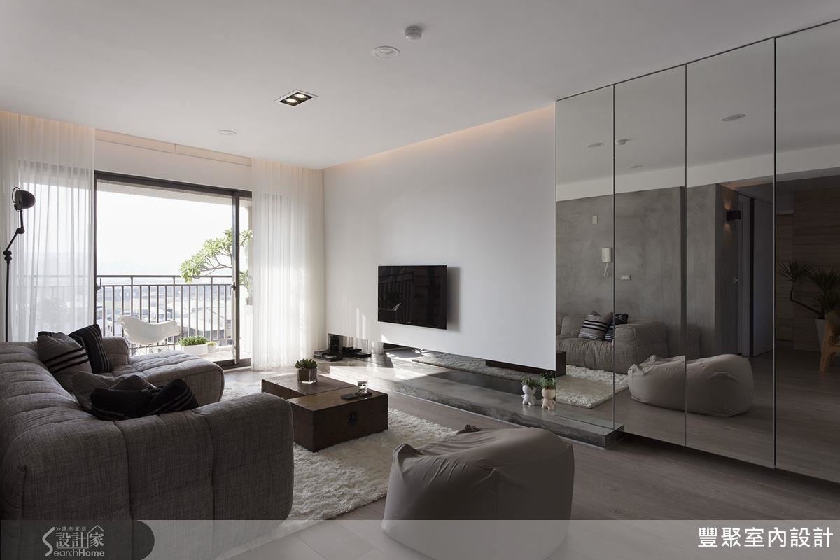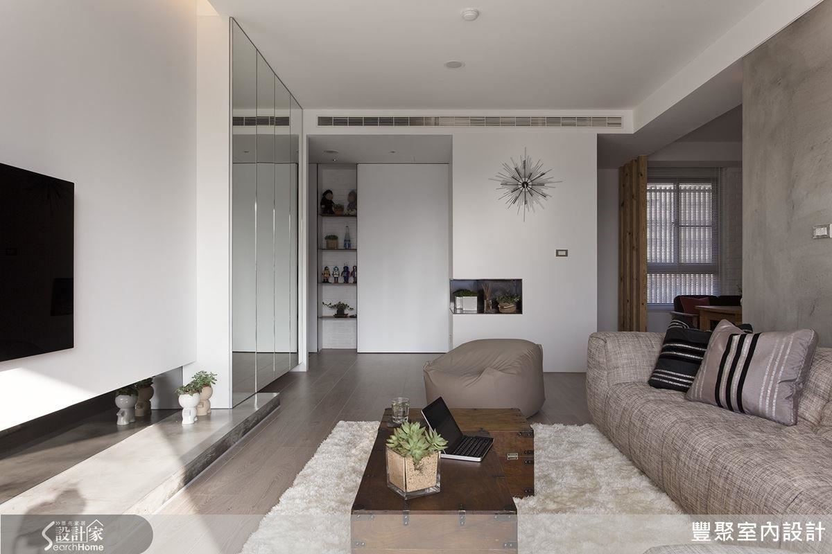 电视墙只以白色喷漆,将电源线路全部藏在墙后,并以低矮的水泥平台当作电器柜,呼应沙发背墙的水泥质感,呈现自然的色泽。不做多余的木作柜体,节省费用,以铝框门片加镜面的组合柜,让电视墙有两种变化,也藉镜面扩容。