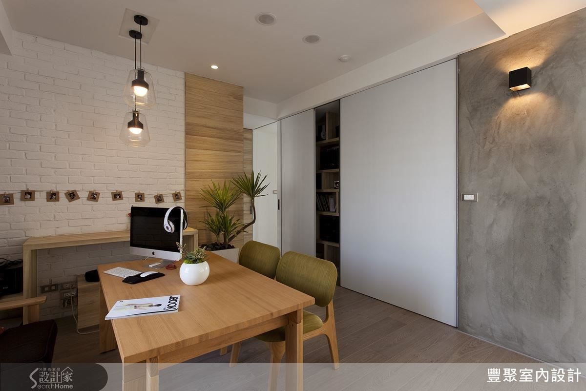 跳色的沙发柔软舒适,木质餐桌自然温润,梧桐木结合文化砖墙是屋主的要求,让饮食及阅读的空间更有人文品味。书柜活动拉门门片一体成型,巧妙隐藏了两扇分别通往厨房与主卧的入口,而门片移动后就能发现中间的展示空间。