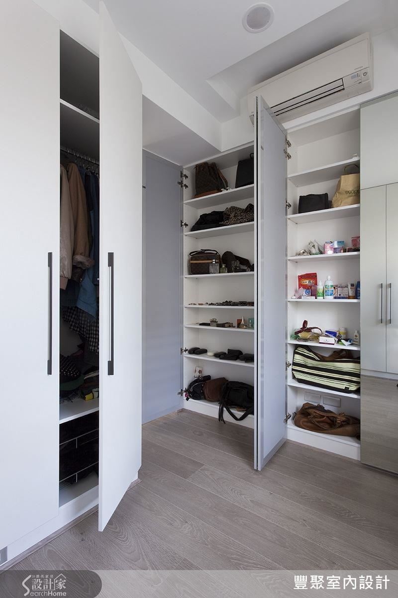 屋主不考虑生小孩,因此除了主卧,另外一房就完全打造成更衣室。主卧不必为了收纳考虑,拥有较大的空间,增添休闲及舒适感;而更衣室则以组合柜设置大衣橱及梳妆台,机能十分完备。