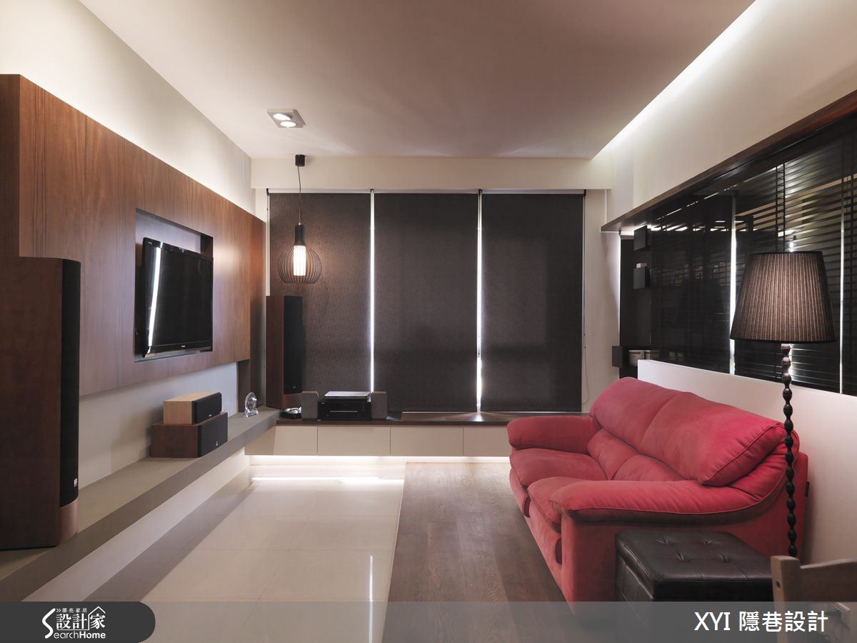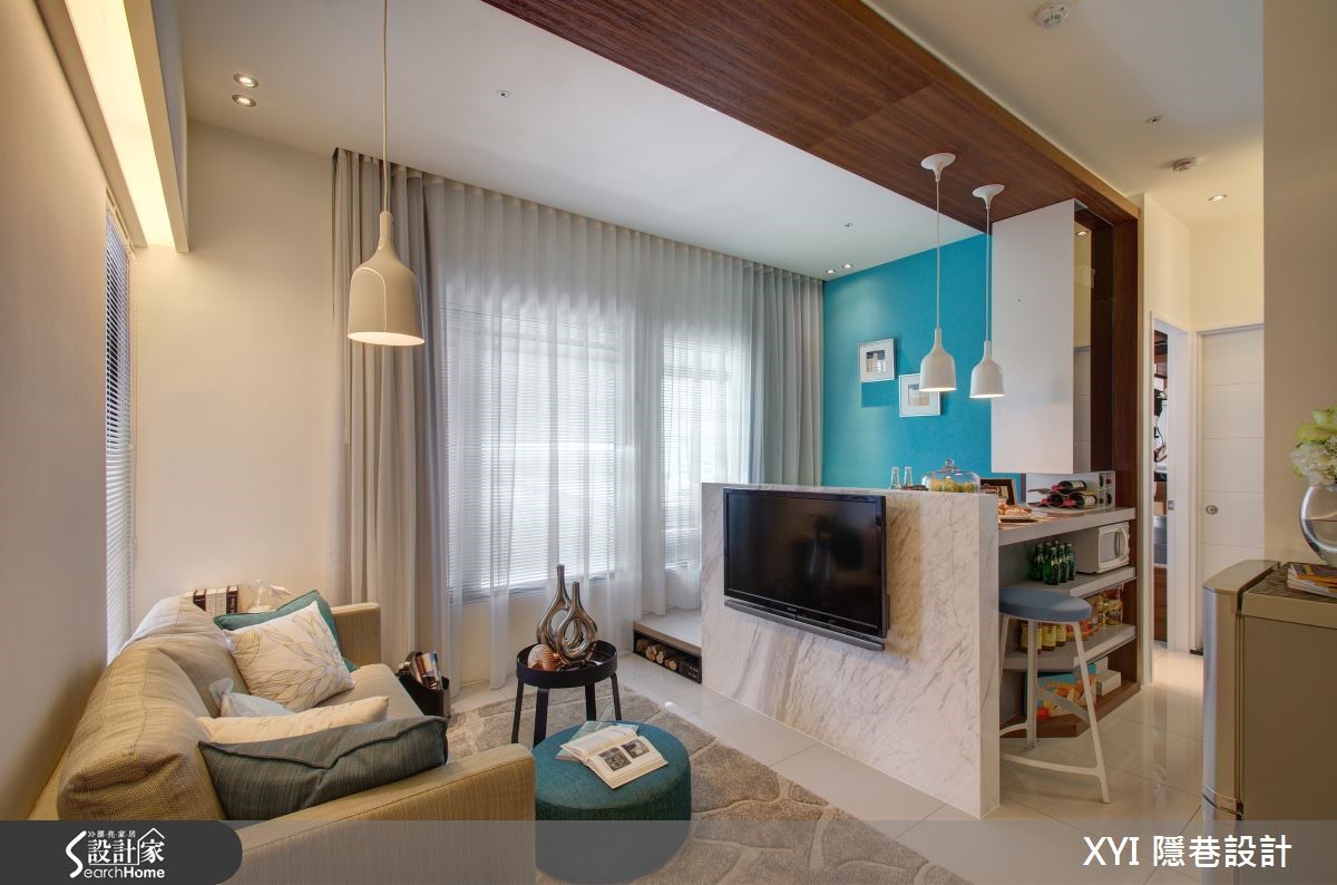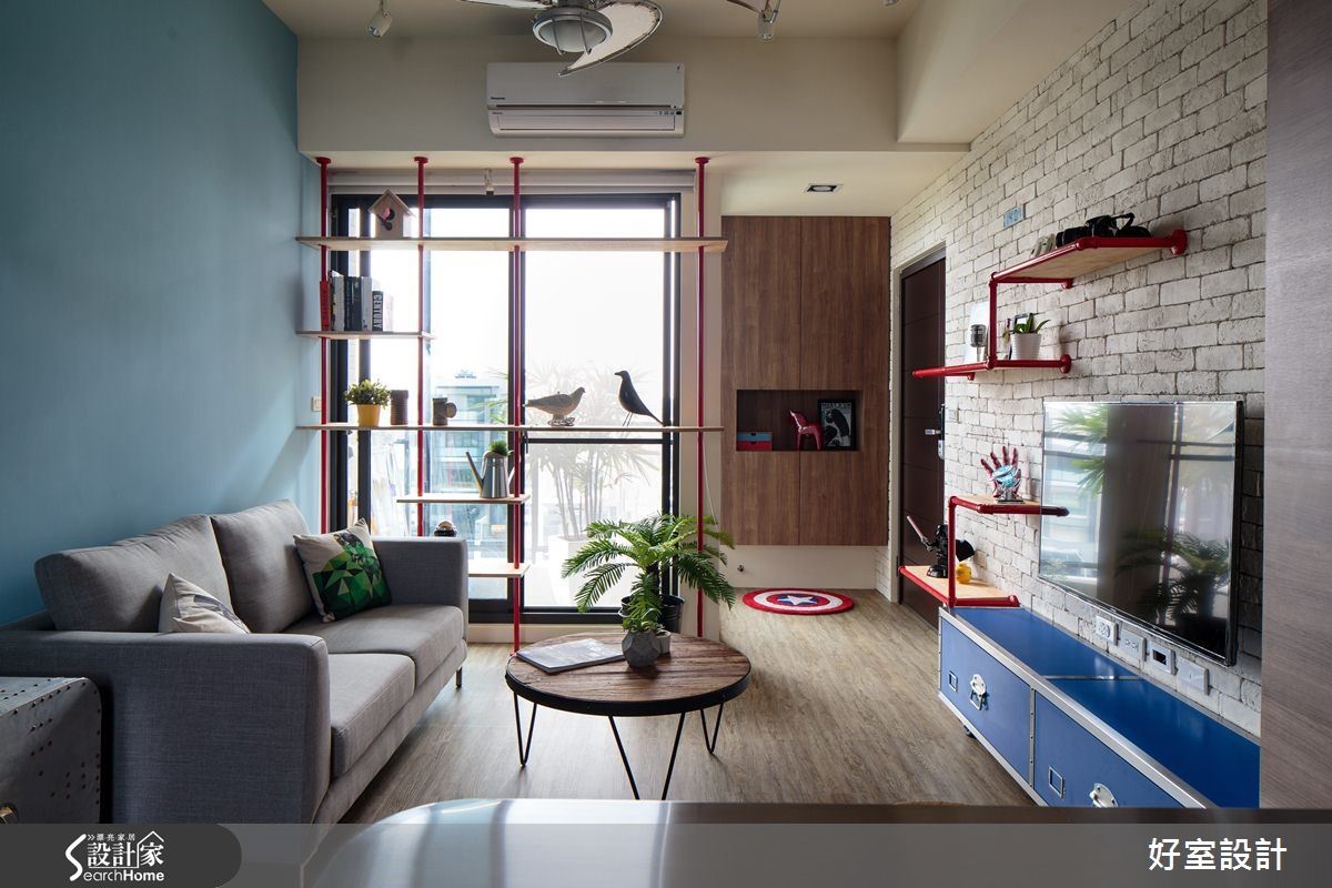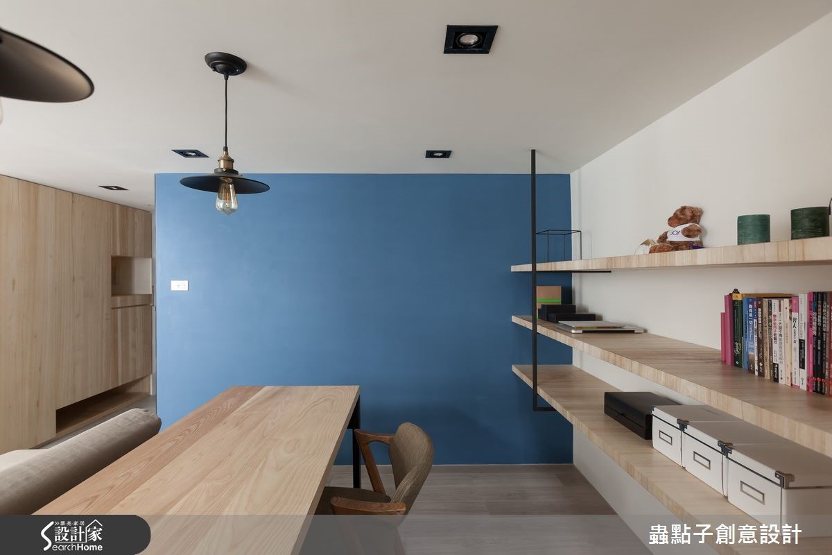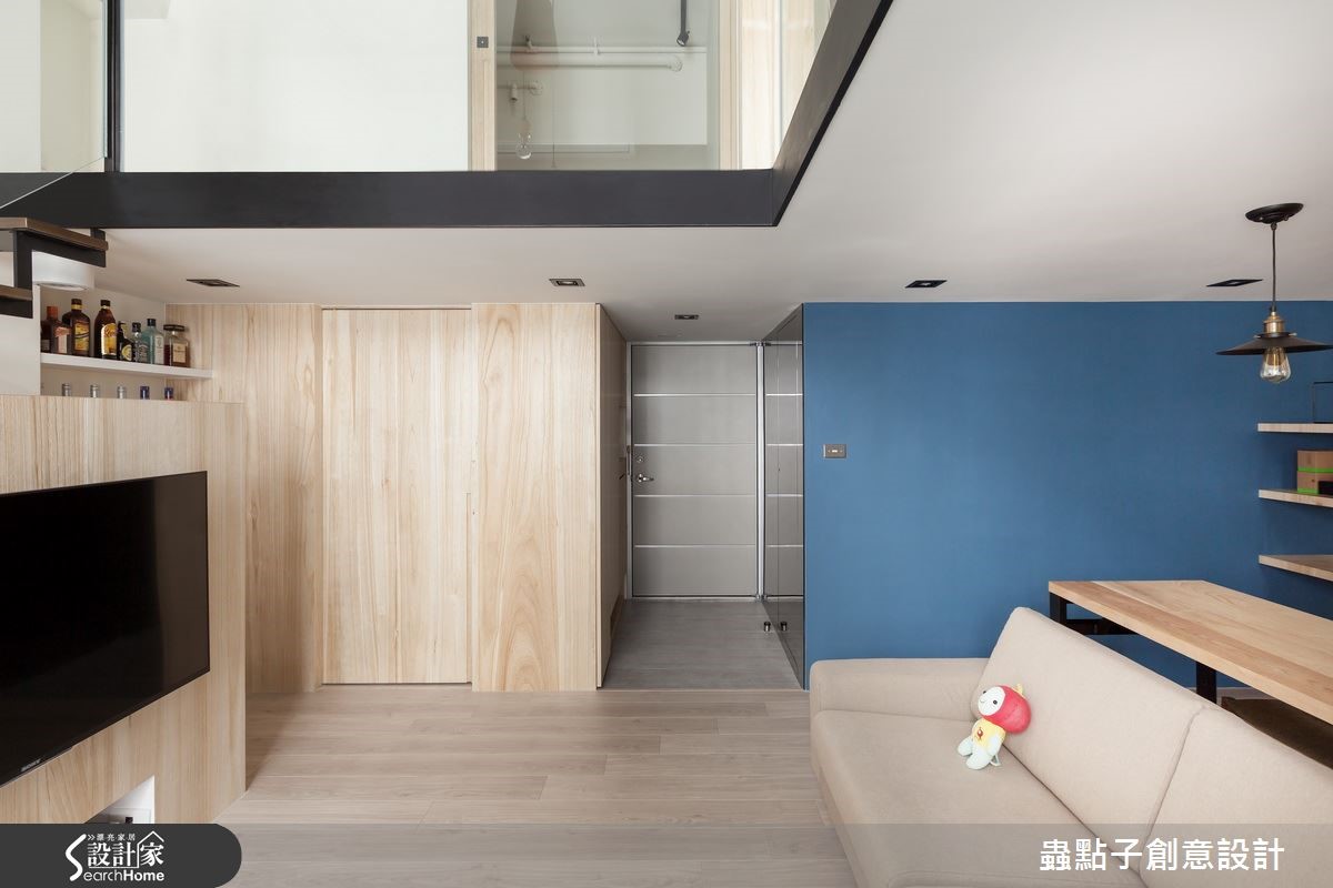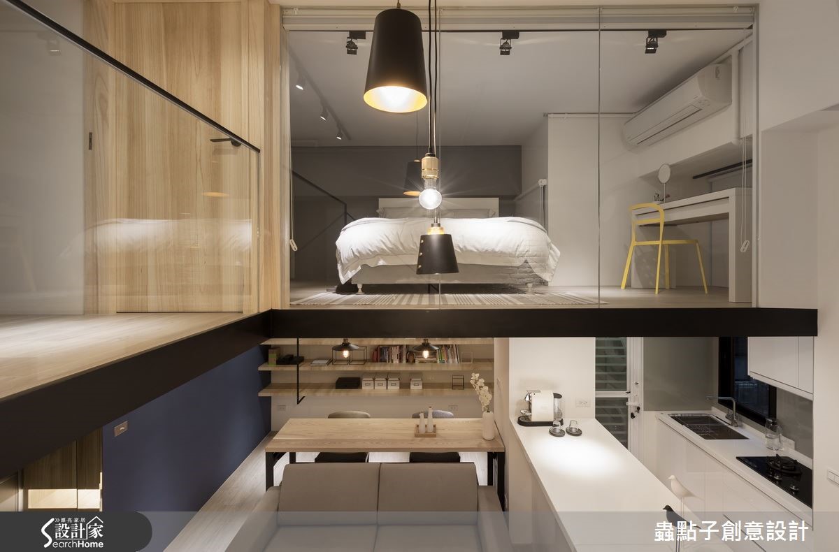 40平方米的二手房跃层,屋主是从事网络产业的年轻夫妻,希望可以将此二手房重新装修为带有工业风格气息的居家环境,同时希望在小空间内仍然拥有足够的收纳机能与阅读空间。看设计师如何巧手改造,化二手房为个性宅吧!【格局重整,完善机能生活空间】一楼部分以开放式的客餐厨机能为主,除以浅色木质元素作为主要建材,塑造出清爽舒适的氛围外,位于餐厅的蓝色墙面则散发着舒服而温柔的气息;衔接蓝色墙面的木层板,让屋主慢慢堆砌属于生活中的回忆,形成美好的视觉风景。结合铁件、木板与玻璃的楼梯则设置于电视墙后方,以清透的视觉感串连上下楼层,同时运用整面的文化石墙为空间增添温润放松的氛围;而楼梯下方则成为收纳区域。跃层空间规划为较私密的卧室、更衣室与书房,并延伸玻璃材质成为墙体帷幕,打造出无视觉隔阂的空间感,同时亦能与位于下方中岛吧台的人互动有无,光影交错。