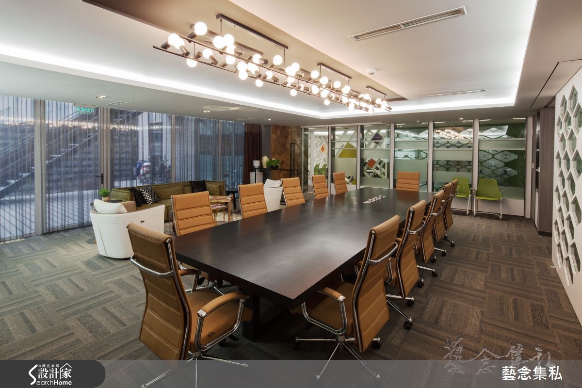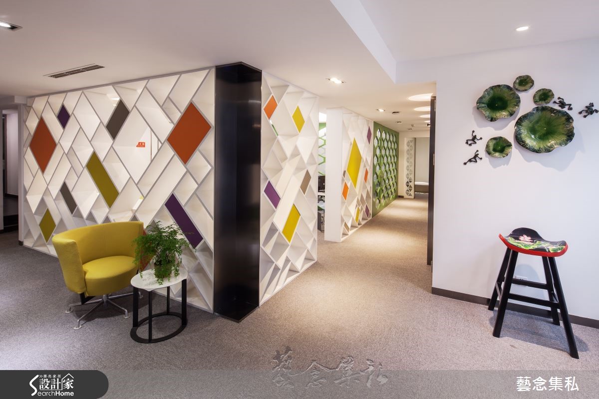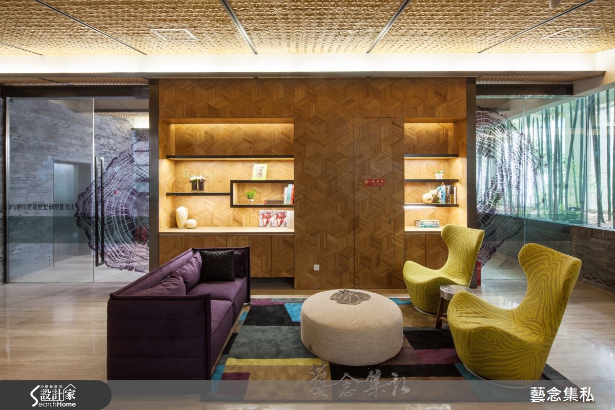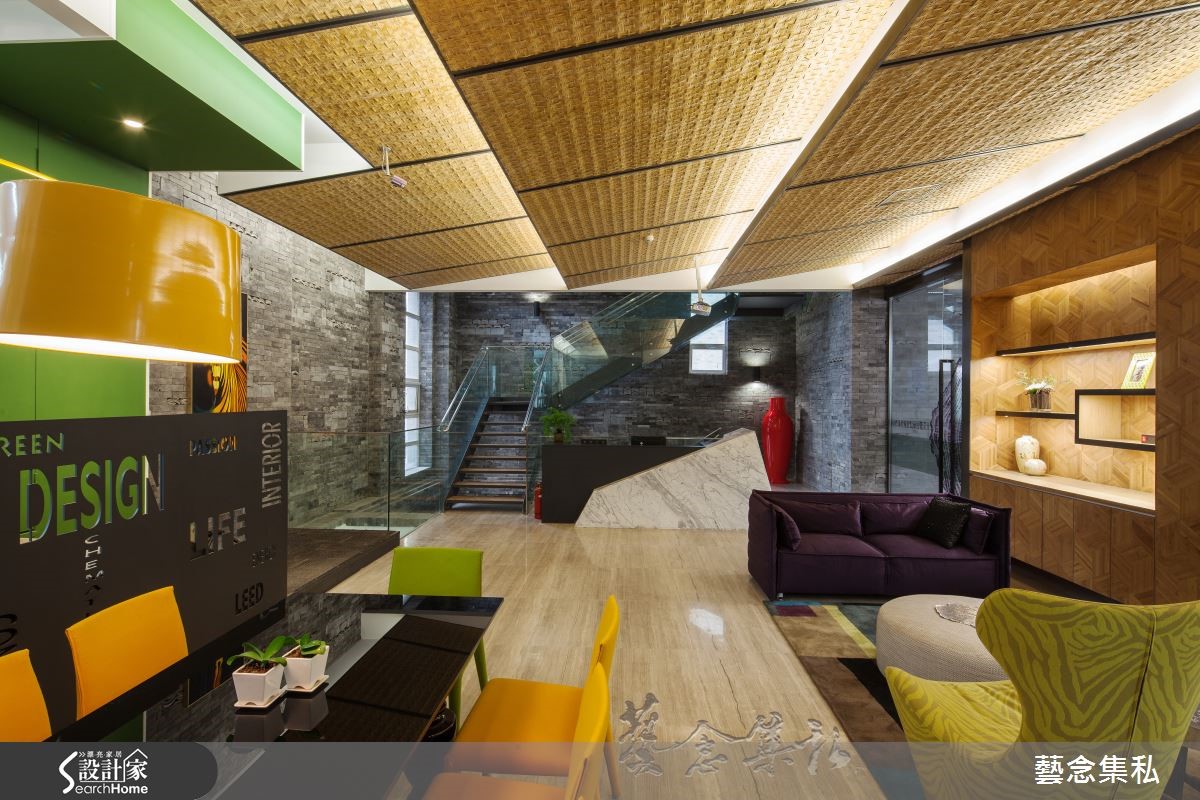 此间超过四百平方米的写字楼空间该如何完美设计与搭配,才能降低大坪数的冰冷感呢?设计师选择擅长的混搭风手法,利用各式媒材的层次堆叠,完整地展现出材质的特色与朝气。【层次混搭,创造大器艺术氛围】接待处用铜色的矩形铁件拼贴出磅礡气势感,让接待大厅为宾客创造出雄伟壮大;用竹片构成的天花板,以层递的手法赋予具有层次感的印象,用特殊窑烧砖块砌成的砖墙,每块砖的纹路与色泽都代表着具有艺术质感的调性,透过每一块砖酝酿出丰富的人文底蕴。【跳色家具提升空间活力意象】等候区运用大量跳色家具营造出活力气氛;收纳书柜透过层板打造出菱形造型意象,再佐以色块诠释出完美的和谐比例;写字楼空间则以白打底再添加撞色系,营造出愉快活泼的空间气息;大会议室则以沉稳的褐搭配黑形塑出静谧的舒适感,符合会议时的沉淀意象。