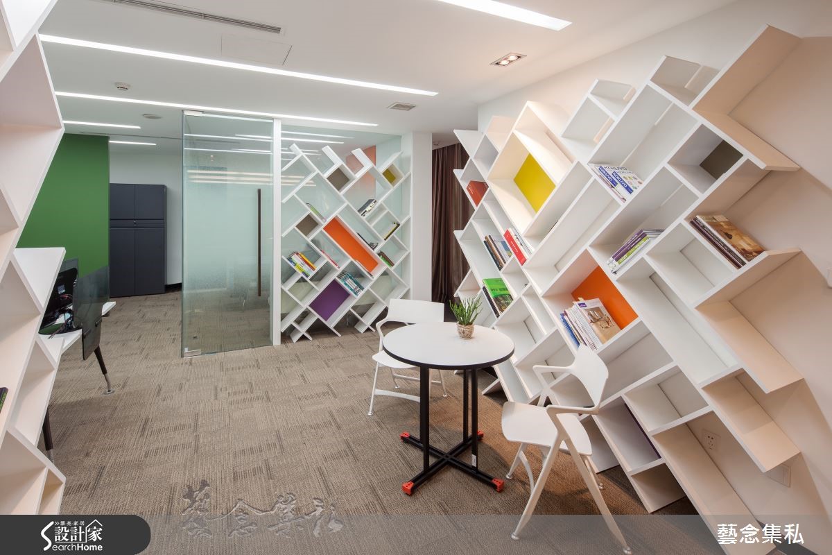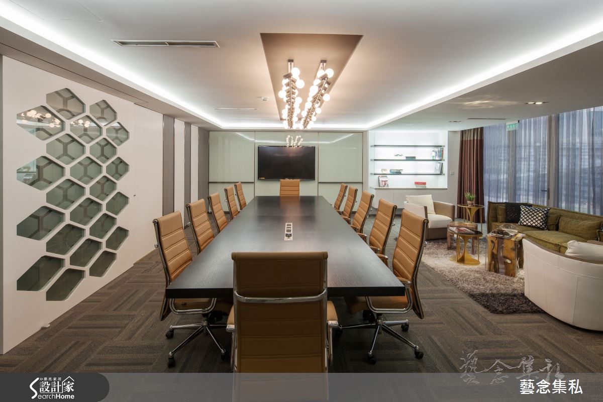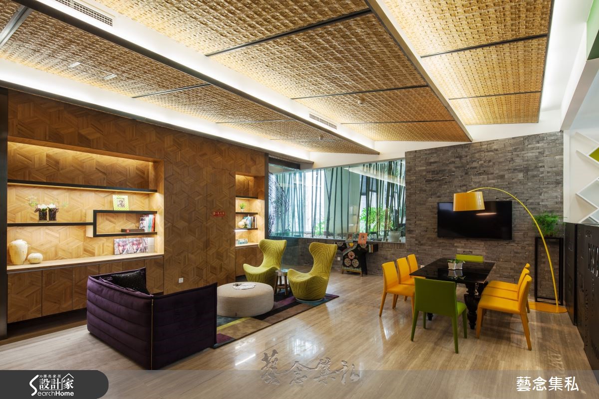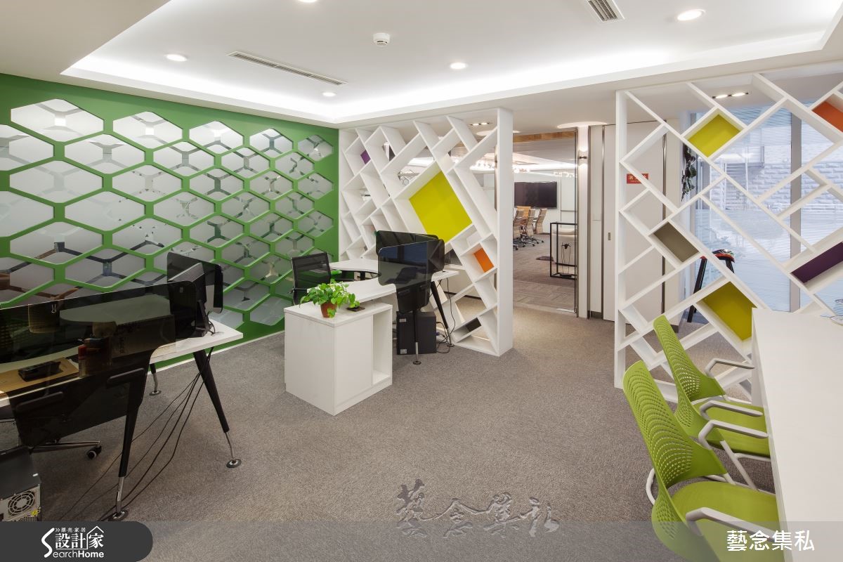 此间超过四百平方米的写字楼空间该如何完美设计与搭配,才能降低大坪数的冰冷感呢?设计师选择擅长的混搭风手法,利用各式媒材的层次堆叠,完整地展现出材质的特色与朝气。【层次混搭,创造大器艺术氛围】接待处用铜色的矩形铁件拼贴出磅礡气势感,让接待大厅为宾客创造出雄伟壮大;用竹片构成的天花板,以层递的手法赋予具有层次感的印象,用特殊窑烧砖块砌成的砖墙,每块砖的纹路与色泽都代表着具有艺术质感的调性,透过每一块砖酝酿出丰富的人文底蕴。【跳色家具提升空间活力意象】等候区运用大量跳色家具营造出活力气氛;收纳书柜透过层板打造出菱形造型意象,再佐以色块诠释出完美的和谐比例;写字楼空间则以白打底再添加撞色系,营造出愉快活泼的空间气息;大会议室则以沉稳的褐搭配黑形塑出静谧的舒适感,符合会议时的沉淀意象。