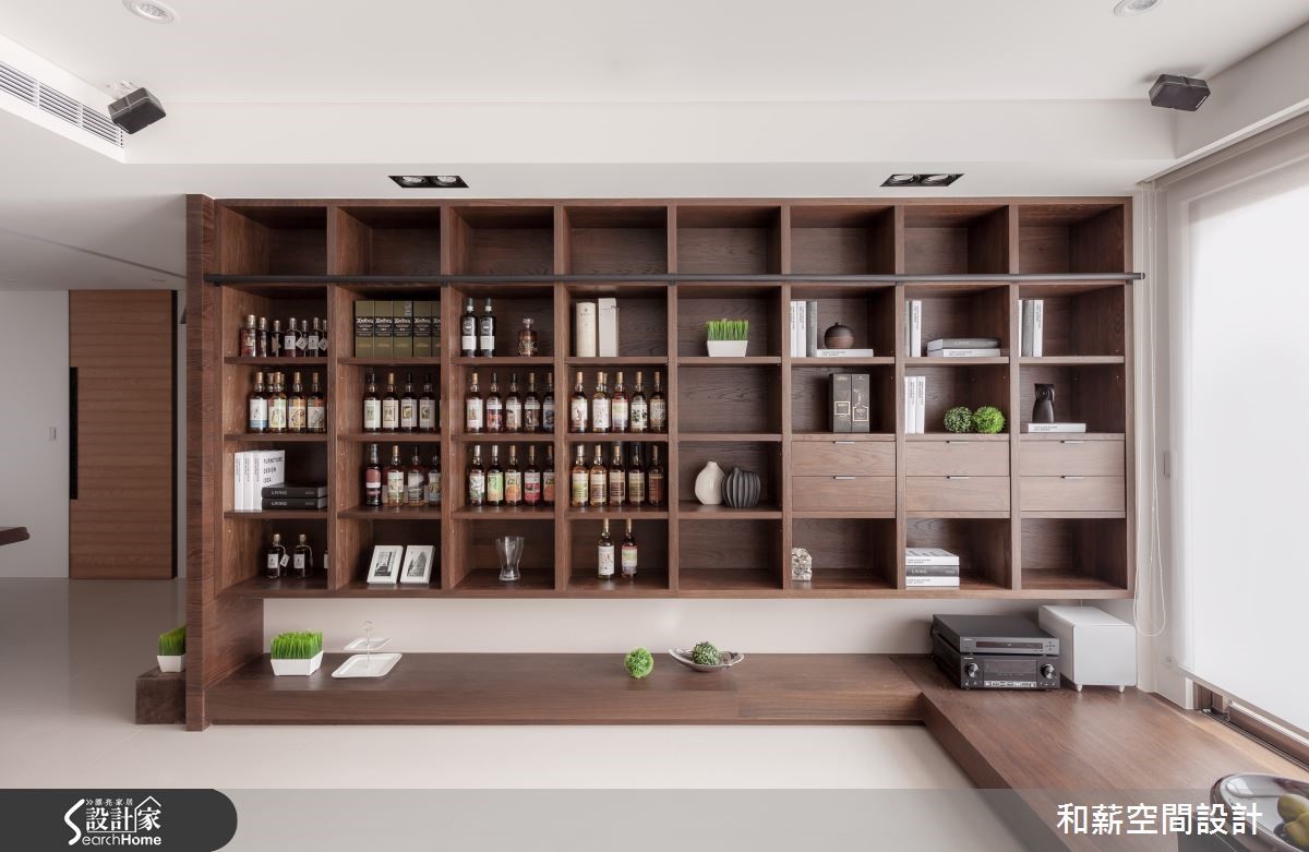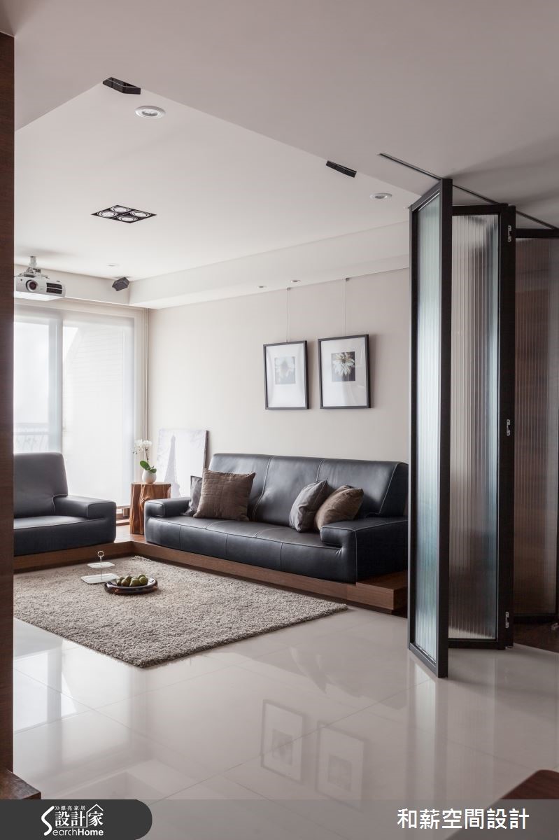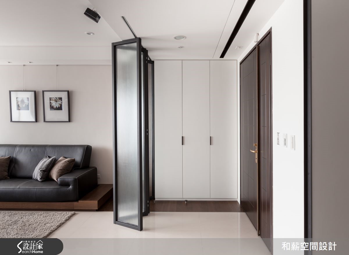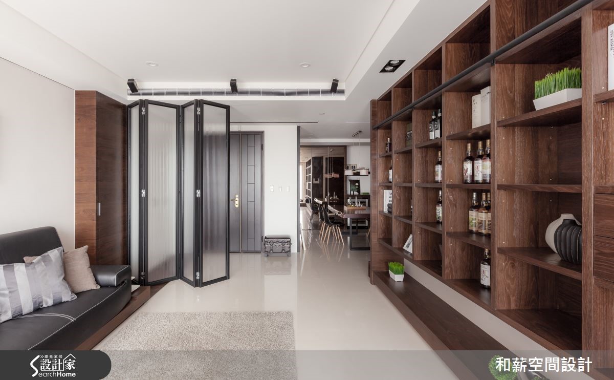 屋主是一對恩愛的夫妻加上育有一位可愛的小女兒,父母親偶爾會在新家一起過夜,享受三代同堂的天倫之樂。为了让全家人回到家后可以拥有更多团聚以及增加情感的时间,设计师该如何符合屋主的期待呢?【书墙取代电视,凝聚家人情感】从玄关处进入,运用黑色铁架搭配雾玻璃所打造的活动折门,作为入门屏风使用,可以随意开阖,还原开阔空间。由于屋主将投影布幕设定在大门前方,如有观看影片需求时,可将折门收起增加投影时的距离,便可观看到较大的屏幕,可说是便利的设计。客厅注入明亮采光,铺满了温暖的调性。以书墙取代电视墙,加强家人互动增加情感。同时除了收纳书籍外,也珍藏了屋主收集的Whisky;厚实的餐桌为用餐区构成简约具有质感的空间,开放式的设计让动线显得更加顺畅。主卧延续简约的设计主轴,利落的线条刻画出的温馨居室。在卫浴空间中,屋主利用父亲收藏30年的台湾桧木注入空间设计之中,不仅丰饶了空间的质感,同时也别具传承的意义。