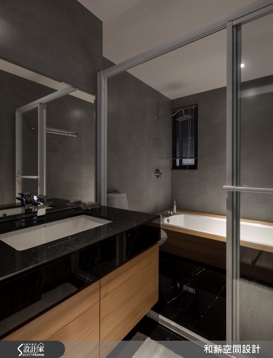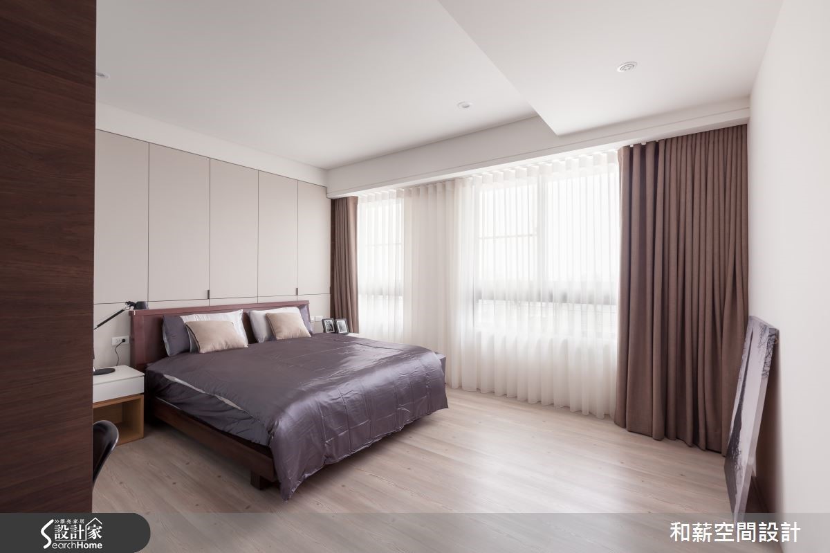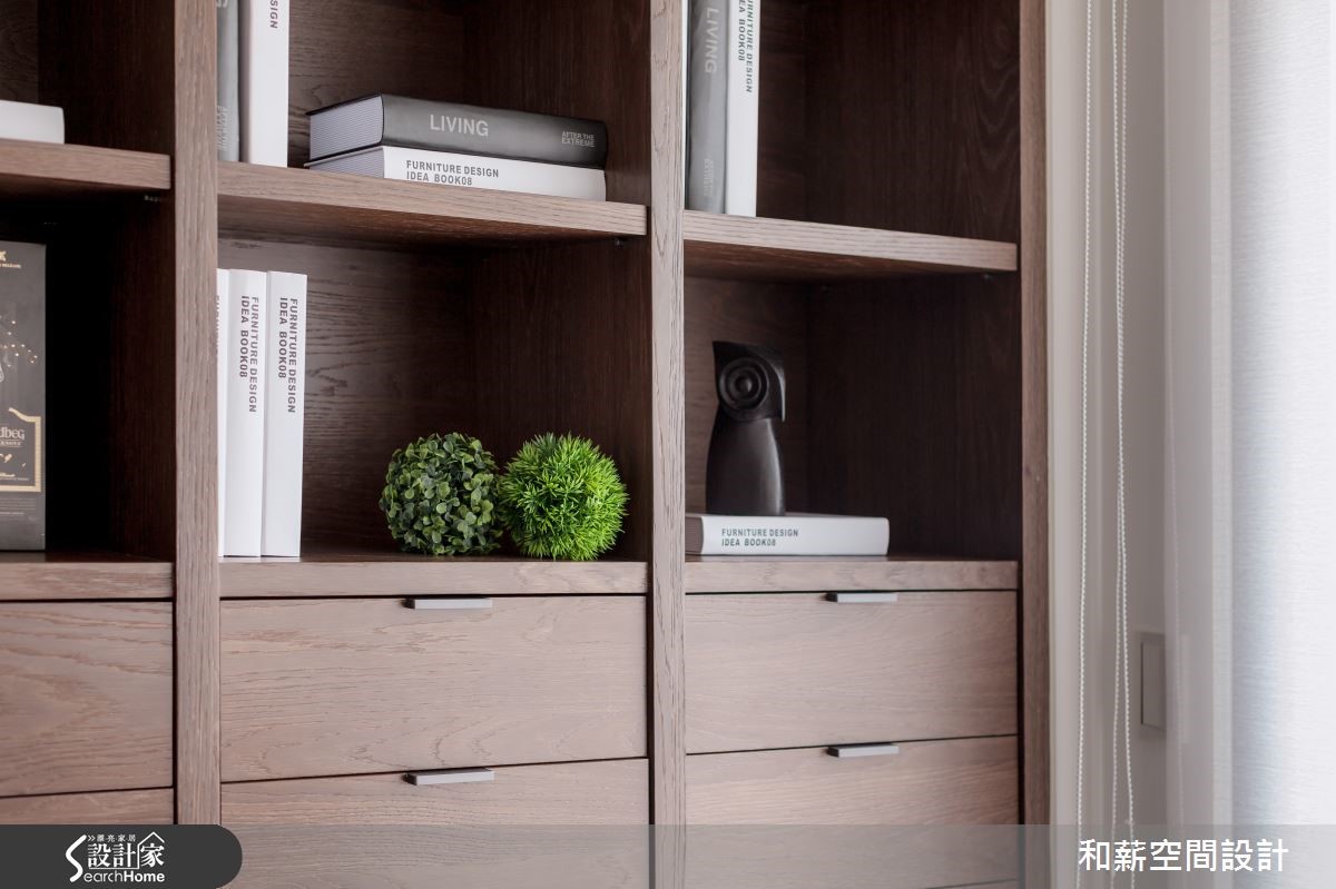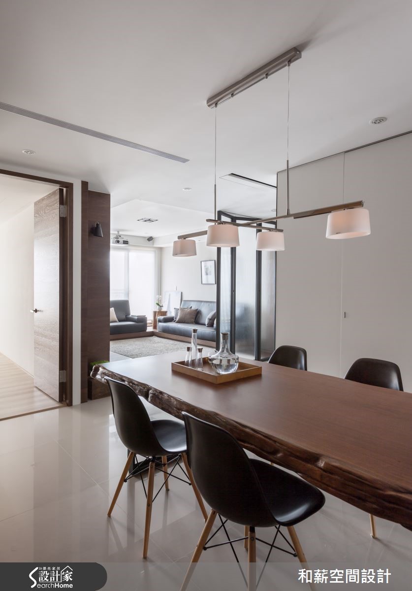 屋主是一對恩愛的夫妻加上育有一位可愛的小女兒,父母親偶爾會在新家一起過夜,享受三代同堂的天倫之樂。为了让全家人回到家后可以拥有更多团聚以及增加情感的时间,设计师该如何符合屋主的期待呢?【书墙取代电视,凝聚家人情感】从玄关处进入,运用黑色铁架搭配雾玻璃所打造的活动折门,作为入门屏风使用,可以随意开阖,还原开阔空间。由于屋主将投影布幕设定在大门前方,如有观看影片需求时,可将折门收起增加投影时的距离,便可观看到较大的屏幕,可说是便利的设计。客厅注入明亮采光,铺满了温暖的调性。以书墙取代电视墙,加强家人互动增加情感。同时除了收纳书籍外,也珍藏了屋主收集的Whisky;厚实的餐桌为用餐区构成简约具有质感的空间,开放式的设计让动线显得更加顺畅。主卧延续简约的设计主轴,利落的线条刻画出的温馨居室。在卫浴空间中,屋主利用父亲收藏30年的台湾桧木注入空间设计之中,不仅丰饶了空间的质感,同时也别具传承的意义。