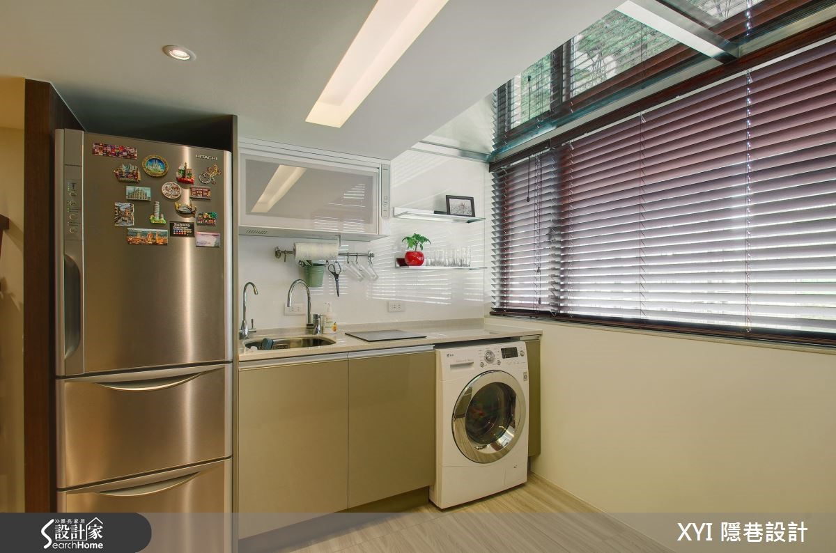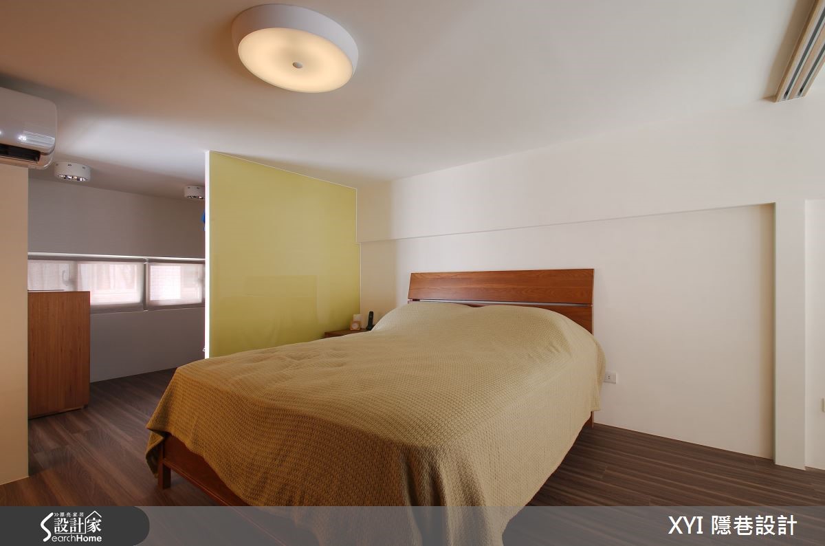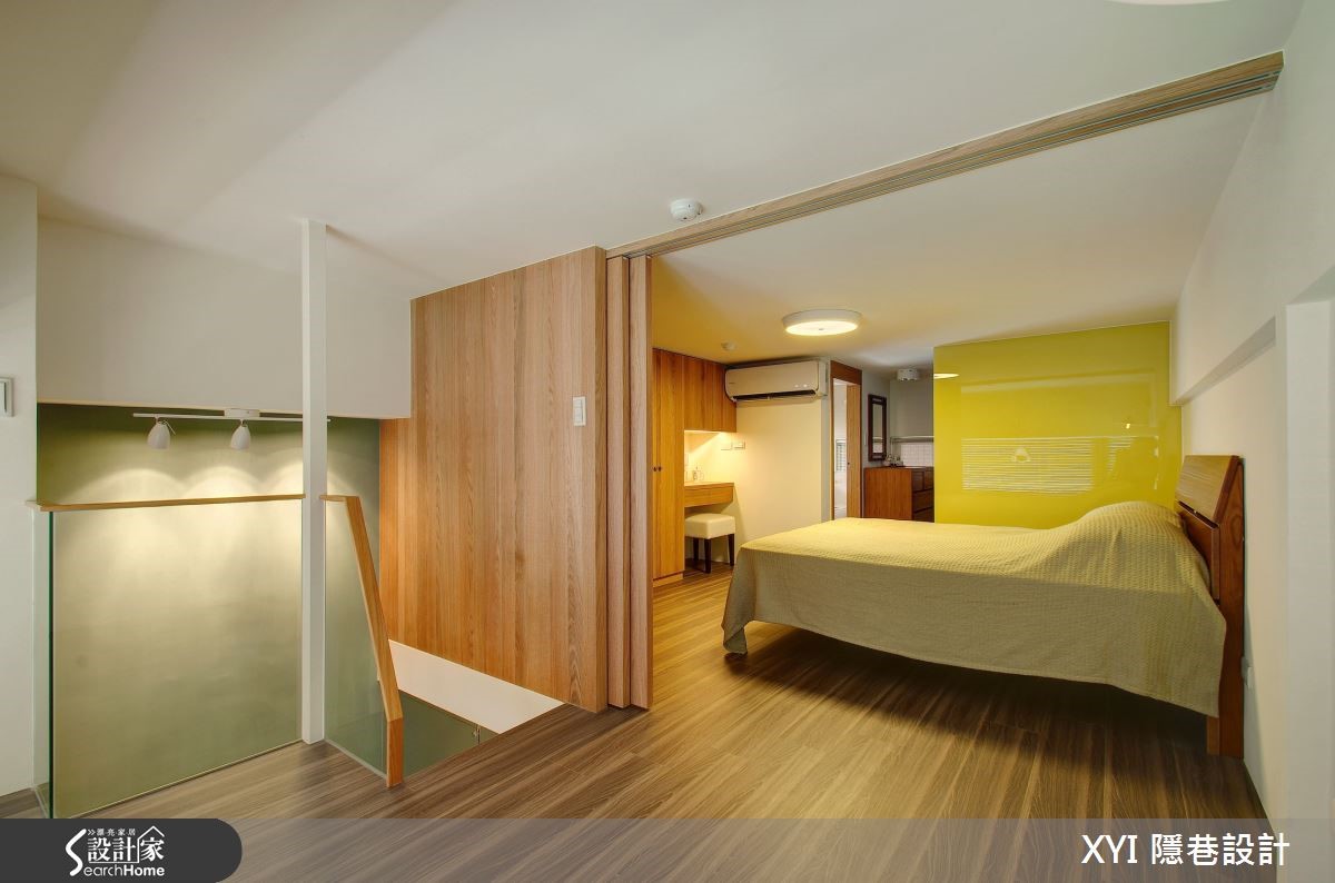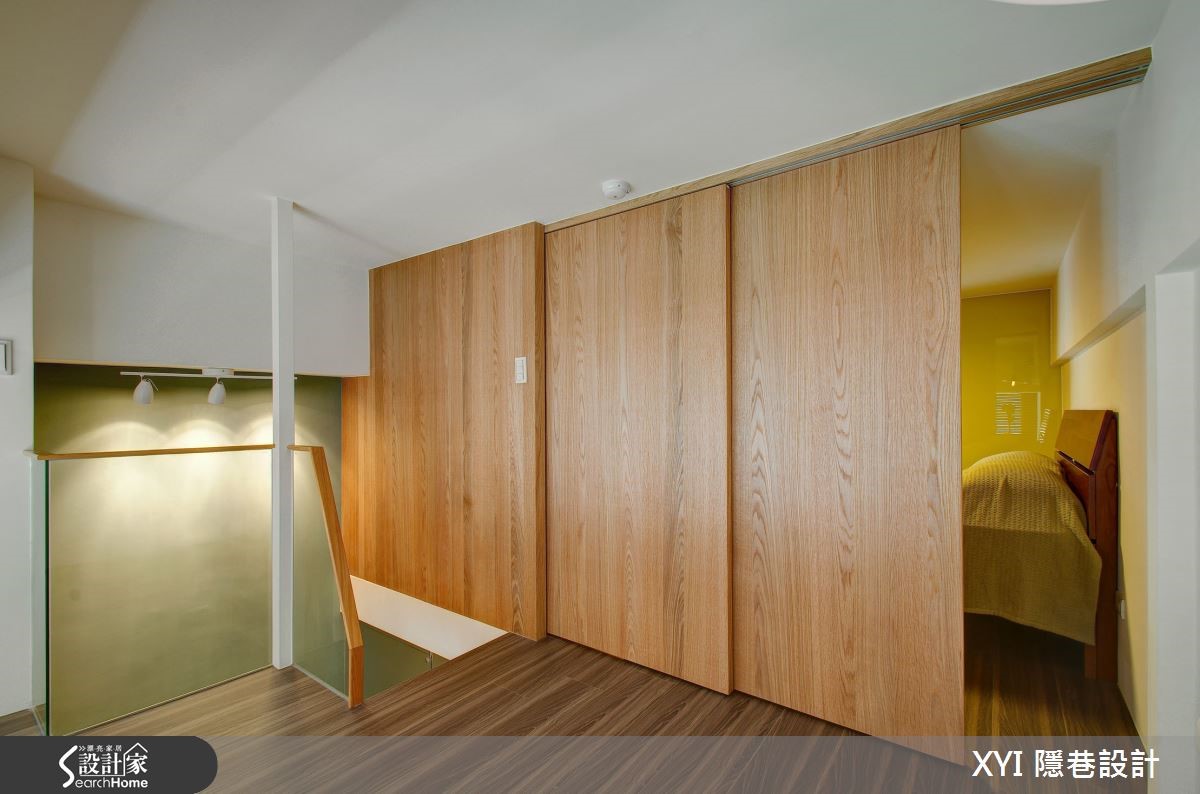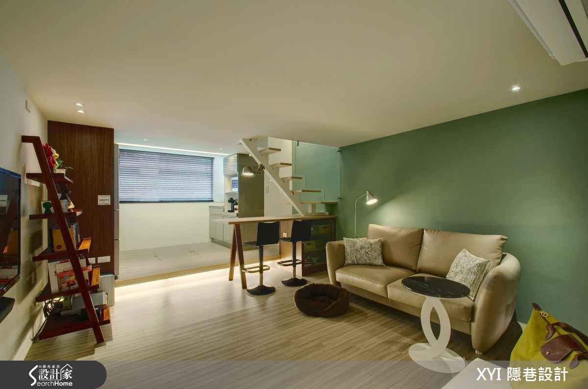这户62平方米的小户型,原先的屋况缺乏明亮的采光,加上楼梯的设计位置不合理,造成空间拥挤且视觉显得过于凌乱,完全浪费掉这挑高空间应该有的样貌。一起来看看设计师如何将二手房改头换面。【跃层区分公私领域,高效使用】设计师为了让屋况的优势完整呈现,将格局重整,调整楼板高度更符合人体工学;并利用4.2米的层高优势规划跃层,一楼作为公共空间使用,二楼追私领域。浅色系的薄荷绿作为主墙设计并延伸至二楼,全室利用梧桐木板散发的温润感,注入舒适氛围。客厅、餐厅、厨房采开放式的空间设计,不刻意以隔断区隔,反倒让视野更加开放、动线更顺畅。电视主墙一面净白让视觉更显放大,摆上一座梯子造型的收纳隔板设计,点缀了墙面上的设计。整面的挑高采光引入了厨房空间进而连结到全室,缔造出舒适暖调的空间意象;连结往二楼空间的楼梯,延伸木板媒材作为吧台区的使用,不仅可作为用餐区、阅读区,透过主体楼梯的延伸,既能创造出更多生活机能的使用。通往二楼为私密空间,弹性的推拉门让屋主更保有隐私及空间感,相较一楼浅色的木质运用,二楼改为较为深色的木地板作为主要意象,沉稳的空间调性让休憩时更能感受到静心、放松;特别的是在这空间,设计师规划出两间卫生间,创造出贴心的生活需求。