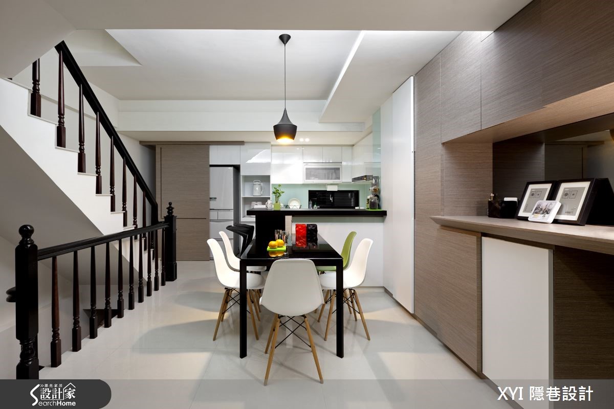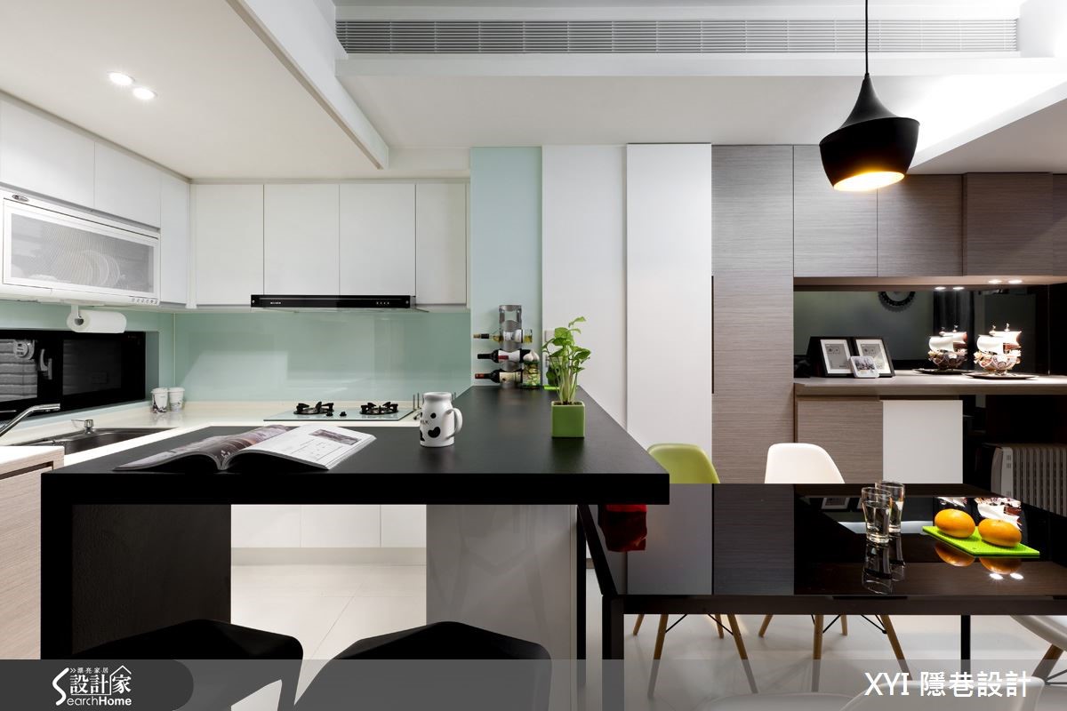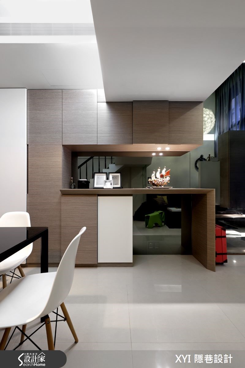 112平方米的独栋楼,依照屋主夫妻的喜好及生活特性打造;设计师微调格局,扩增收纳空间,并以黑白色系为主色,推翻了一般的制式设计,打造出三室三厅的温馨居家。【善用灰镜,造利落质感】以半高电视墙区隔出玄关及客厅,虽然客厅空间变小了,但有了玄关,就多了一道隐私,且原先挑高的客厅也不会影响到宽阔感。玄关的建立还因此产生收纳空间,让进门的屋主还可以先卸下外衣与其他物品。在一楼的公共空间,设计师采开放式设计,客厅、餐厅与厨房相互连结,展现宽敞的视野与争取更多的使用动线;挑高的客厅空间,选用时尚黑与明亮白作为整体的家具用色,展现出现代简洁的氛围。来到餐厨空间,选用时尚吧台作为自然的交界,也提供屋主多了工作区的使用。在一楼空间因两侧的墙面上有结构梁,因此设计师选用较多的灰镜设计,消弭了线条凌乱的感觉,还给空间利落的表情。二楼空间挑高的高度有限制,因此空间较小,设计师将此空间作为书房及客房的使用,为了展现穿透感,拆除原本的隔断以透明玻璃代替,同时让采光可以进到楼梯间的位置,书房一字形的书桌搭配多功能收纳的柜体提供使用,温润的家具配色缔造了沉稳感。