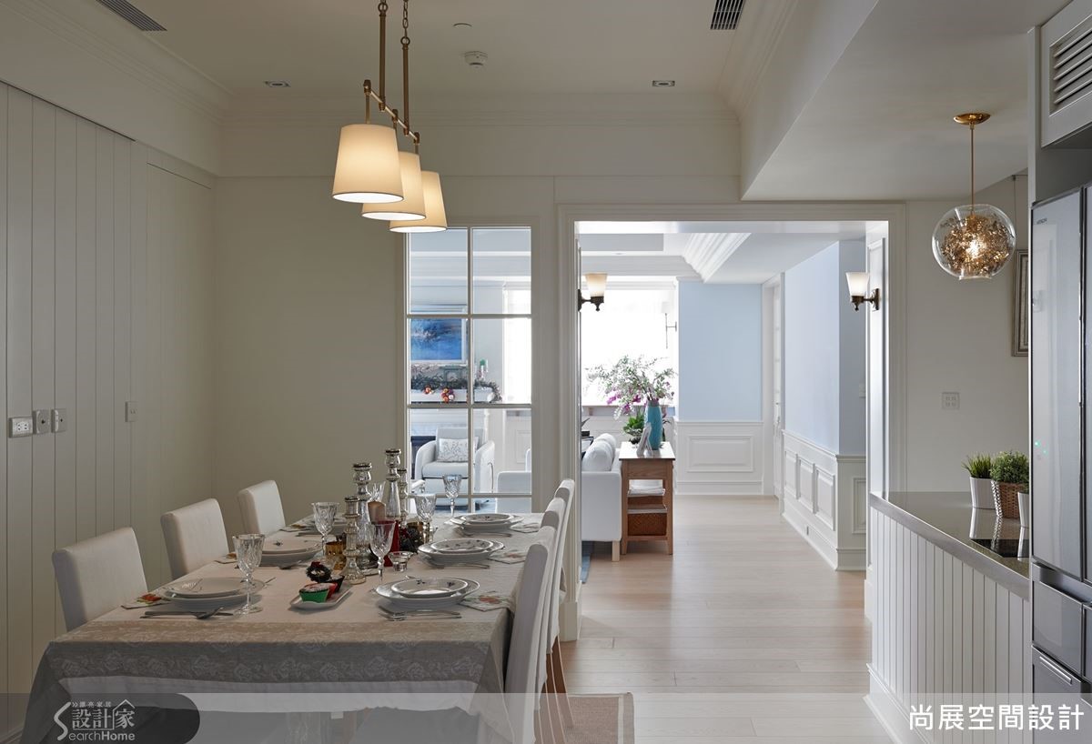 呼应汉普顿风格的度假调性,特别设计吧台,打造开放餐厨的悠闲情境。同时也另辟可独立区隔的热炒厨房,顾及屋主大火快炒的习惯。融合中西风格的混搭设计,在风格营造中仍能兼顾使用习惯。