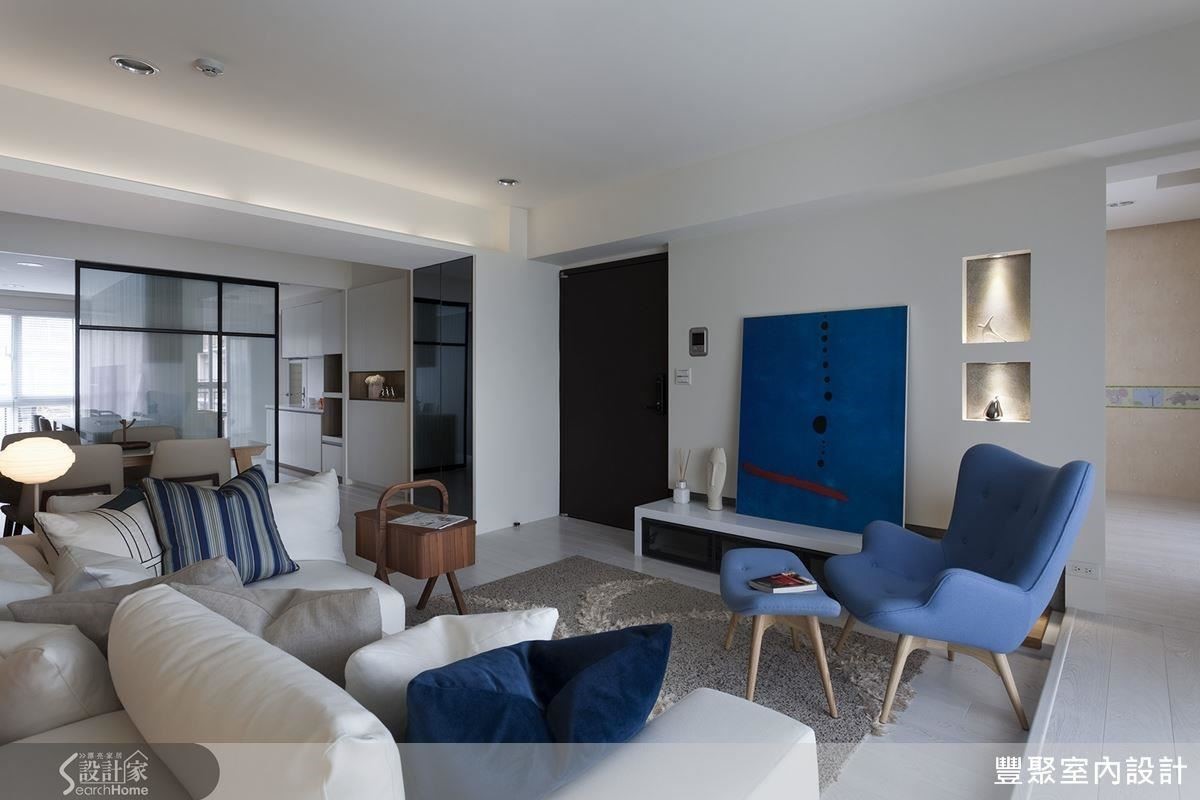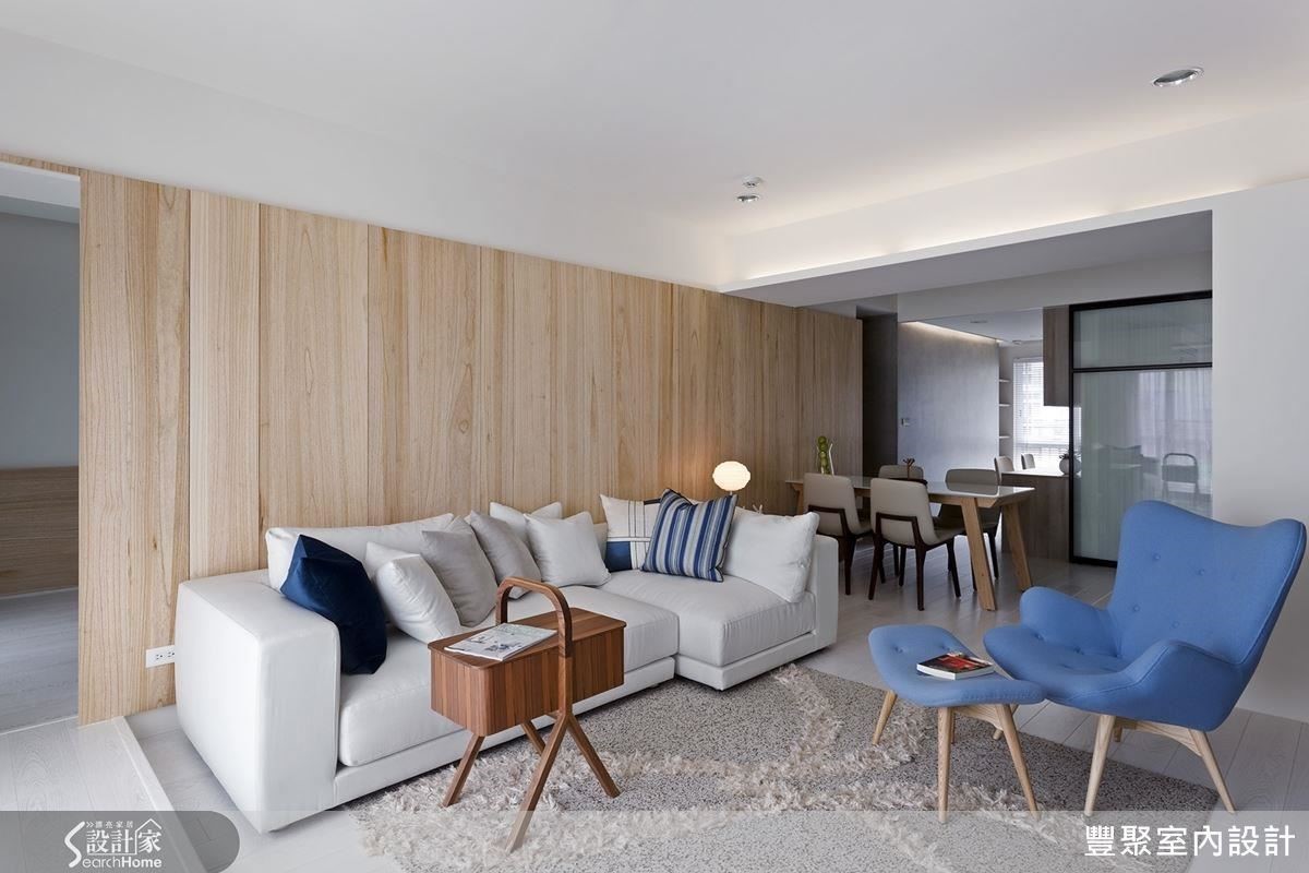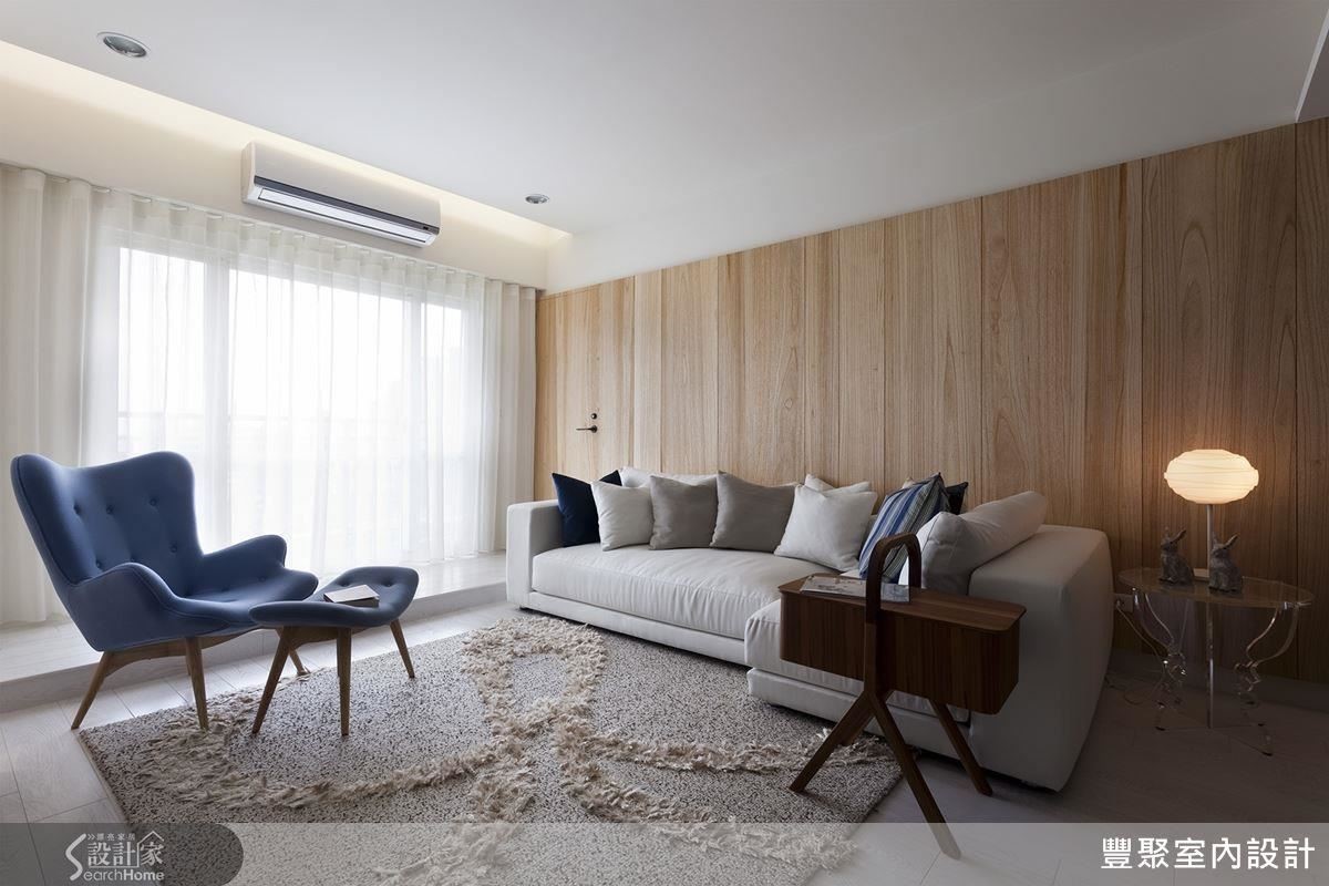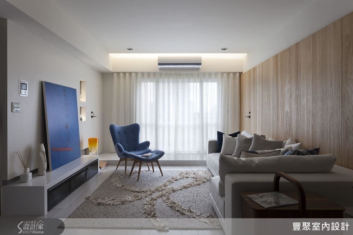 客厅的格局无法变更,因此设计师以屋主偏好的浅色梧桐木皮搭配白色墙面,打造明亮简洁的空间感,再以蓝色的单椅及抱枕,注入活泼跳脱的气氛;另将收纳设置在不明显的地方,维持公共领域的整体感。