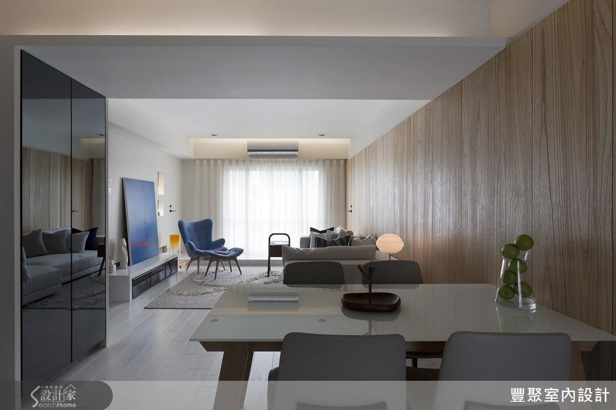 其次,采用开放式格局,将原本面对餐厅的卫生间入口转换方向,再规划餐厅场域;如此,客餐厅合一的格局,增加了宽敞度,梧桐木皮的沙发背墙一路延伸至此,再次强化了空间纵深。