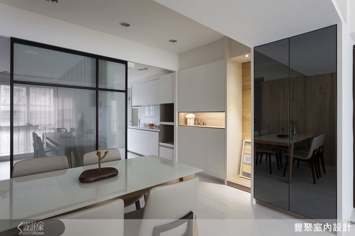 从设计师的观点来看,开放式设计并不只是把格局全部打开,比如书房及厨房就共享一道由铁件、玻璃打造的活动拉门,发挥光线及动线都能穿透的优点,当书房需要安静或厨房要避免油烟时,也能灵活运用。