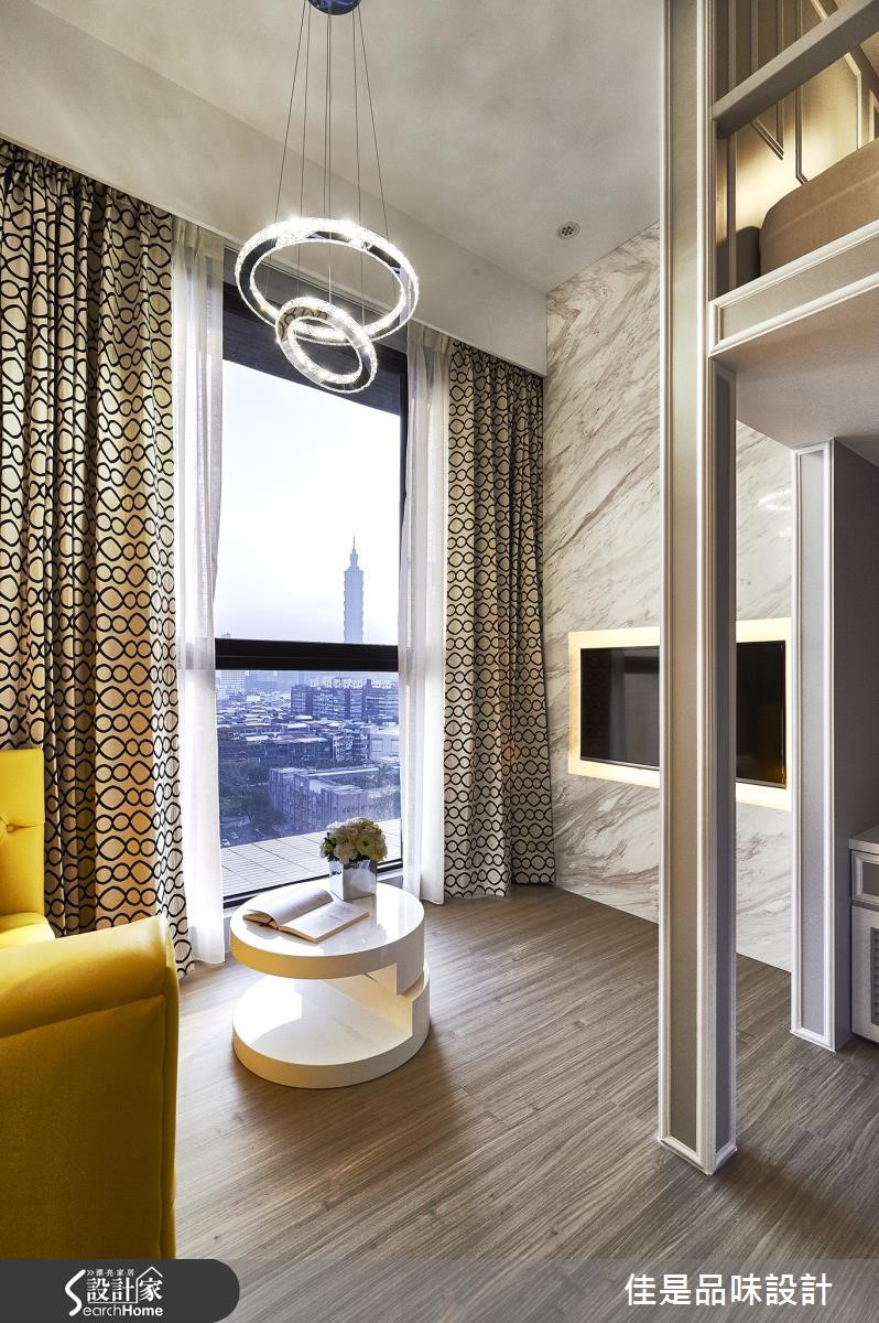 26平方米小户型,在设计师的魔法巧思下,变身成令人惊艳的奢华感空间。在这个案例中,屋主原本期望可将空间注入酒店思维,便于用来出租,但在完工后,却让屋主惊喜不已,变成了自住小宅。快让我们一起走进看看吧! 【大理石电视墙,诠释奢华气质】26平方米空间中,全室以灰、白、黄为基调,将一楼作为客厅空间与寝卧空间,空间中的梳妆台则是书桌兼吧台,同时将收纳机能与镜子隐于台面底下。并在一楼的床旁规划阶梯,便多了一处休憩的跃层空间,满足日常所需。而客厅则位于采光明亮的区域,以落地窗引进景观与光线,搭配银狐大理石电视墙、黄色沙发、时尚吊灯等,打造俐落的迎宾领域。而设计师将卫浴空间设定在入口处,配置落地窗,打造明亮的环境。