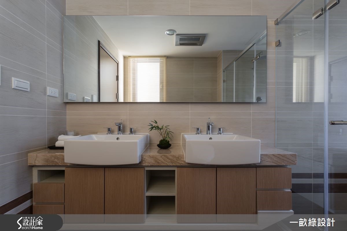 本身拥有132平方米的空间,设计师微调室内格局,再依色彩与动线安排;不仅突显空间开阔感,也同时保有家的温暖与清爽;另以颜色配搭木作的技法,营造出带有森林感的清新,烘托出舒适又疗愈的气息。【全室开放,重现空间广度】整体空间规画客厅、餐厅、厨房与书房的开放空间,设计师特别在玄关及厨房,纳入了悬浮吊柜,一方面增加空间的收纳优点,同时一举解决直见客厅,又或是看到厨房锅具等恼人情形,并为空间增添视觉的变化性。 沙发后方则是餐厅,木色桌椅呼应以木质为主的元素,设计师利用搁板打造出书柜墙,让餐桌也兼具书房功能。黑白色系混搭出的厨房空间,视觉对比的时尚效果,配搭上中岛吧台及亮眼橘高脚椅,提供屋主夫妻享有浪漫的小酌时光。 主卧透过格局调整后,增加了一个储藏室及更衣室,有效提升空间机能。卫浴采用双面盆的设计,家人同时使用不干扰;并采用干湿分离,以及淋浴泡澡两用的贴心设计,打造机能与颜值兼具的空间。