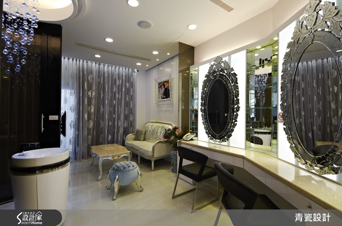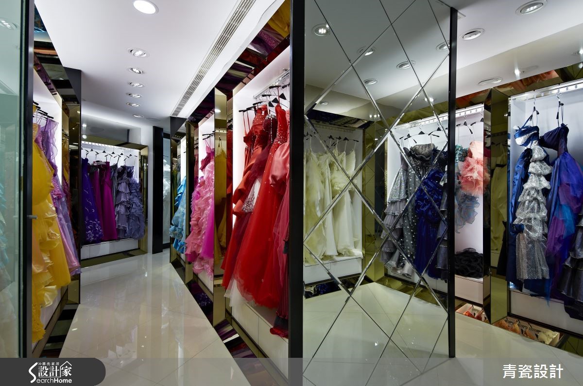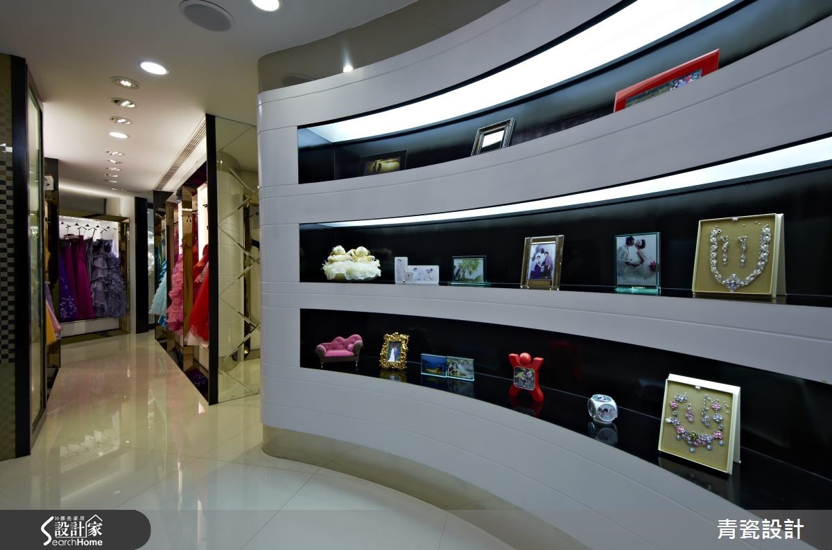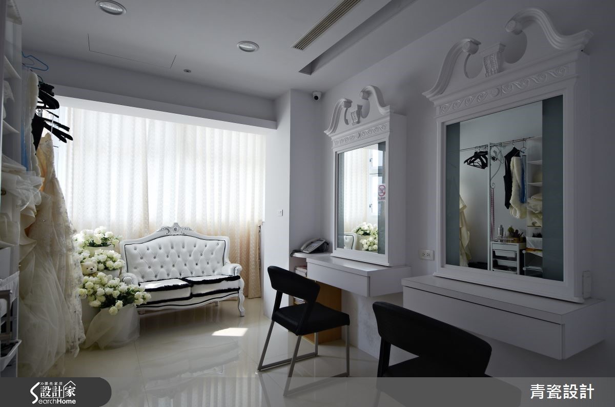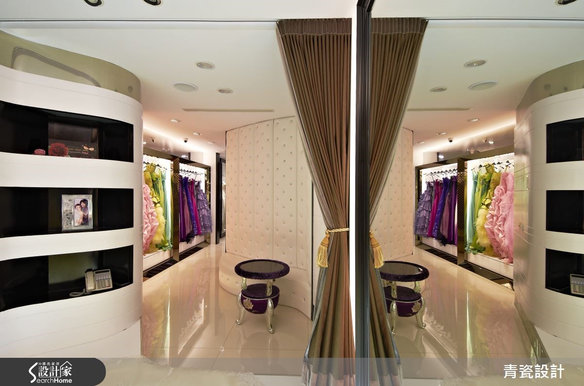 这是由青瓷设计团队所规划的婚纱店,拥有694平方米的宽敞空间。藉由设计团队的丰富经验与敏锐美感,并注入轻奢材质,创造出能完美衬托婚纱浪漫之美的优雅质感。【古典家具点缀,造浪漫氛围】这间婚纱中心中,为了让贵宾能拥有精采难忘的婚纱服务,特别请到青瓷设计团队来规划694平方米的独栋空间。推开大门,映入眼帘的是以独特几何造型打造而成的摄影展示平台以及接待柜台,展现出年轻而活泼的现代美感。一旁的等候区则搭配了质量细腻的古典沙发,让来访的宾客能在舒适优雅的环境中等待,浪漫典雅的氛围轻轻围绕,幸福指数更加提升!婚纱区则安排充足的开放式衣柜,让准新娘可以尽情挑选与试穿。衣柜连身镜以菱形切割纹理打造,勾勒出精致美感。试衣区更精心规划为如舞台般的形式,让准新娘可以尽情享受如舞台秀般的试衣时光。而为了提升整体空间的奢华美感,设计团队大量运用象征古典意象的线板来创造视觉效果,并且搭配各式华丽的水晶灯饰,点亮美感飨宴。